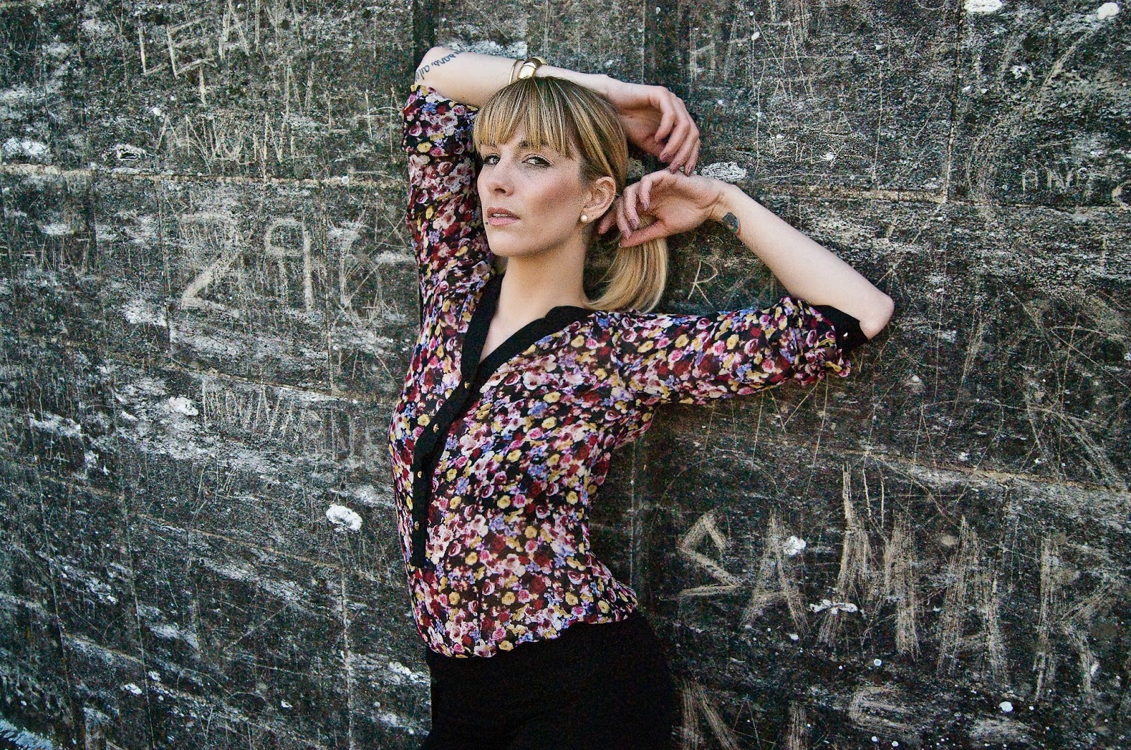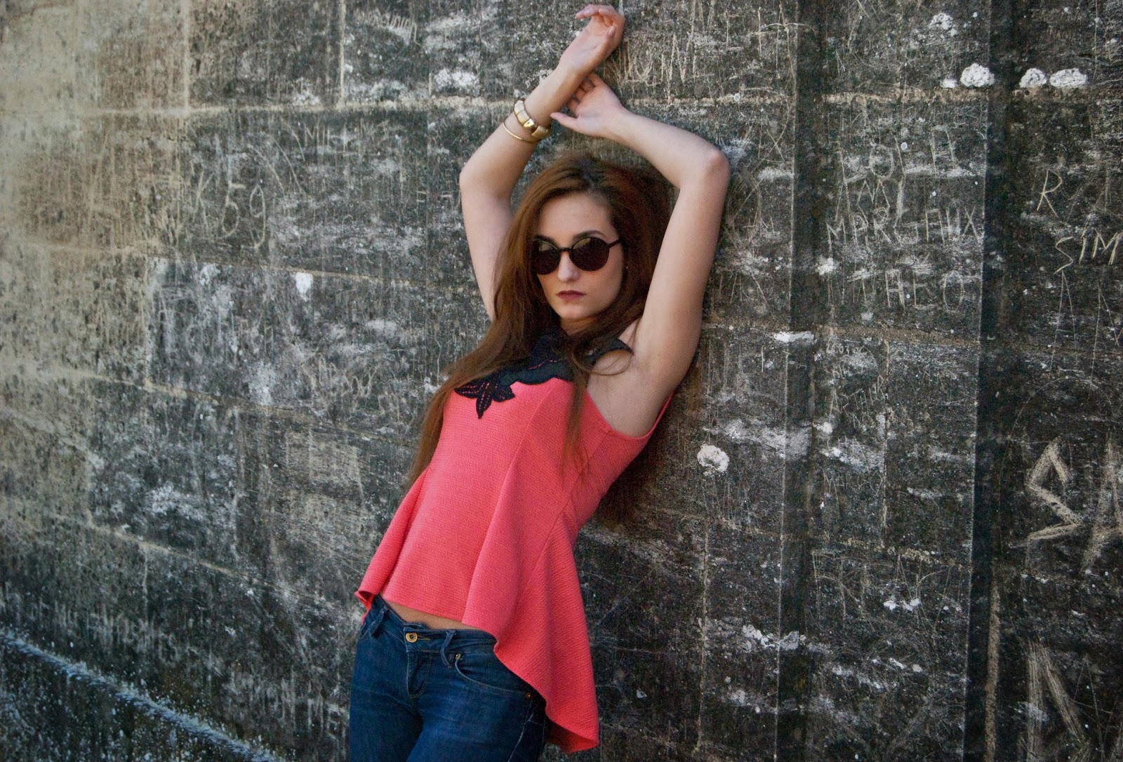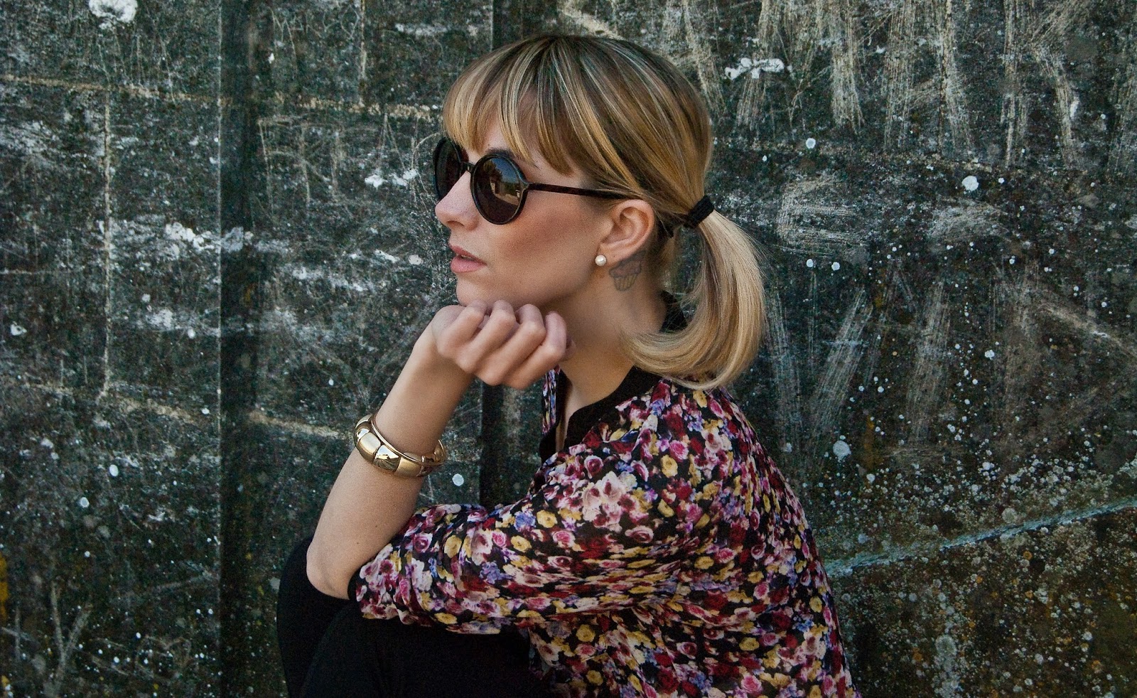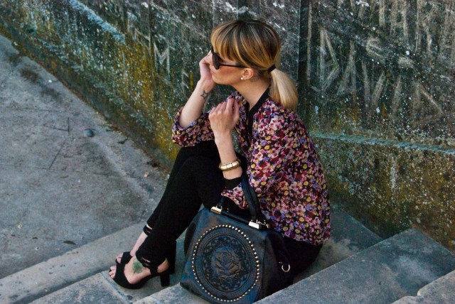 Pour ma part, je porte un chemisier fleurie légèrement transparent trouvé en Friperie,