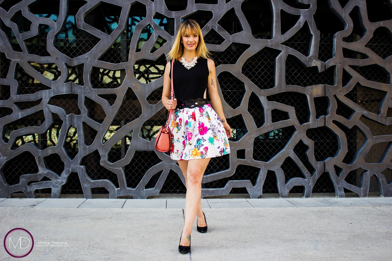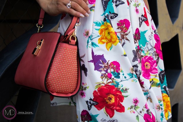 qui se compose d’une robe noire et imprimée fleuris , d’un Sac City-Bag Rose
