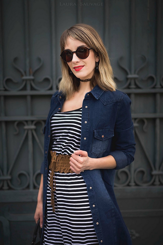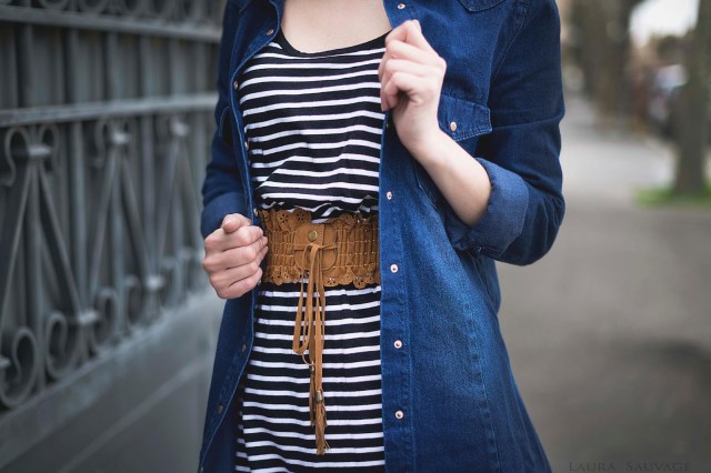 Pour cette tenue, c’est choisie cette petite robe à rayures et une ceinture camel,