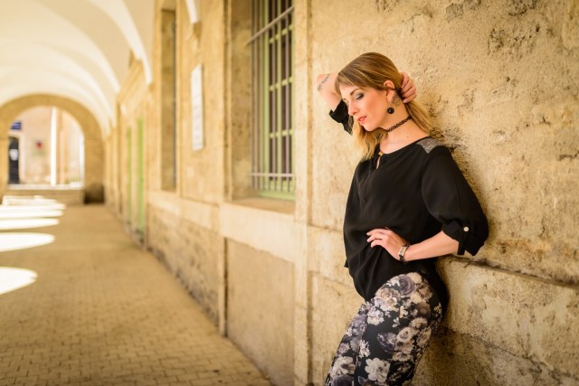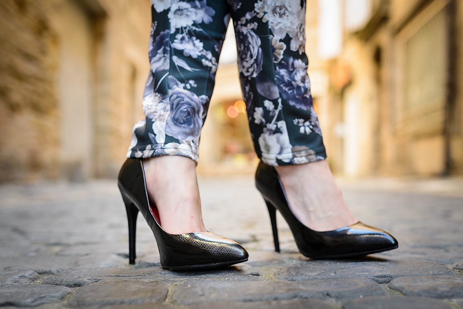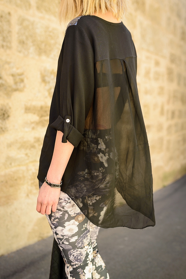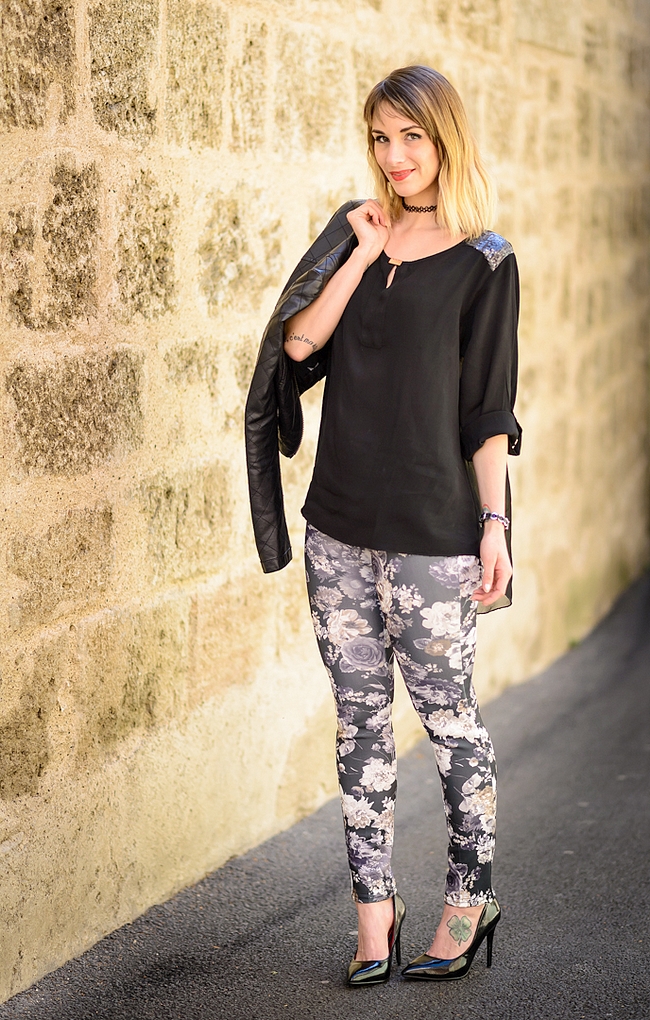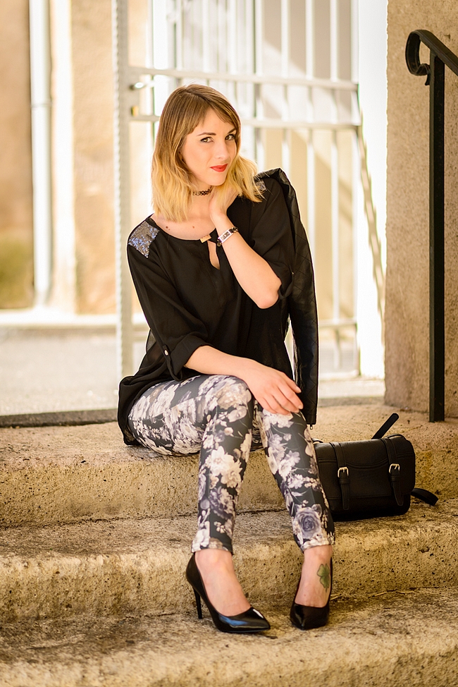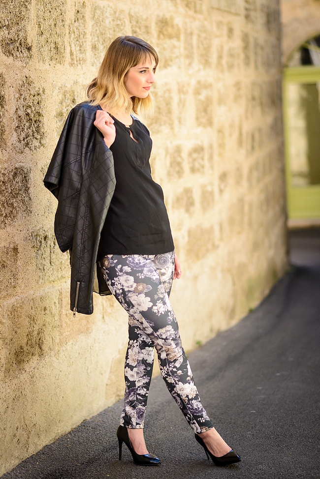 # Coucou les amis! Ce matin je reviens avec un nouveau LOOK sur le blog, on peut dire que vous êtes gâté de ce côté là en ce moment ! J’ai profité de mon weekend de Pâques pour filer du côté de Pézenas chez mon ami Frédéric (Souvenez-vous de lui ICI ) afin de changer un peu d’air. Et quelle belle ville, une magnifique découverte ! La ville de Molière ! Située tout prêt de Montpellier, en Hérault, Pézenas est une ville authentique bourrée de charme et d’histoire. J’ai adoré me promener dans le centre historique qui accueille de nombreux métiers d’art, artisans locaux, sculpteurs, artistes, expositions etc. L’architecture est vraiment belle, on y découvre de nombreux hôtels particuliers , les toits et les ferronneries méritent une attention particulière. Le cours Jean-Jaurès (anciennement cours Molière) permet d’admirer les façades bâties sur les anciens remparts médiévaux. (source : Wikipédia) Pour en venir à ma tenue ! Je n’ai pas choisi la facilité ce jour là , en optant pour des talons aiguilles dans les vieilles-rues pavées, heureusement j’ai toujours une paire de ballerine dans mon sac à main! Je portais sur moi un legging fleuri trouvé chez Calzedonia et une blouse en mousseline , dont j’adore la matière, vraiment légère et le jeu de transparence du tissu ! Une petite veste en cuir pour finir, parce que même si le printemps est là et que nous avons de belles températures, les fins d’après-midi restent douces! J’espère que vous aimerez ces photos, je remercie encore mon ami Fred pour son boulot ainsi que cette belle balade, vraiment sympa !!! @ Trés vite les amis !! xxx
