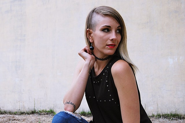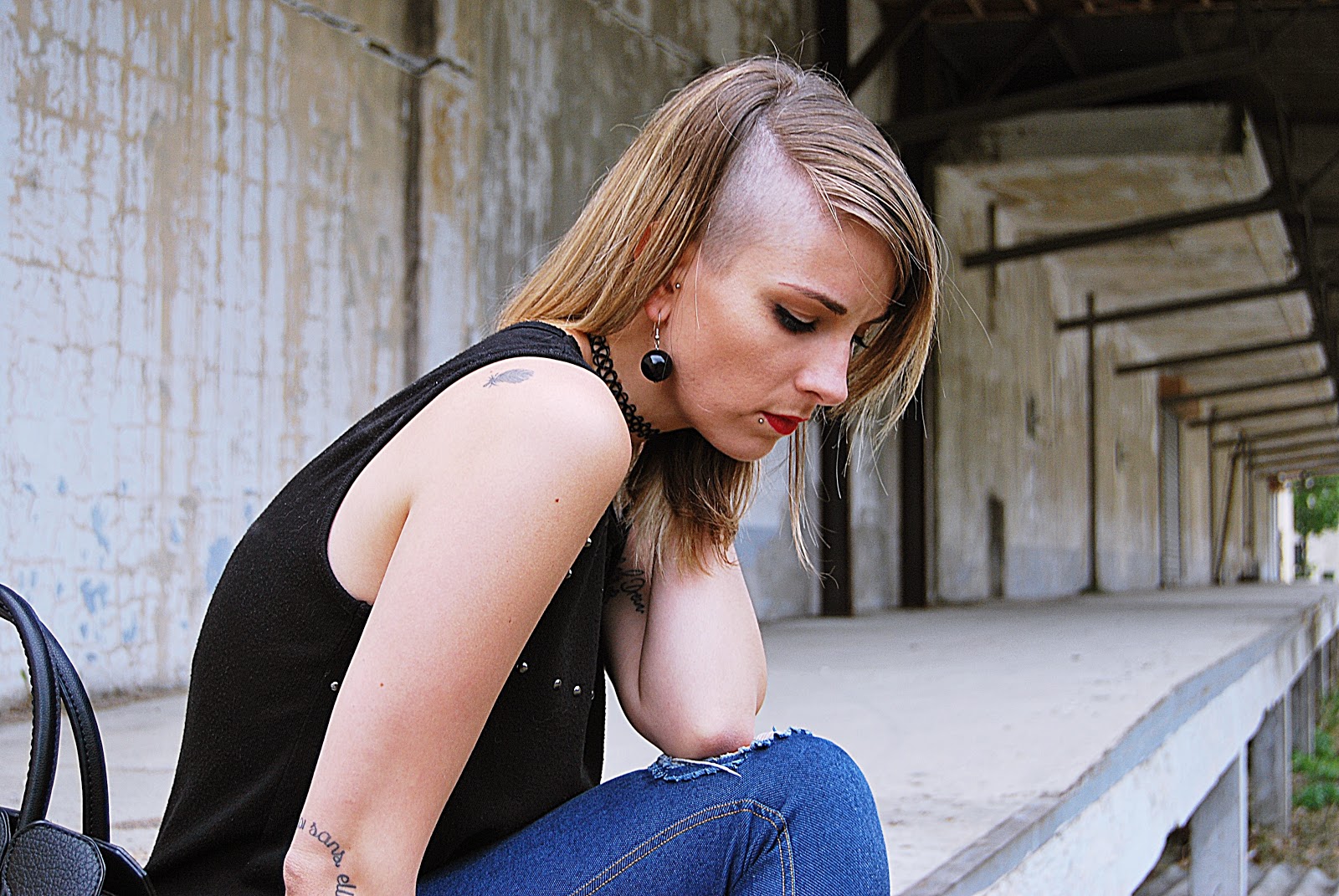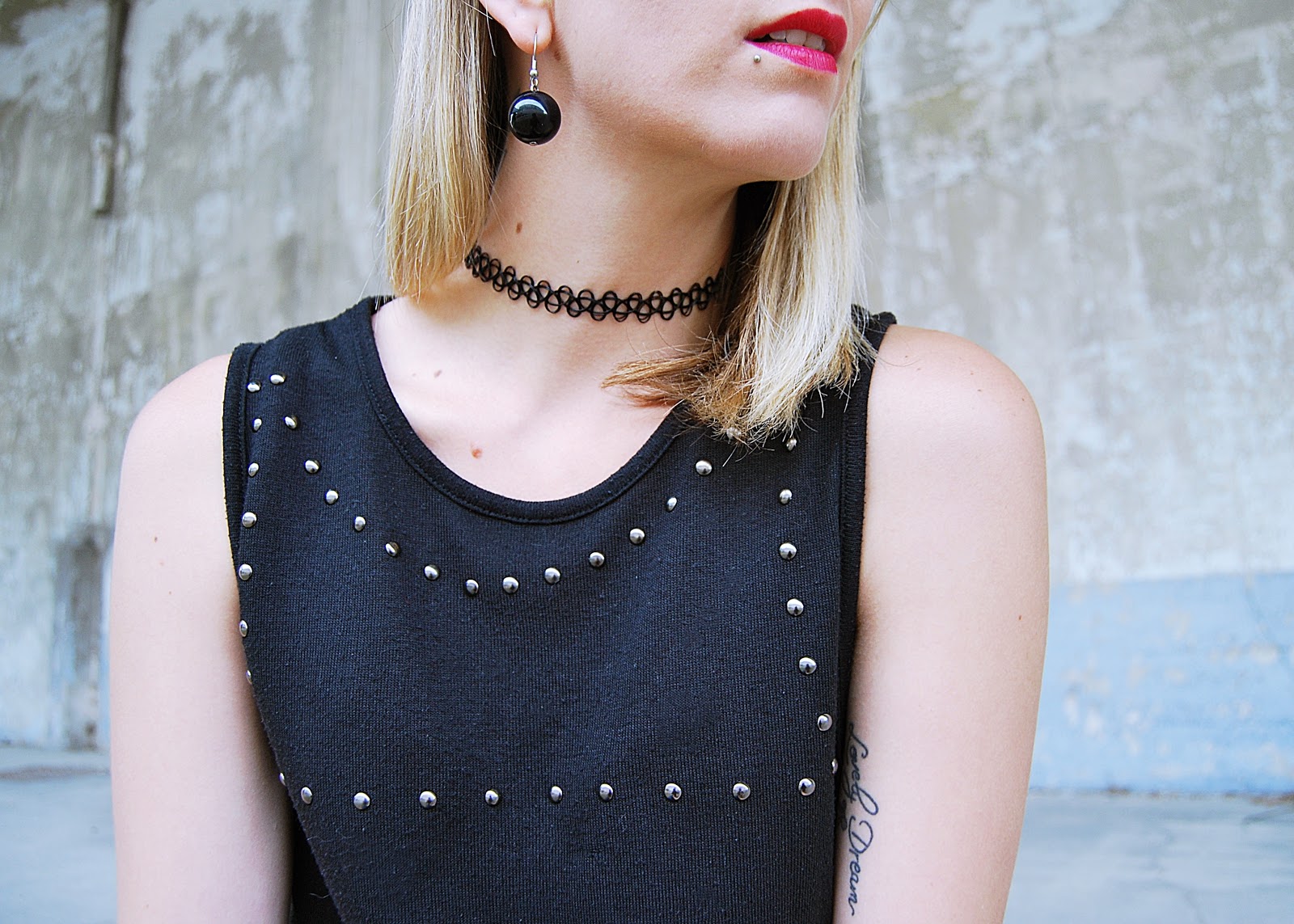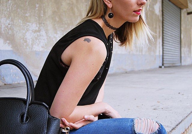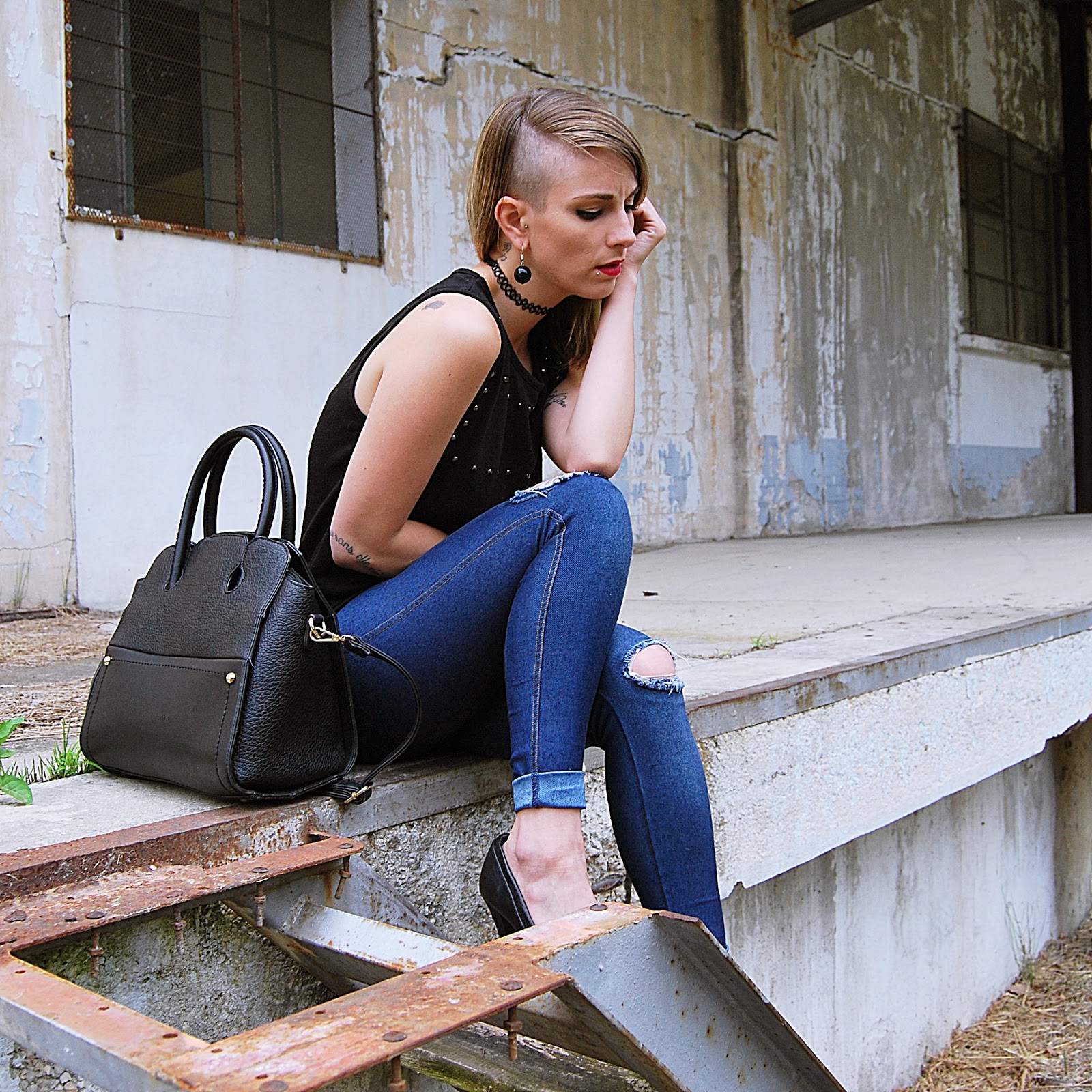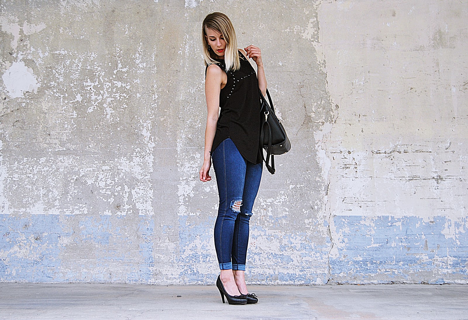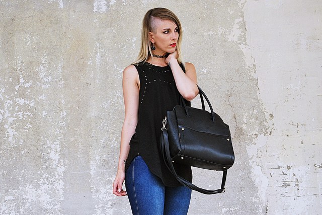 un débardeur assez long clouté sur la poitrine, une jolie paire d’escarpins, mon City-Bag
