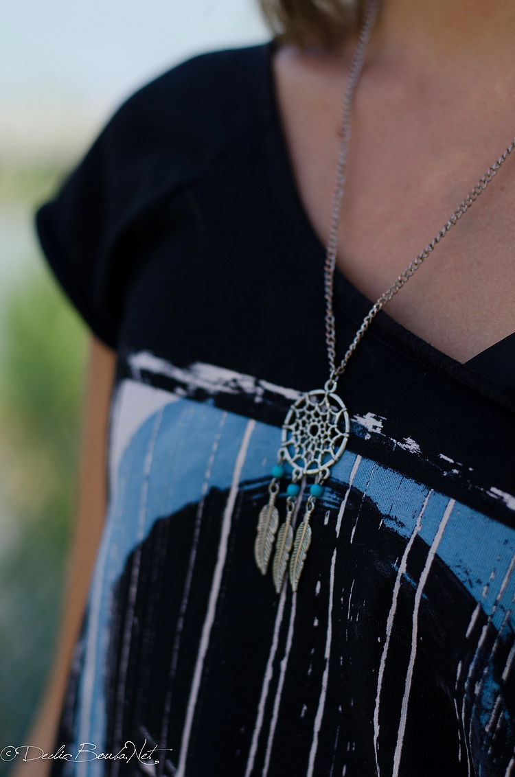 un tee-shirt imprimé dont j’adore la coupe asymétrique et mes sandales à lacets.