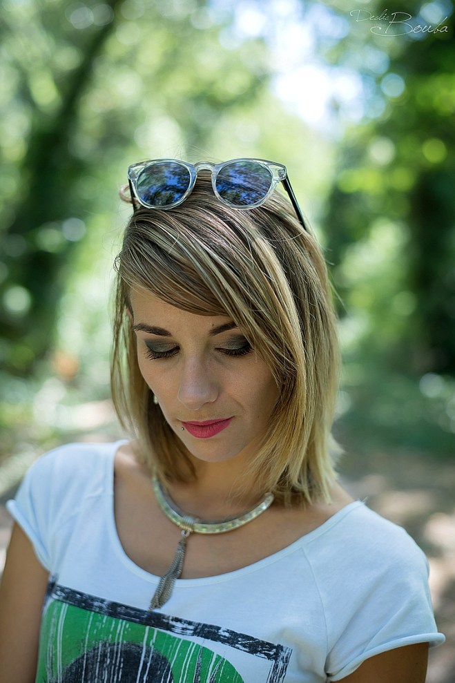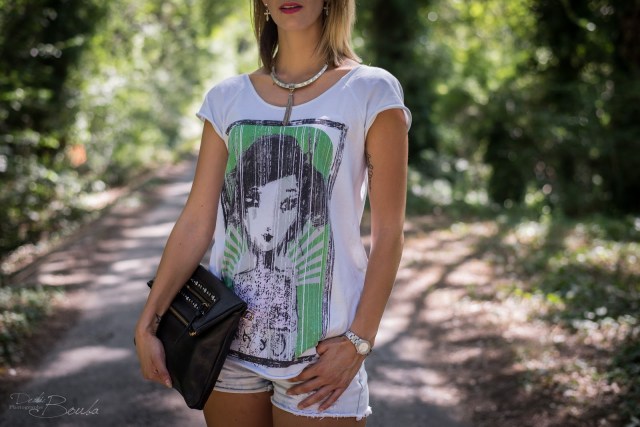 # Hello les filles ! Alors cette reprise, pas trop dure ? La rentrée c’est bien passée ? Pour ma part pas trop mal, je m’installe doucement dans mon nouveau chez-moi , j’attaque gentiment mon nouveau boulot chez Véro Moda aux Angles (30). Bon enfin, trêve de racontage de vie, parlons LOOK DU JOUR ! On se retrouve aujourd’hui avec ma deuxième tenue shooté la semaine dernière en promenade avec mon ami Stephane Déclic. J’ai ressorti un de mes tee-shirts favori, souvenez-vous, je vous présentais celui-çi ICI en noir et bleu ! Je suis tellement FAN de sa coupe asymétrique et de l’imprimé que j’avais craqué sur les deux modèles à l’époque ! Ajoutez à cela un petit short en jeans délavé trouvé sur Vinted, une jolie pochette en simili, mes espadrilles à talons et côté bijoux , ma montre et un collier ras du cou, et le tour est joué ! Je vous laisse commenter et apprécier, à plus tard les filles!