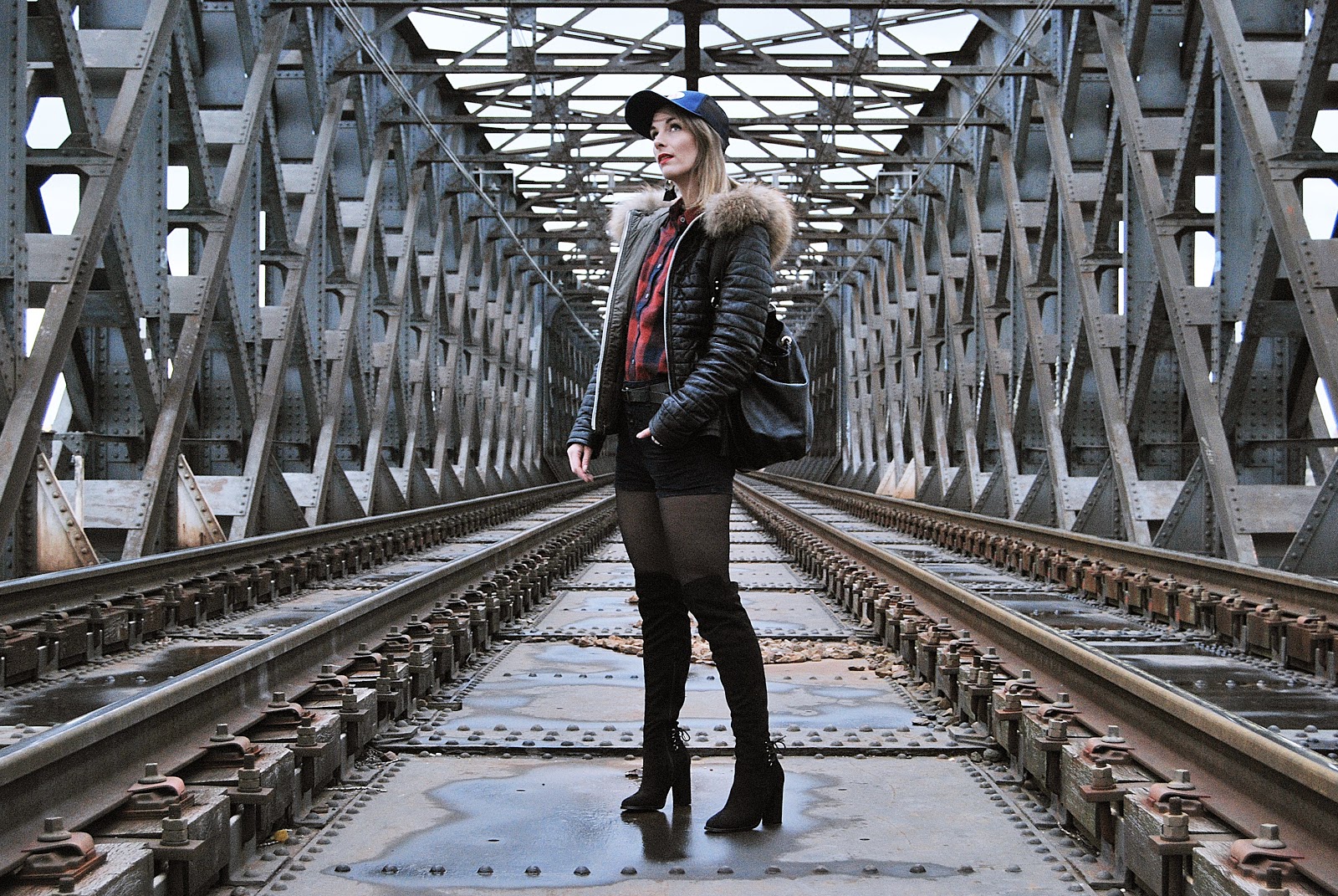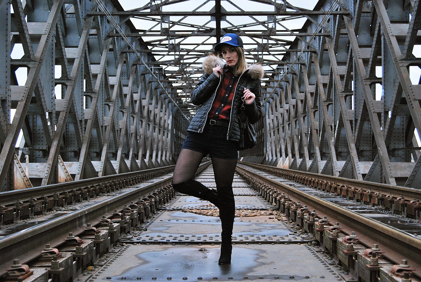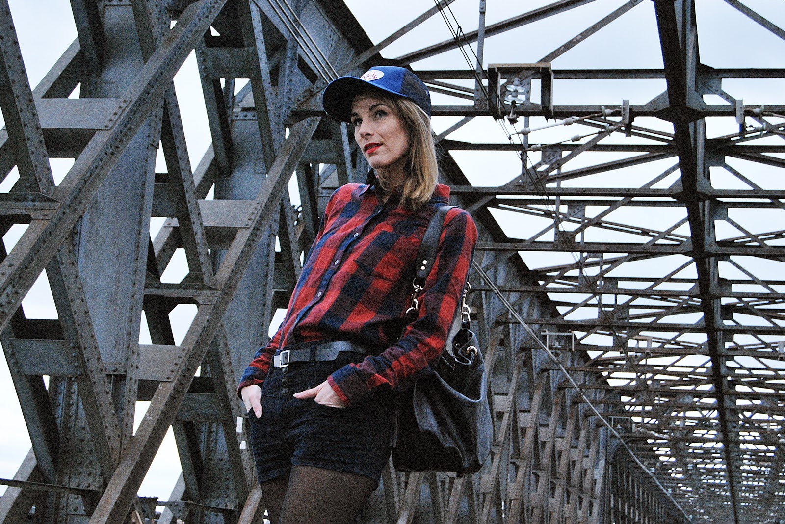 # Hello les amis ! Aujourd’hui on se retrouve pour un article qui me tiens particulièrement à cœur puisqu’il s’agit d’un LOOK en VON DUTCH, une marque qui à bercée ma jeunesse! Lancée dans les années 2000 par Christian Audigier. Avignonnais d’origine , il part s’installer à Los Angeles et devient très vite l’ami des stars. Il se fait connaître en utilisant la technique celebrity wear : il offre casquettes et tee-shirts à l’effigie de sa marque dans sa boutique de Melrose Avenue et paye les paparazzis pour photographier des stars comme Britney Spears, Justin Timberlake , Michael Jackson ou Madonna avec ses produits. Cette publicité fait sa réussite. Décédé en Juillet 2015 c’est aujourd’hui la sœur de Christian qui signe le retour de la marque, pour notre plus grand bonheur ! Von Dutch revient sur le devant de la scène avec son accessoire n°1: la casquette ! Son côté vintage rappelle des souvenirs d’enfance aux « Born in the 90’s » et son look a su nous conquérir ! Désormais la casquette s’affirme et s’affiche même sur les plus grands défilés ! Je suis donc très fière et heureuse de représenter la marque pour son grand retour ! A cette occasion je vous ai concocté une tenue Street-Chic avec une chemise à carreaux de la marque, un short en jeans et des cuissardes. Avec Clément (à la photo) nous avons choisis un vieux pont de chemin de fer pour aller shooter, et je trouve le rendu vraiment canon , pas vous ? Vous aimez ? J’attend vos avis et commentaires, à très vite pour un look en duo !! 💬