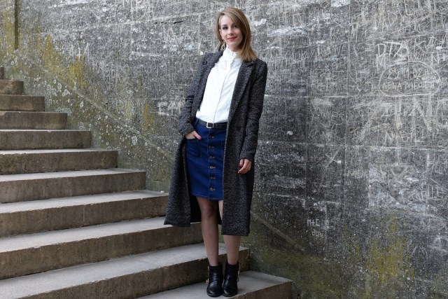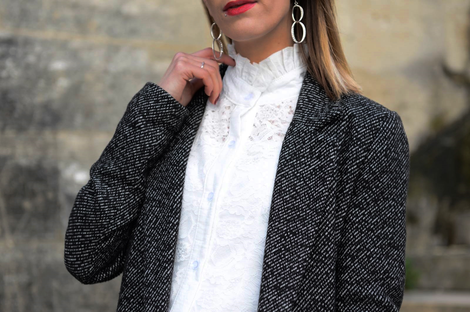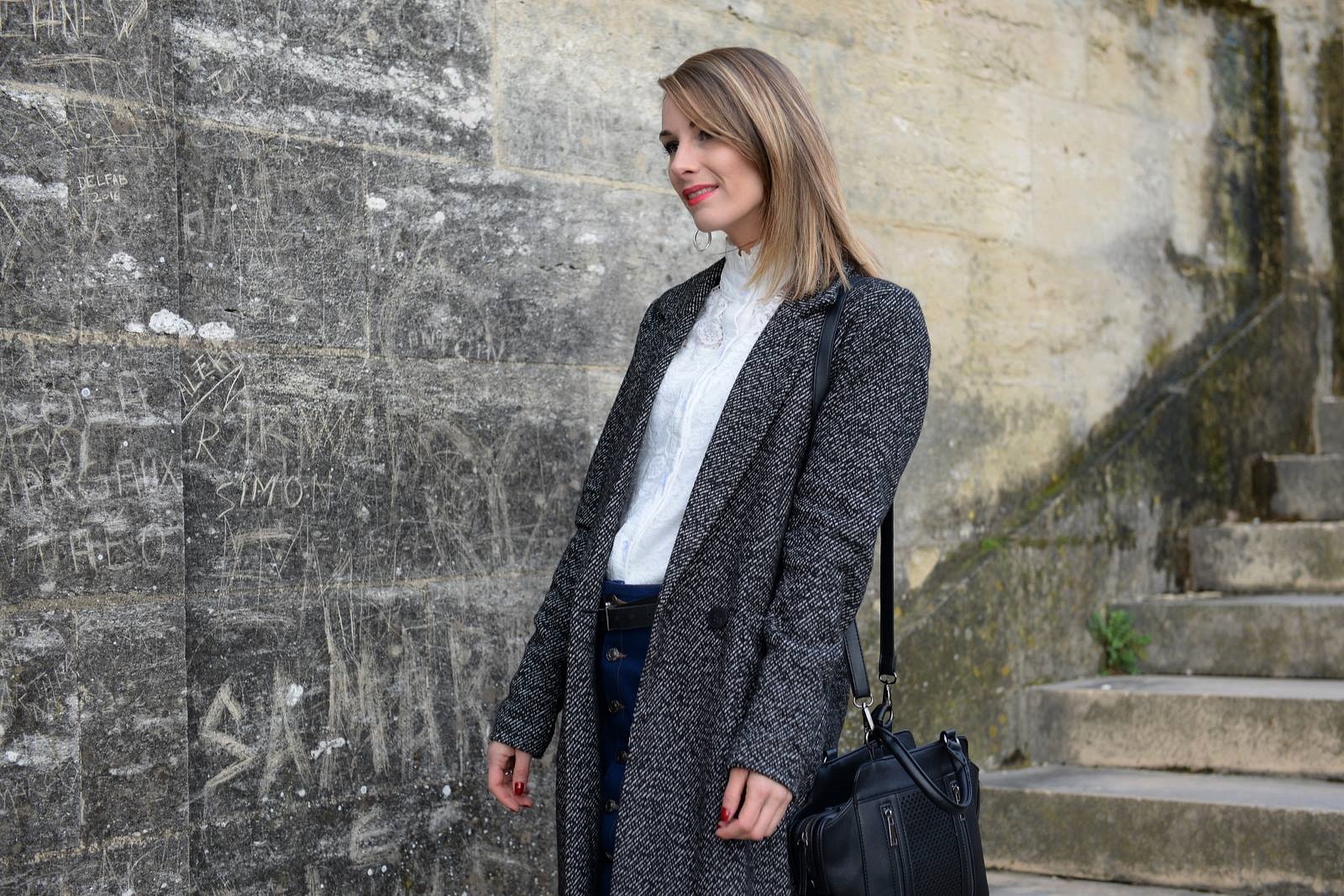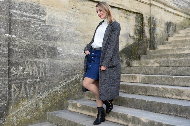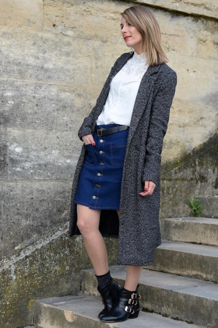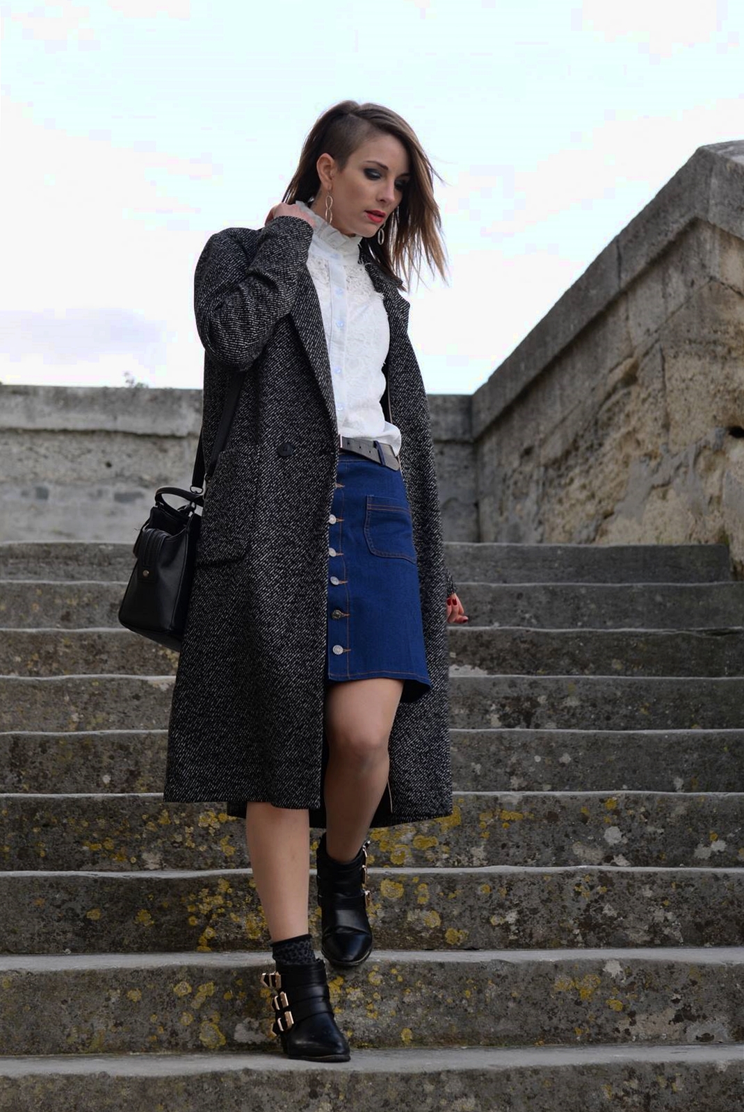# Saaaalut c’est encore moi avec un nouveau LOOK et avec mon ami Laurent Perroux Ă la photo , on ne change pas une Ă©quipe qui gagne !! C’est un nouveau coup de foudre que je vous prĂ©sente aujourdâhui, mon manteau long dĂ©nichĂ© chez Vero Moda! Alors pour la petite histoire , c’est une piĂšce que j’avais repĂ©rĂ© il y a quelques mois dĂ©jĂ , Ă l’Ă©poque oĂč je bossais la bas (pour celle qui me suivent depuis un moment Ă prĂ©sent ) et bref, jâĂ©tais tomber amoureuse au premier regard, mais mon compte en banque tirait un peu la gueule. Puis lĂ , en passant voir les copines au magasin, que vois-je ? Mon manteau, lĂ devant moi, le dernier et soldĂ© Ă -50% … Vous connaissez la suite hein, je suis repartie avec illico presto , sans mĂȘme prendre le temps de rĂ©flĂ©chir, de toute façon Ă quoi bon rĂ©flĂ©chir dans un cas pareil ?? Il est tellement classe , mais classe ce manteau, j’en suis dingue! hahaha !! PASSONS ! Pour ma tenue du jour, je vous prĂ©sente une petite jupe en jeans Ă boutons , un excellent basique que je n’avais pas encore dans mon placard, accompagnĂ© d’un chemisier en dentelle hyper canon et original avec son col montant, dĂ©nichĂ© chez MODE IN ELO, un petit E-shop vraiment sympa que je viens de dĂ©couvrir et avec qui je ferais rĂ©guliĂšrement des partenariats . On termine avec mes bottines Ă brides que je ne vous prĂ©sente plus, et ça donne un petit look sympa mais selon moi mĂ©ga efficace vous ne trouvez pas ? VOUS AIMEZ ??? JâespĂšre et je vous invite Ă commenter !! Des bises les amis, et Ă trééééés vite sur le blog !!! đđ