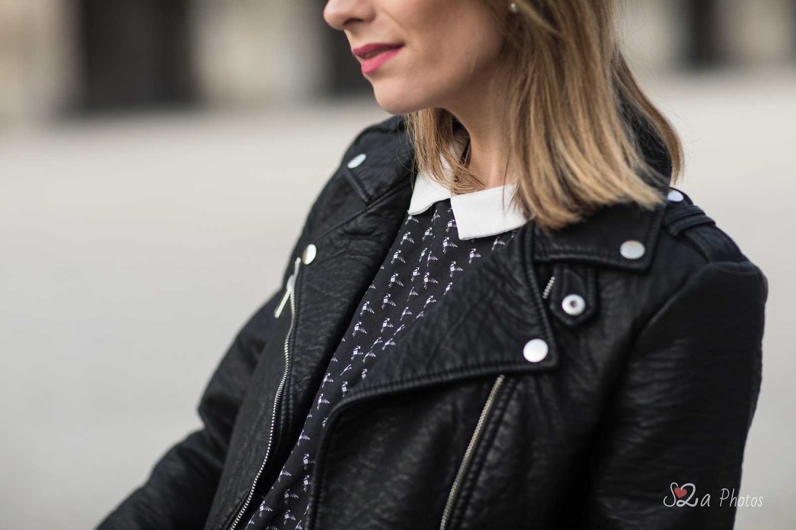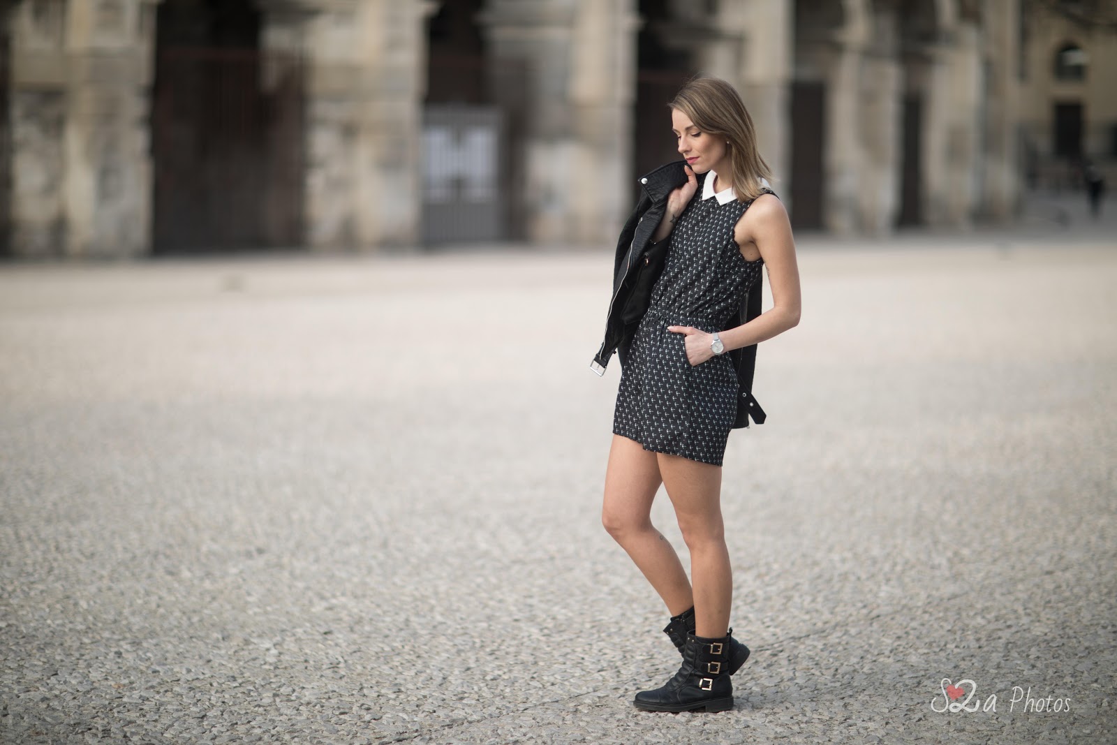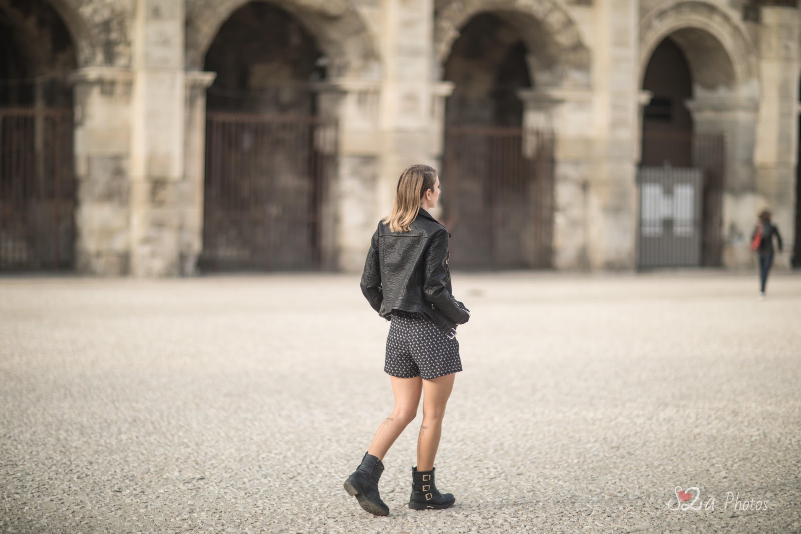 # Heeeeey les amis !!! Ce matin je vous retrouve en direct de Nîmes, au pied des arènes avec mon ami Sébastien Sechinffon, avec qui j’avais RDV pour une séance photo lingerie/cocoon, dans un superbe appartement AirBnB. Je vous montrerais ça très prochainement sur Instagram! Fin de séance, il fallait absolument qu’on profite du beau temps pour shooter mon LOOK DU JOUR ! C’est fou quand même, on est même pas fin février et ça fait déjà plusieurs semaines qu’on se croirait au printemps !! On a jamais connu un mois de Février si doux, du coup j’en profite pour sortir ma petite combinaison chérie !! Je l’aime tant, il me semble même pas vous l’avoir déjà présenter ici !! J’avais envie de « casser » son côté trop sage en l’associant à mon perfecto et des boots à brides! Pour la petite info, j’ai pas moins de 4 vestes en (simili) cuir dans mon dressing, deux noires, une beige, une camel, mais je n’avais pas de perfecto et c’est un peu le truc que je voulais m’offrir depuis des années!! Je suis tombée sur une promo ultra-canon chez Pimkie, en ce moment sur toutes les vestes et bombers, et j’ai craqué !! C’était le modèle parfait, en simili-mat épais, qui tient bien chaud, avec ses manches zippés, et sa ceinture, bref, il était parfait ce perfecto, et pour un prix ultra canon! Avec un si bon photographe et un décor pareil, ça pouvait que rendre bien non ? Vous aimez j’espère ? Je vous invite à commenter et partager !! ENJOY les amis, et à trééés bientôt !! 💋