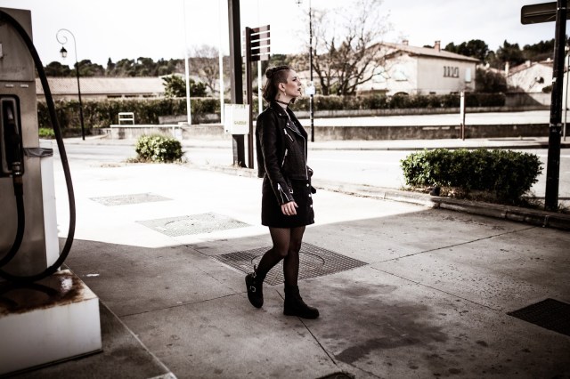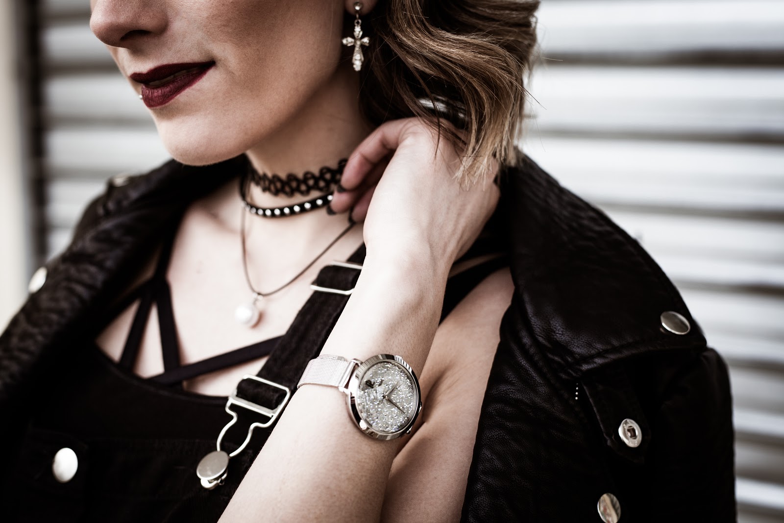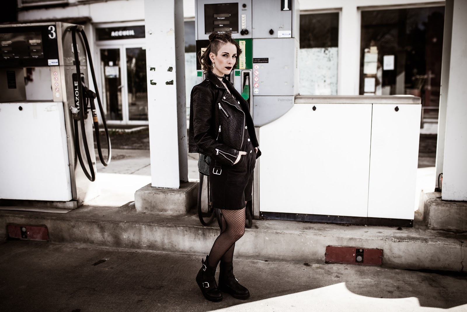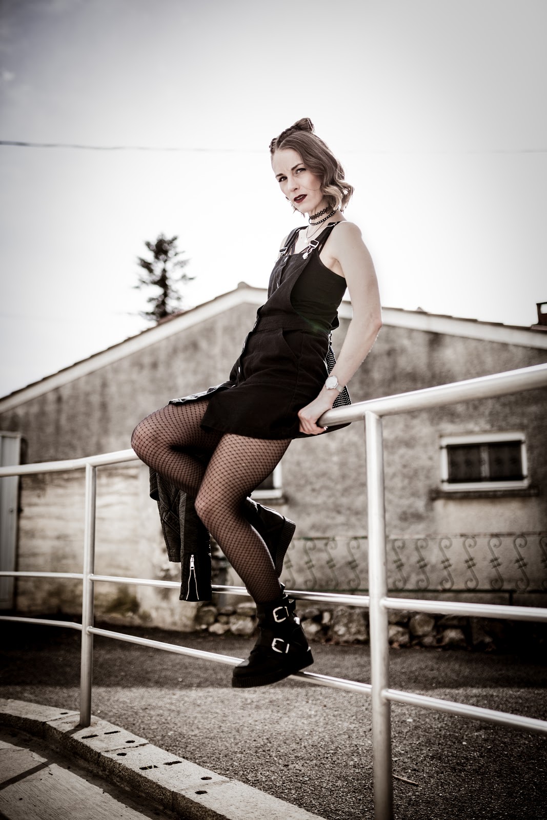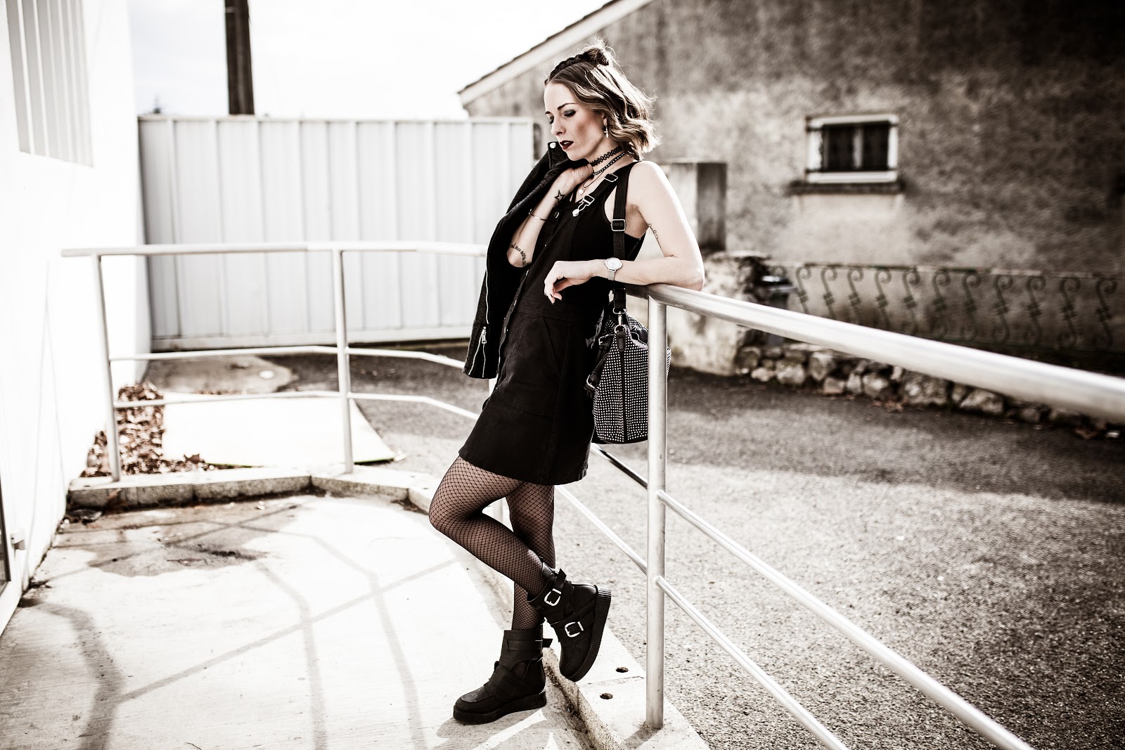 # Hello les amis !! Ce matin je suis JOIE ! Je reviens avec un nouveau LOOK , une tenue d’inspiration grunge/rock que j’adore et qui me tenait totalement à cœur de vous présenter !! C’est un style que j’adore et que je porterais tous les jours si je le pouvais, mais bon, apparemment ça fait un peu « trop » pour aller bosser, et les regards ne sont pas toujours sympathiques quand je me balade comme ça en ville. Que voulez-vous, les gens sont c***, je ne sais pas si c’est les boots, le rouge à lèvre foncé ou les résilles mais ça ne plais pas toujours !! Ceci dis, je ne sais pas si vous auriez osé mais moi, c’est le look que j’aurais choisi si j’avais pu aller à la Fashion-Week en ce moment même sur Paris ! Parfois, il faut savoir se démarquer !! Enfin bref, pas de F-W pour moi cette année, je n’ai pas pu me déplacer ! Côté photos, j’ai fait une superbe rencontre cette semaine, il s’agit de Florence Demeusy (son site ICI ) , avec qui j’ai shooté ce look ! C’est elle qui m’a contacté par hasard suite à un post sur FB où je cherchais un(e) photographe, et ce fut une très bonne surprise, j’adore son boulot et son univers photographique ! Ce matin là, j’avais également RDV avec Aurélie du salon de coiffure Senso, au pontet, qui comme vous le savez me coiffe régulièrement pour mes shoots. Ajoutez à cela une bonne dose de bonne humeur et ça donne une belle équipe qui déchire !! Côté look (quand même) j’ai déniché cette robe-salopette chez H&M, un vrai coup de cœur ! Mon perfecto, mes boots façon creepers (déjà vues ICI ), une paire de collants résilles et côté bijoux et accessoires, on découvre discrètement un harnais sous mon débardeur et mes colliers chockers . Pour terminer zoom sur … ma montre !!! C’est aussi un accessoire incontournable de cette tenue qu’il faut que je vous présente! J’ai été récemment contacté par la marque Pierre Lannier et j’ai adoré leurs montres! J’en ai choisi une de la collection Élégance Cristal, magnifique avec ses cristaux de Swarovski et son look totalement chic et moderne ! Je l’adore! Alors , vous aimez ?? Ça vous plairais que je vous présente des looks un peu plus alternatifs sur le blog ? J’attends vivement vos avis et réactions sur cette tenue!! A très vite les filles !! 💋