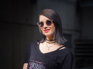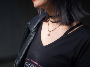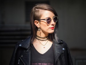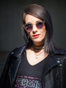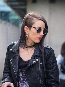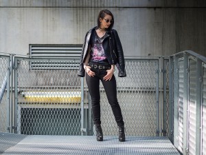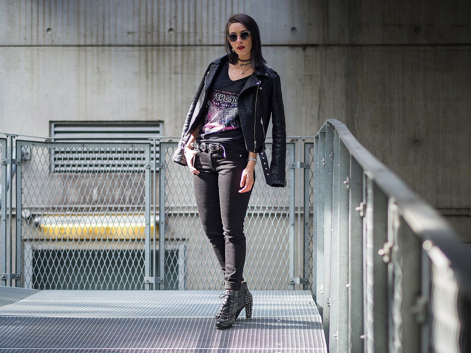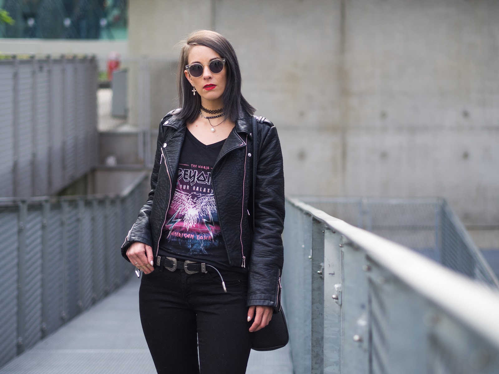 # Saalut les amis !!! Ce matin je vous retrouve pour un look carrément ROCK shooté par mon ami Mathieu Pellerin lors de mon dernier passage sur Paris !! C’est tellement un plaisir de shooter avec lui, il est photographe de mode, particulièrement spécialisé dans les photos de Blogueuses, il sait donc exactement ce dont j’ai besoin et quels sont mes attentes, pas besoin de longues explications et de s’y reprendre à dix fois et ça croyez-moi ça fait gagner beaucoup de temps ! Puis en plus, il fait un guide touristique vraiment cool et m’a donc fait découvrir de chouettes coins où shooter, comme cet endroit carrément Indus’ du côté du quartier de Beaugrenelle, non loin du fameux mur violet d’ailleurs, mais celui çi m’inspirait beaucoup moins pour le coup ! Côté tenue , je mise tout sur ce tee-shirt résolument rock déniché chez NewLook et sur ma paire de bottines cloutés. Le perfecto, mes lunettes et mes cheveux gris font le reste, et j’adore le résultat, qu’en pensez-vous ?? Je file les filles , une grosse journée m’attend encore, j’attend vos avis !!! ENJOY !!