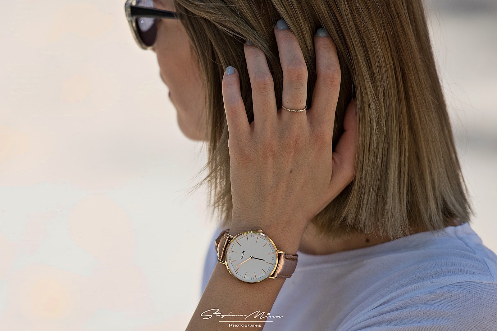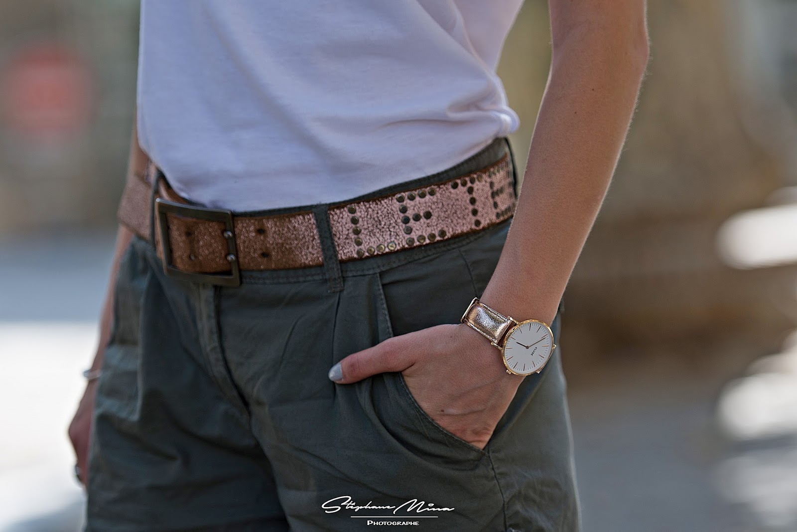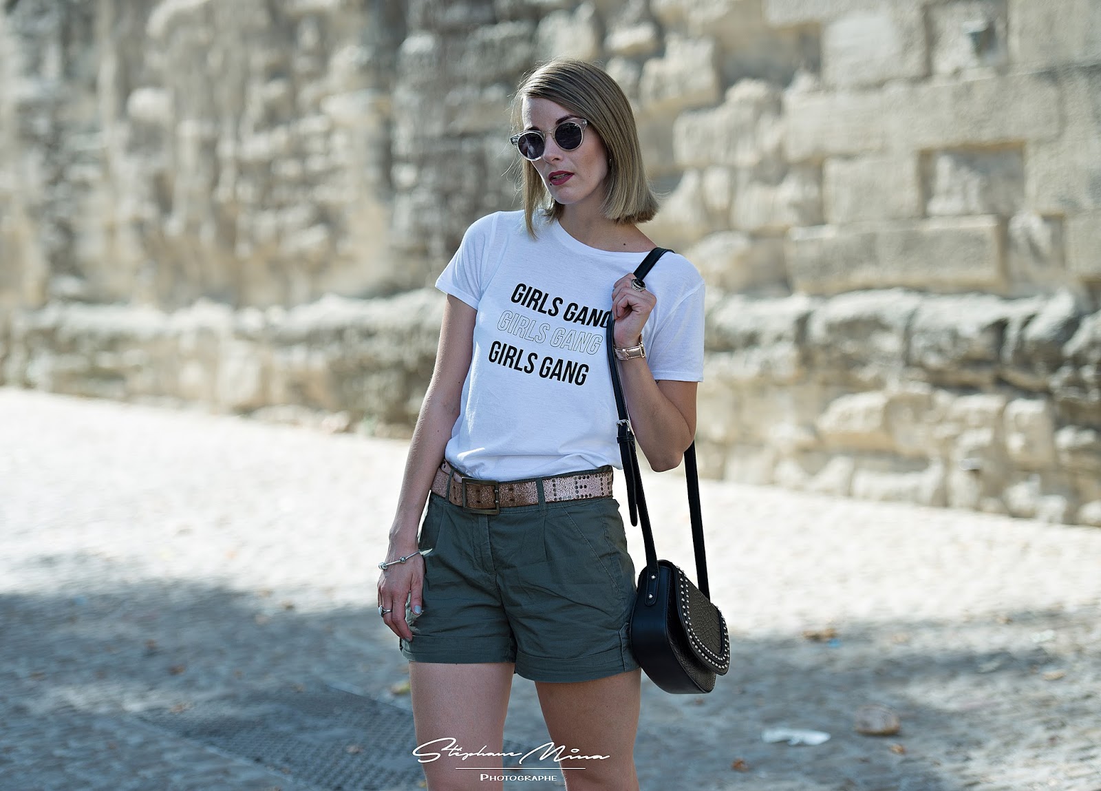 # Hellooooo !!! Beh oui, c’est encore moi, et une nouvelle tenue! Je suis hyper productive en ce moment, j’ai des toooonnes de looks à vous présenter et je profite à fond des beaux jours jusqu’à tard le soir !! En sommes, vive l’été , ce ne sera certainement pas la même chose dés que les mauvais jours reviendront et quand les journées raccourciront ! BREF, cette fois çi c’est un petit look à la cool que j’avais envie de vous présenter, shooté la semaine dernière avec mon pote Stéphane lors d’une balade sur Avignon, en plein festival ! Un short kaki (genre baroudeuse des villes) mon tee-shirt Girls Gang déniché en solde chez Pimkie pour moins de 5€ ! Une tenue que je pourrais tout aussi bien porter au boulot d’ailleurs! Sinon, j’ai aussi craqué sur ces baskets blanches brodées, elles sont canon et hyper confort ! Pour finir, le petit accessoire en plus de cette tenue, c’est ma montre CLUSE, reçu de la part du site Montre.Be . J’ai choisi La Boheme , avec son bracelet rose-gold, ça change de tout ce qu’on voit habituellement. Au début j’ai eu du mal, je trouvais le cadran un peu gros pour mon poignet, puis finalement je m’y suis fait sans soucis, question d’habitude! Et sinon, vous aimez ?? J’attends vos petits mots et commentaires, ENJOY les filles, à trés vite !! 🌞