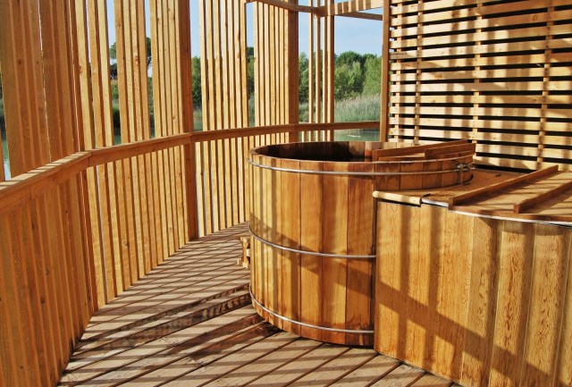 On a testé… La cabane flottante duo/spa « Aquarelle« . Comme tout droit sortie d’un rêve ! Un vrai petit nid d’amour, avec un bain nordique à 38 degrés , avec plein de bulles à l’intérieur, si ça c’est pas magique !! Ce spa face à l’étang ajoute un réel plus à l’ambiance du séjour, une grosse dose de romantisme et de bien-être ! Dans la cabane , on à tout ce qu’il faut : un immense lit douillet, une petite salle de bain avec WC, un coin repos, une terrasse. Les draps et serviettes de bain sont prévus également.