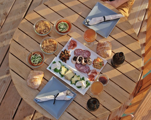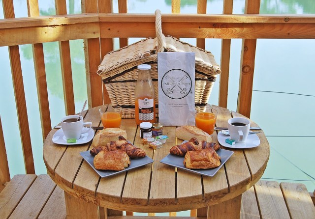 La nuit tombe sur le domaine des grands-cépages … Ici, pas de télévision, ni de wifi … nous sommes ici pour nous déconnecter et converser avec la faune …. C’est aussi ça les joies de la nature! Si une nuit en cabane est dépaysante, c’est parce qu’elle sollicite les cinq sens ! Réveillée par la lumière du jour et le chant des oiseaux, les panier petit déjeuners sont livrés à partir de 8h00 : Café, jus de fruit, confitures, miel, le pain et les viennoiseries de la meilleure boulangerie de la ville… de quoi commencer la journée en beauté! Je prends mon petit-déjeuner en tête à tête avec la nature. Je me mets à respirer le parfum des chênes et à redécouvrir la rugosité de son écorce. Déconnectée du monde moderne, je suis une autre personne!