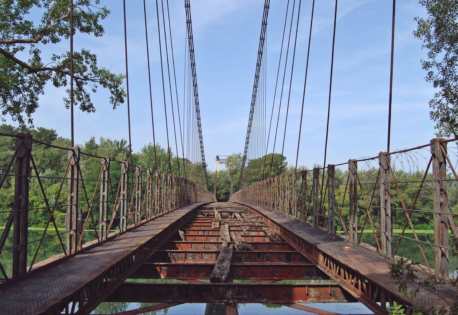 et à quelques mètres de là , en promenant …. Le Pont suspendu des Arméniers , laissé à l’abandon ici depuis 1975 . Impressionnant, à découvrir absolument !!