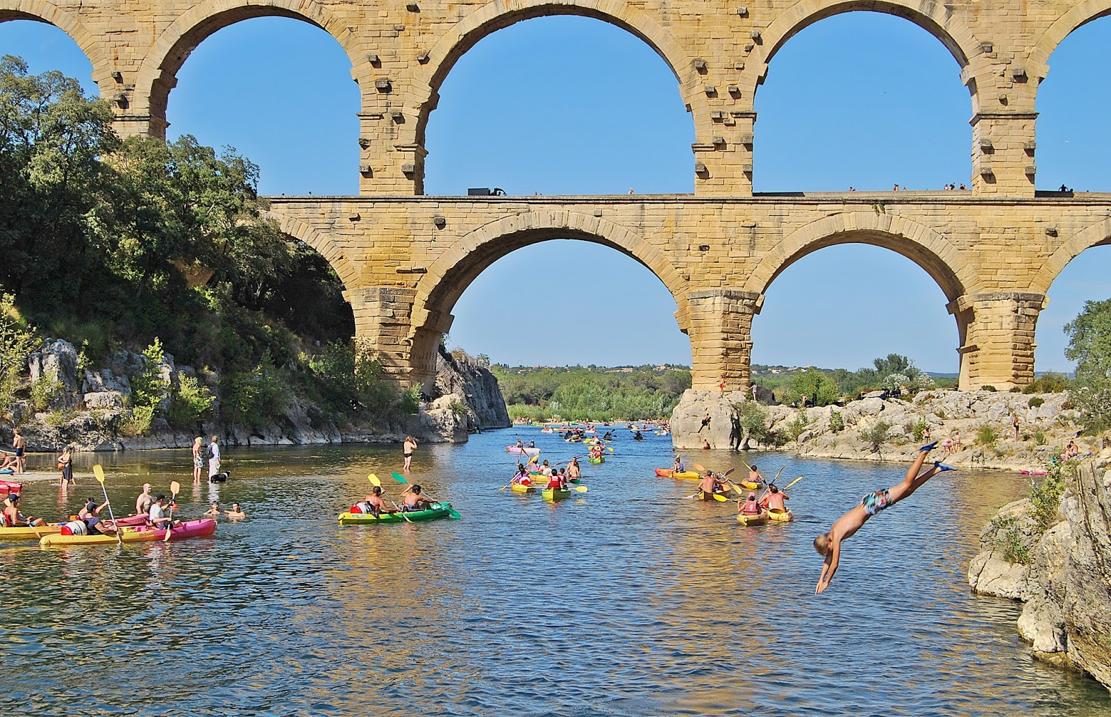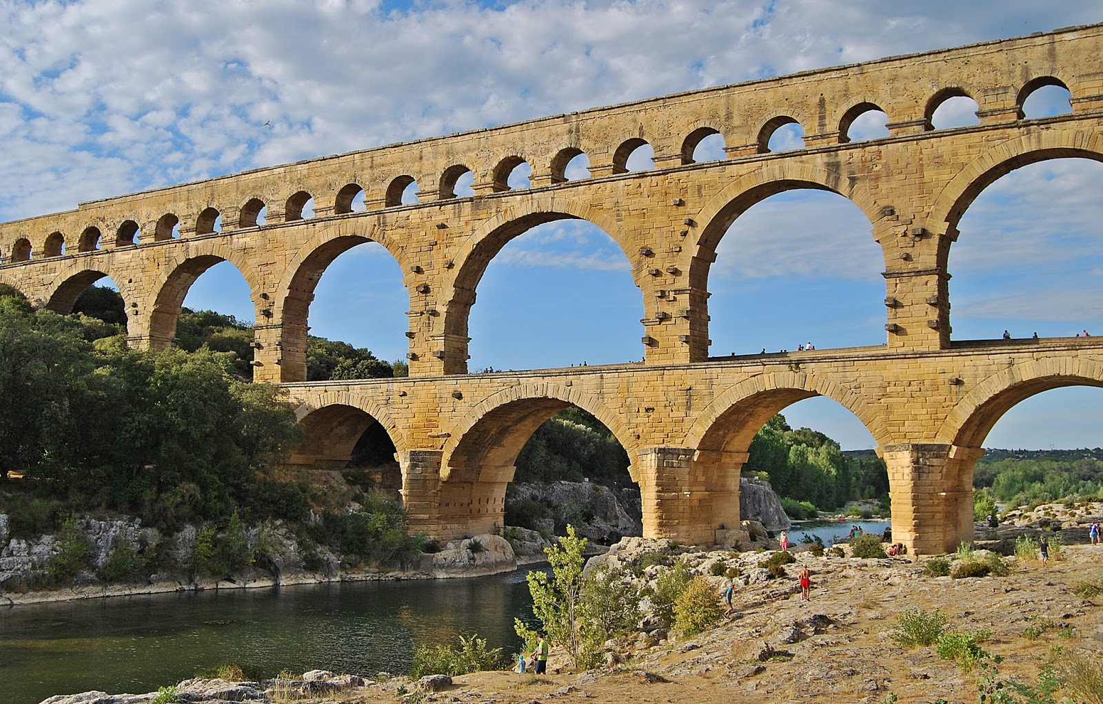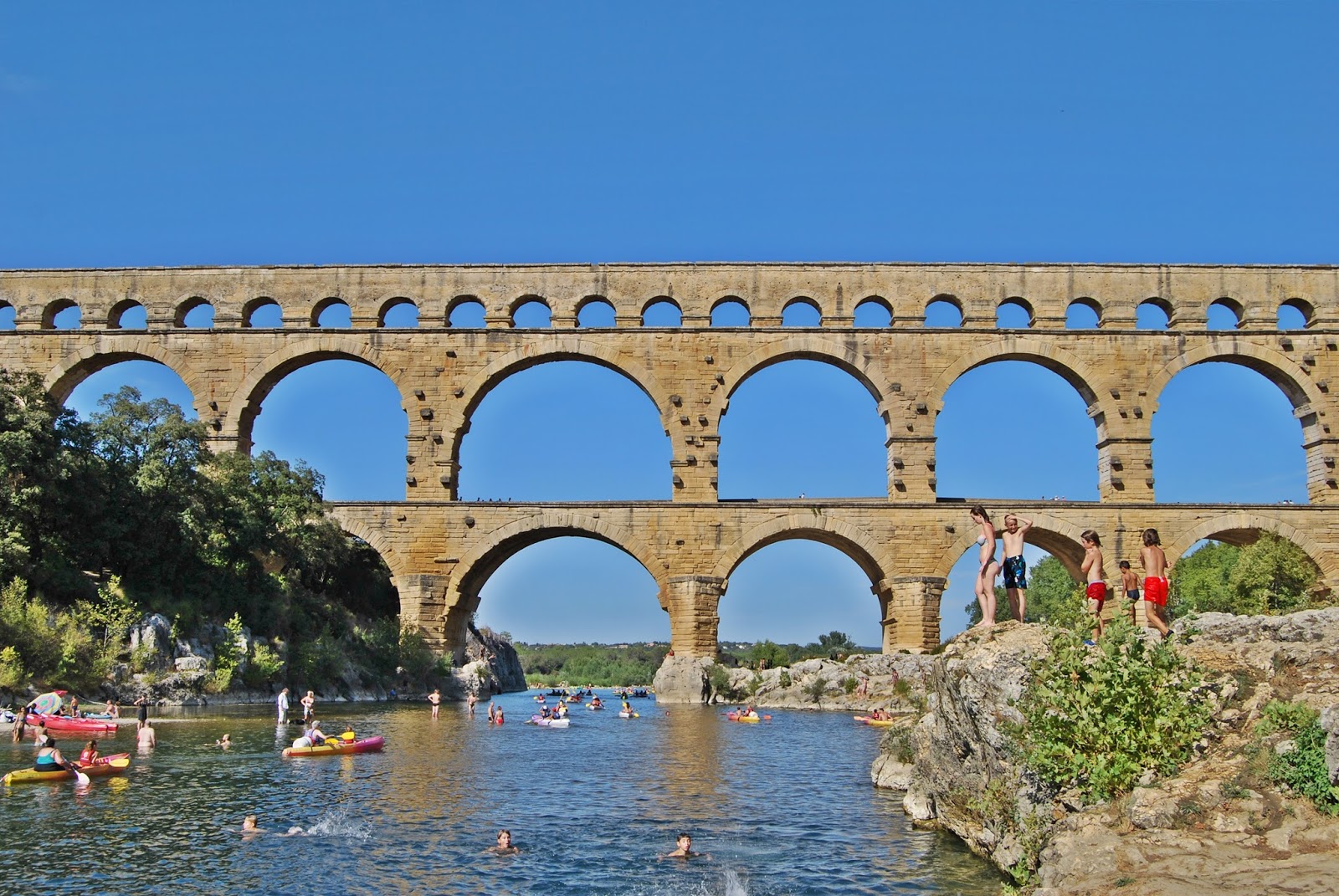 Le Pont du Gard , est un aqueduc romain haut de 48 mètres et long de 273 mètres. Il compte 6 arches au niveau inférieur, 11 au deuxième et 35 au troisième. Il est Situé Uzès et Remoulins, non loin d’Avignon, dans le département du Gard et enjambe le Gardon. Il fut utilisé jusqu’au VIème siècle pour conduire l’eau d’Uzès à Nîmes, puis devint un péage au Moyen-Age, et enfin un pont routier du XVIIIE au XXeme siècle.