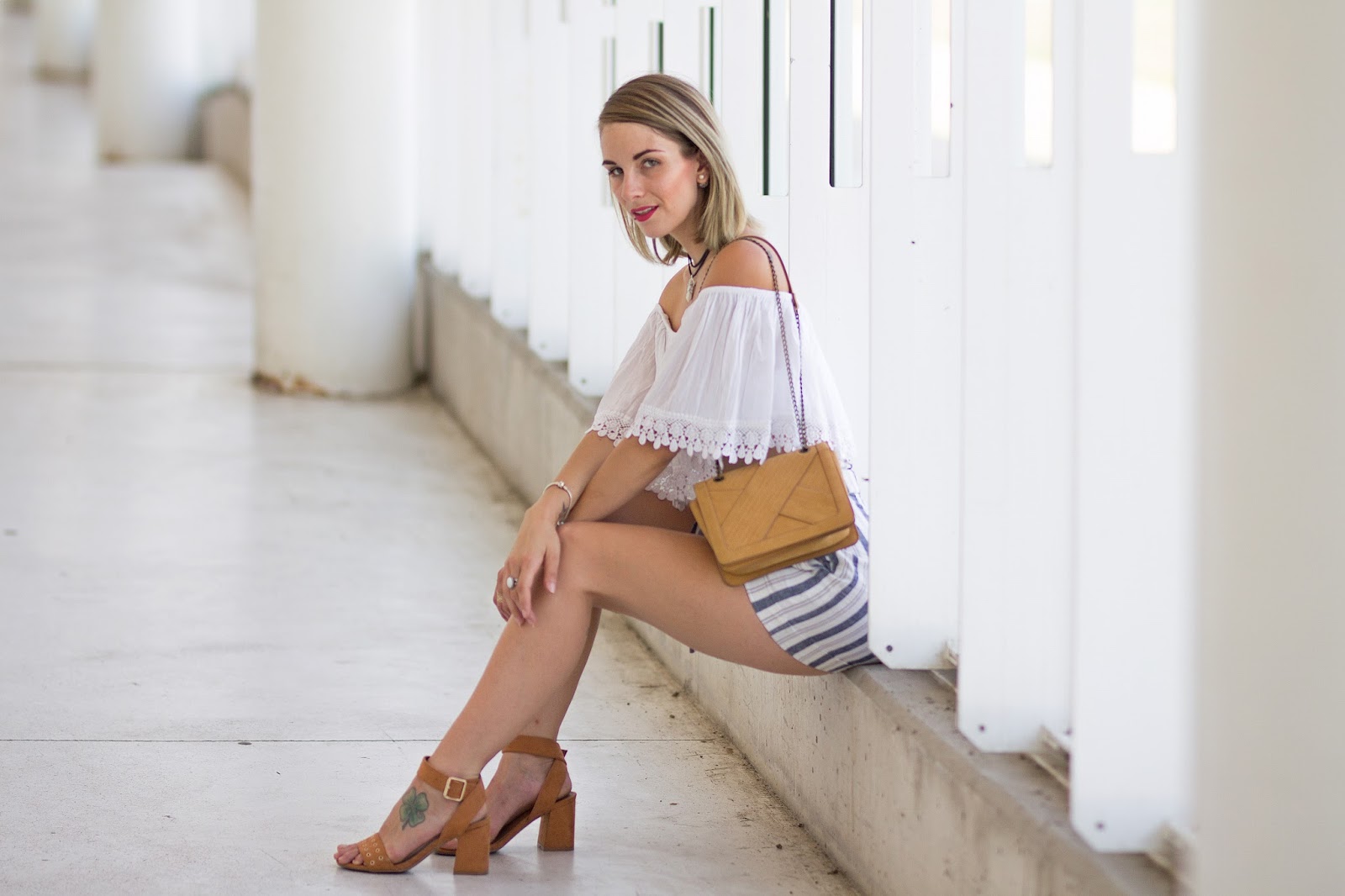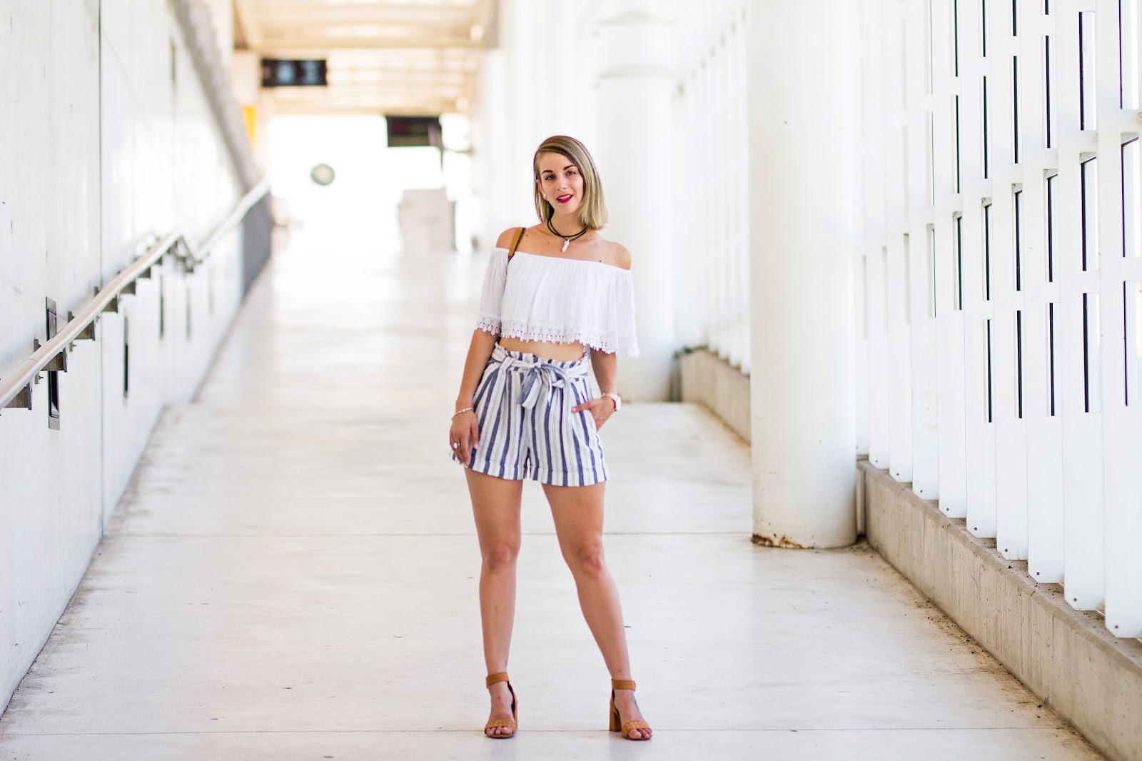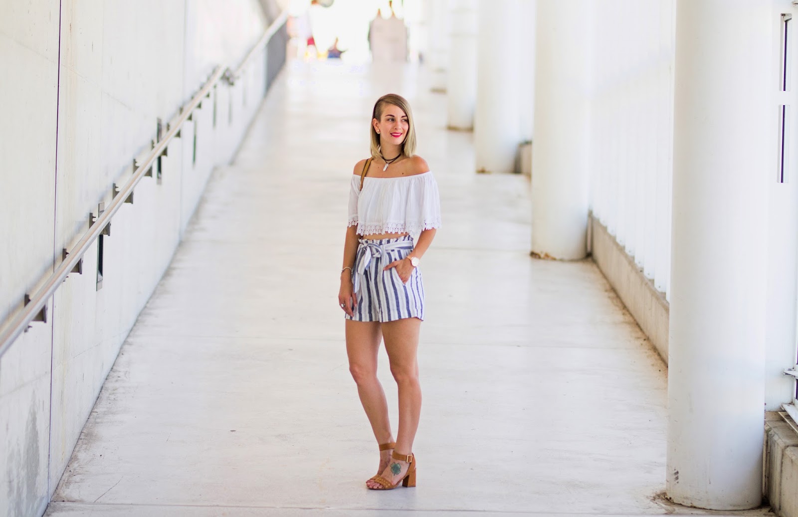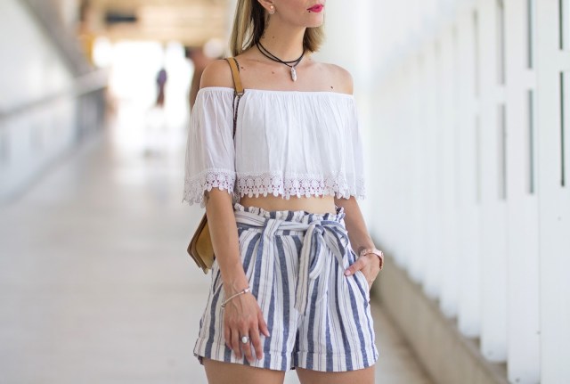 # Salut les filles, j’espère que vous allez bien ? Guillaume et moi reprenons doucement du service, et revenons avec plusieurs looks à vous présenter !!! Nous ne nous étions pas vu depuis quinze jours, entre congés et autres, nous avions du boulot à rattraper ! Commençons ce matin par ce look d’été que j’adore totalement !!! Il fait encore une chaleur à crever en cette fin de mois d’août alors je mise tout sur une tenue légère et tellement agréable à porter !! J’ai ressortie mon short en lin déniché l’an dernier chez Mango (vue ICI) et ce crop-top en coton trouvé chez Bershka en solde ! A mes pieds , mes sandales camel (déjà vues ICI ) et mon sac à main déniché dernièrement chez Promod, une petite pépite! J’espère que vous aimerez ces quelques photos, je vous embrasse et vous dis à très vite !! ENJOY!