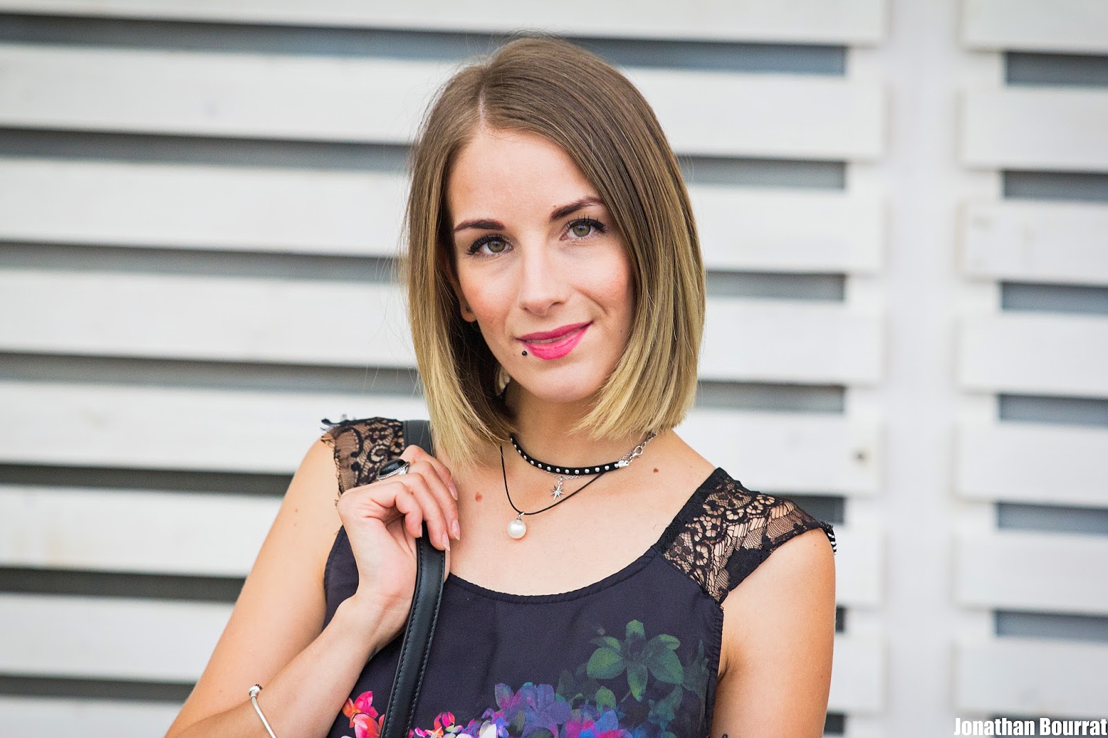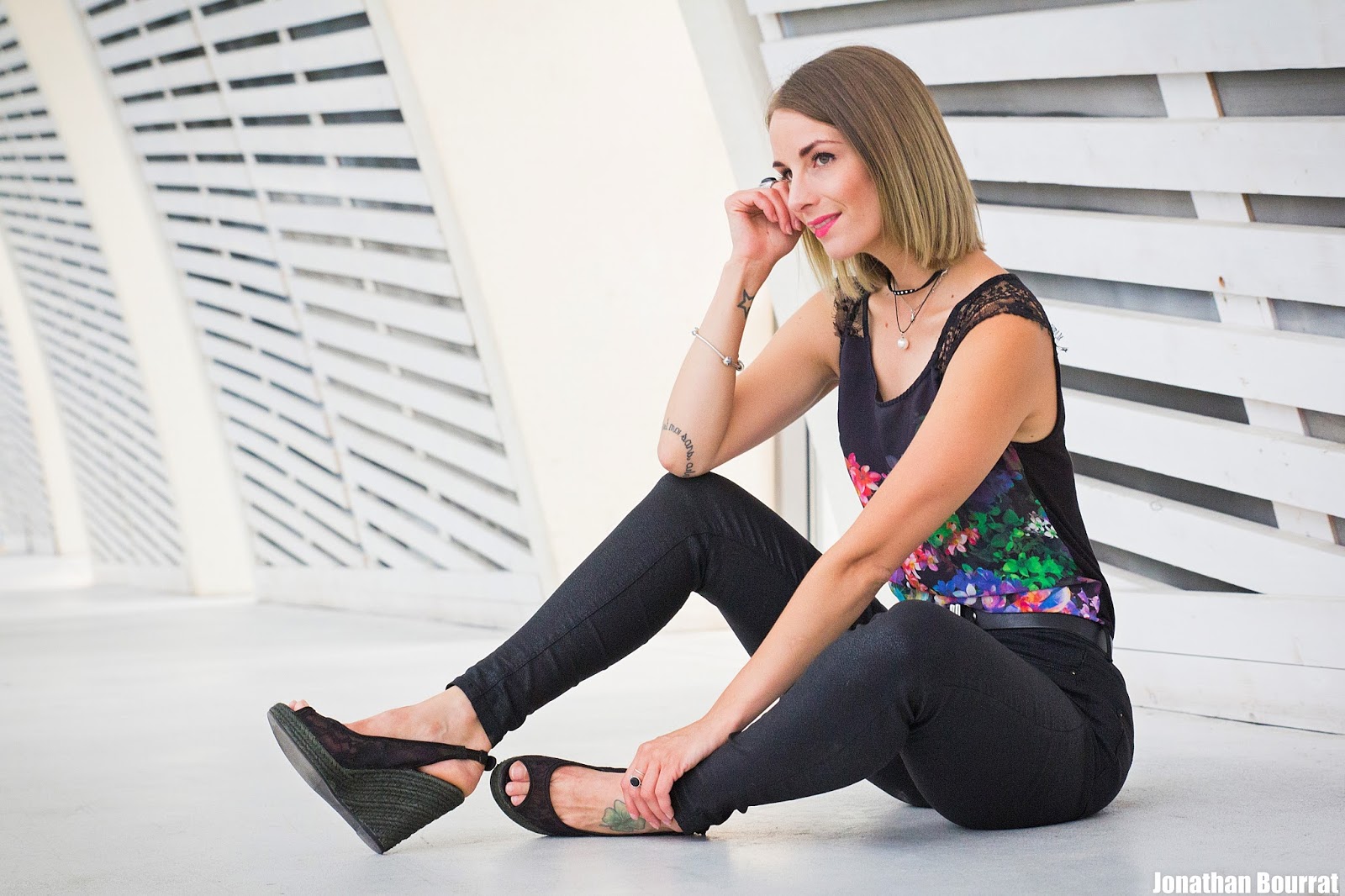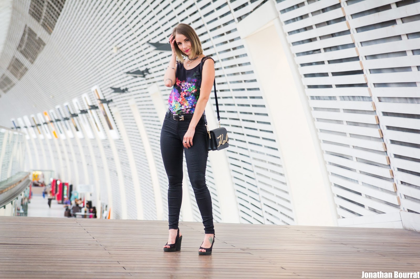 # Hello mes jolies, j’espère que vous allez bien ? Je vous retrouve ce matin avec une chouette tenue shooté cette semaine avec Jonathan Bourrat, un photographe lyonnais avec qui je bossais pour la première fois, et descendu sur Avignon pour l’occasion! Côté LOOK j’ai choisi quelque chose d’ultra simple, une tenue de tout les jours mais qui fait toujours son petit effet ! Un jolie haut fleuris avec bretelles en dentelles, un slim noir légèrement pailleté que j’adore définitivement (ultra confort et tellement canon) , des espadrilles compensées et mon sac à main KARL qui ne me quittera plus de toute la vie, oui oui ! Le tout pour des jolies photos! J’espère que vous aimerez ! J’attends vos petits mots et vous embrasse, en direct de PARIS aujourd’hui pour plusieurs séances photo que j’ai hâte de vous montrer !! ENJOY les filles !!
