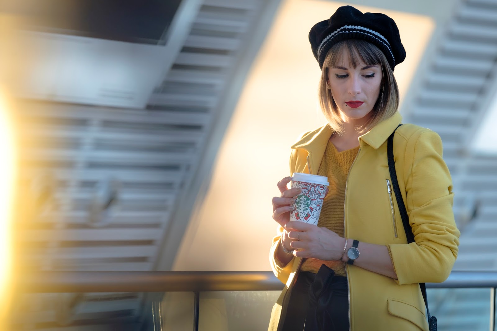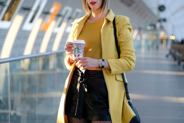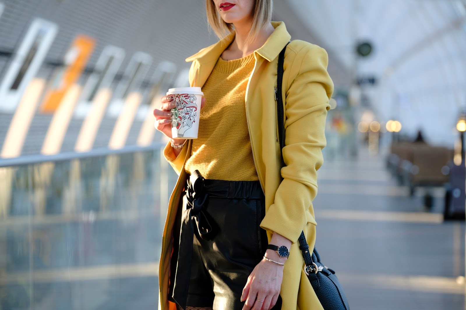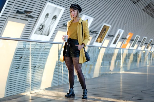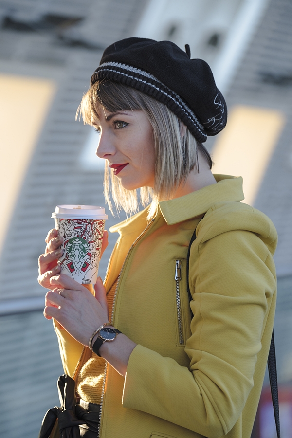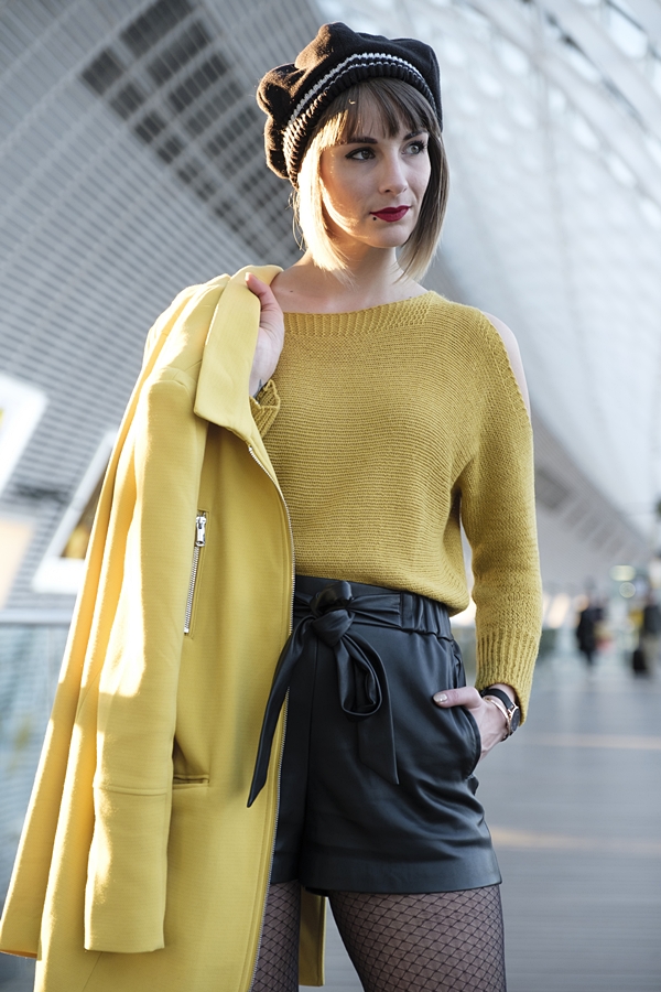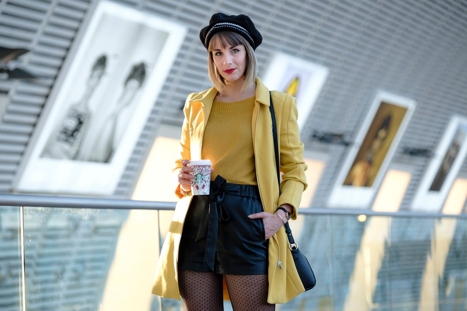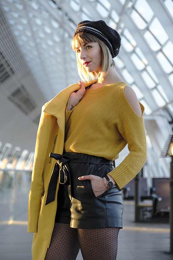 # Saaaalut les chéries! J’espère que vous allez bien ? Ce matin je suis comme une folle, je suis tellement, tellement pressée de vous montrer les photos de ce shooting issus de mon partenariat avec la marque Daniel Wellington !! Pour l’occasion, j’avais RDV avec mon ami Jerome Trinquet afin de vous présenter un look que j’adore et ma superbe montre reçu récemment !! Je vous l’ai justement présenter ICI sur Instagram, reçu dans un très beau coffret noir avec un noeud rouge , c’était un peu noël avant l’heure à la maison, surtout que je ne m’attendais pas à recevoir le jonc en plaqué or rose qui l’accompagne! BREF, la joie ! J’ai choisi le modèle CLASSIC PETITE | ASHFIELD en 28mm, le bracelet noir mat en maille milanaise lui donne un côté très chic et son petit cadran or rose apporte une touche de délicatesse à n’importe quelle tenue !! Bref, un véritable coup de cœur !! Pour en venir à notre look du jour, j’ai ressortie mon short taille haute en simili (déjà vu ici) , un pull fin en maille et mon manteau jaune moutarde que j’adore! Béret sur la tête, bottines perlés aux pieds, montre au poignet, me voilà prête pour une virée au Starbucks et une belle après-midi entre amis !! J’espère que vous aimerez cette série photo, je vous dis à très vite et attend vos petits mots !! ENJOY !!