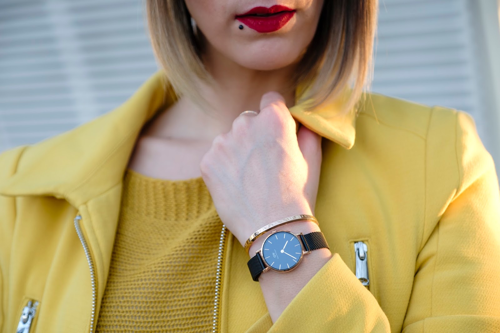 Superbe ton look ! Jaune et noir. Ce sont magnifiques. J'adore des montres de Daniel Wellington depuis longtemps. C'est toujours une parfaite combinaison de montre et bracetlet. Merci pour ta présentation ♥