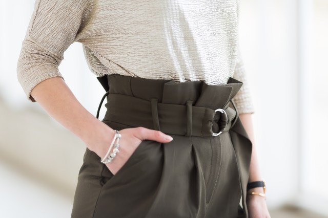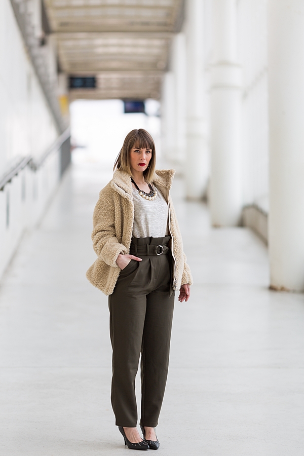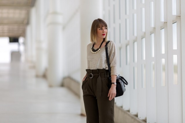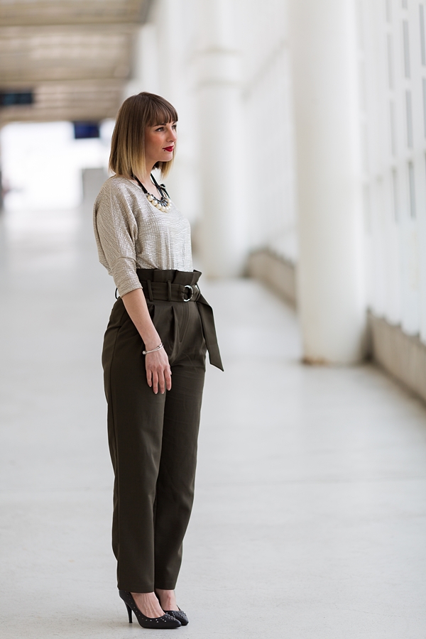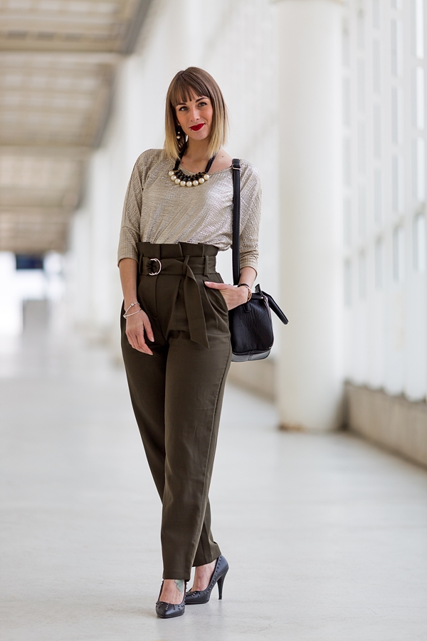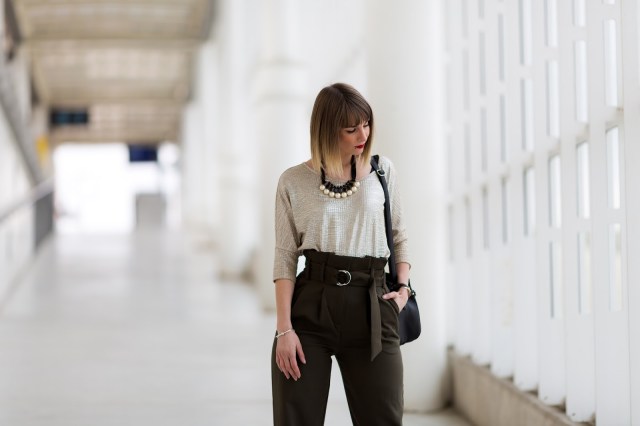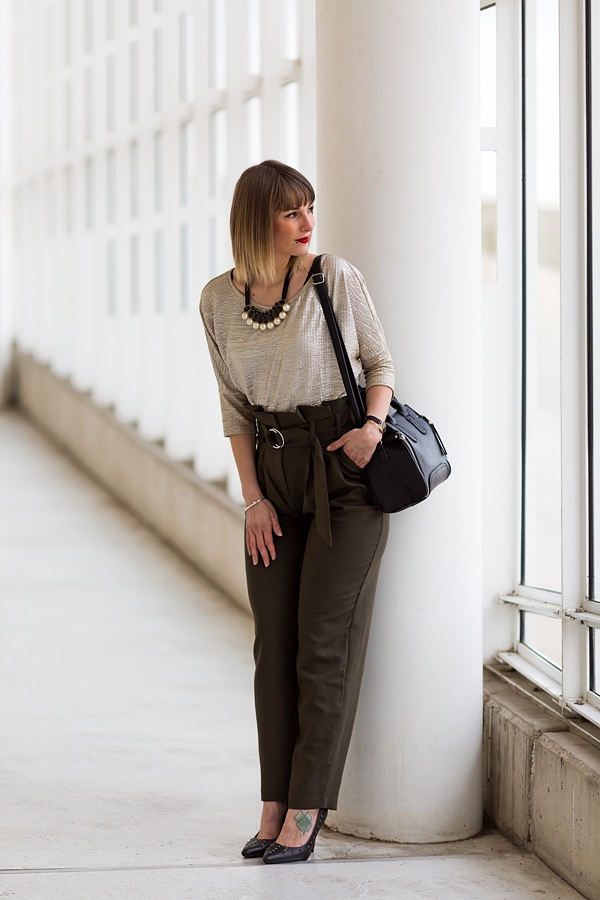# Hello les filles! Quelle joie aujourd’hui de vous retrouver avec un nouveau LOOK, et pas n’importe lequel s’il vous plait ! Cette semaine, figurez-vous que je fête mais 30 ANS ! Oui mesdames, et toutes mes dents! Du coup , je me devais de marquer le coup, avec une tenue classe et soigné , genre, ça rigole plus je suis une (vraie) grande !! Bon, rassurez vous, je n’ai pas besoin de passer la trentaine pour m’habiller chic , et entre nous , je ne vais pas pour autant lâcher du jour au lendemain mes jeans et baskets préférés, mais quand même, je me met au défi de faire plus attention ! Bon du coup, quesqu’elle nous présente aujourd’hui ? Un pantalon carotte taille ultra-haute associé à un haut texturisé doré! J’adore l’association du kaki au doré ou à la couleur bronze, je trouve toujours que ça match à merveille !! Je suis en amour sur ce pantalon qui me fait des jambes à tomber alors que je mesure moins d’un mètre soixante-dix en vrai !! J’ai évidement chaussé mes escarpins et mon sac à main préféré, et c’est ainsi que j’ai donné RDV à mon ami Mathias Caumont pour la séance photo du jour ! J’espère que vous aimerez cette série de photo et ce look, j’attends comme toujours vos mots et commentaires !!! ENJOY les amis , j’ai 30 ANS !!!!