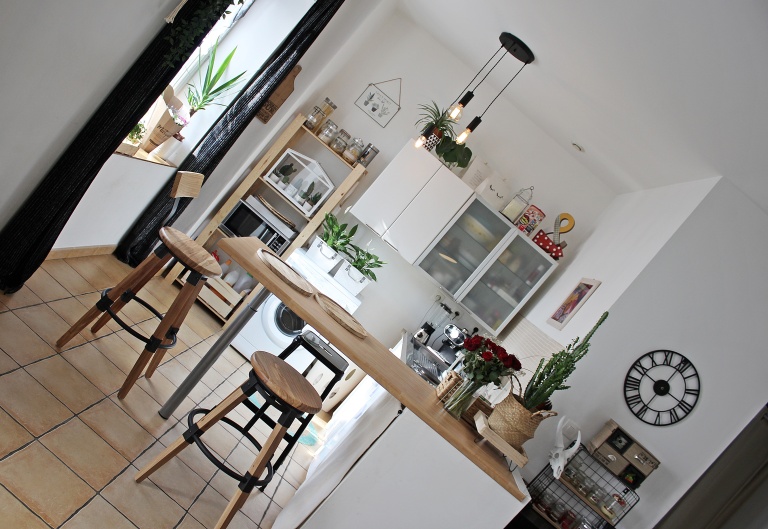 # Ola les filles, j’espère que vous allez bien ? Ce matin je suis très heureuse de vous présenter enfin ma cuisine, terminé !! Depuis notre aménagement, c’était la dernière « pièce » que je n’avais pas encore décoré, enfin je met ça entre guillemets puisque chez moi, cuisine et salon ne font qu’un ! Du coup, j’ai enfin finalisé le tout , avec encore et toujours cette ambiance industrielle que j’adore, et beaucoup de verdure ! Côté meubles, le bar étant déjà sur place et les étagères aussi , je n’avais pas grand chose à ajouter, si ce n’est ces deux tabourets de bar (ici et là) reçu dernièrement de la part du site Cult Furniture , ainsi que ce luminaire dont je suis folle !! C’est exactement ce que je voulais , je trouve que ça apporte un charme fou à la pièce !! J’ai choisi volontairement de dépareiller les tabourets, ça se fait de plus en plus en déco, et j’aime beaucoup le rendu ! Ils sont tout les deux en bois naturel et la qualité est dingue, rien à voir avec les meubles à bas-prix que j’avais jusqu’à présent ! Le luminaire lui aussi est superbe ! Pour la petite histoire , je cherchais partout des ampoules à filaments (toute différente) pour ce côté vintage que j’aime beaucoup, et j’ai trouvé celles çi chez Babou à un prix à défier toute concurrence : 5€ pièce, cherchez pas , vous ne trouverez pas moins chers ailleurs ! Ajoutez à tout ça beaucoup de verdure et des cagettes à légume en guise de rangement, je trouve que ça donne une chouette ambiance ! Par exemple, comme j’ai la machine à laver en plein milieu de la cuisine , j’ai trouvé sympa de l’habiller d’une caissette en métal avec des plantes à l’intérieur (ikea) , de même que mes produits d’entretien sont rangés dans une cagette à fruits et légumes ! Pour finir, je ne vous ai pas détailler toute la déco, mais par exemple, les sets de table en bois viennent de chez Action, ma machine à café expresso vient de chez Lidl, d’ailleurs ils proposent une chouette gamme de petit électroménager vraiment sympa! Mon blinder lui, vient de chez Babou . Il me semble que c’est tout ce que je ne vous avais pas encore présenté, mais si jamais quelque chose manque à l’appel, n »hésitez pas à me le demander ! J’espère que vous aimerez cette revue, j’ai presque fait le tour de mon notre appartement à présent, prochaine étape, la refonte du dressing, mais pas dessuite ! J’attends vos avis et commentaire, ENJOY les chéries !!