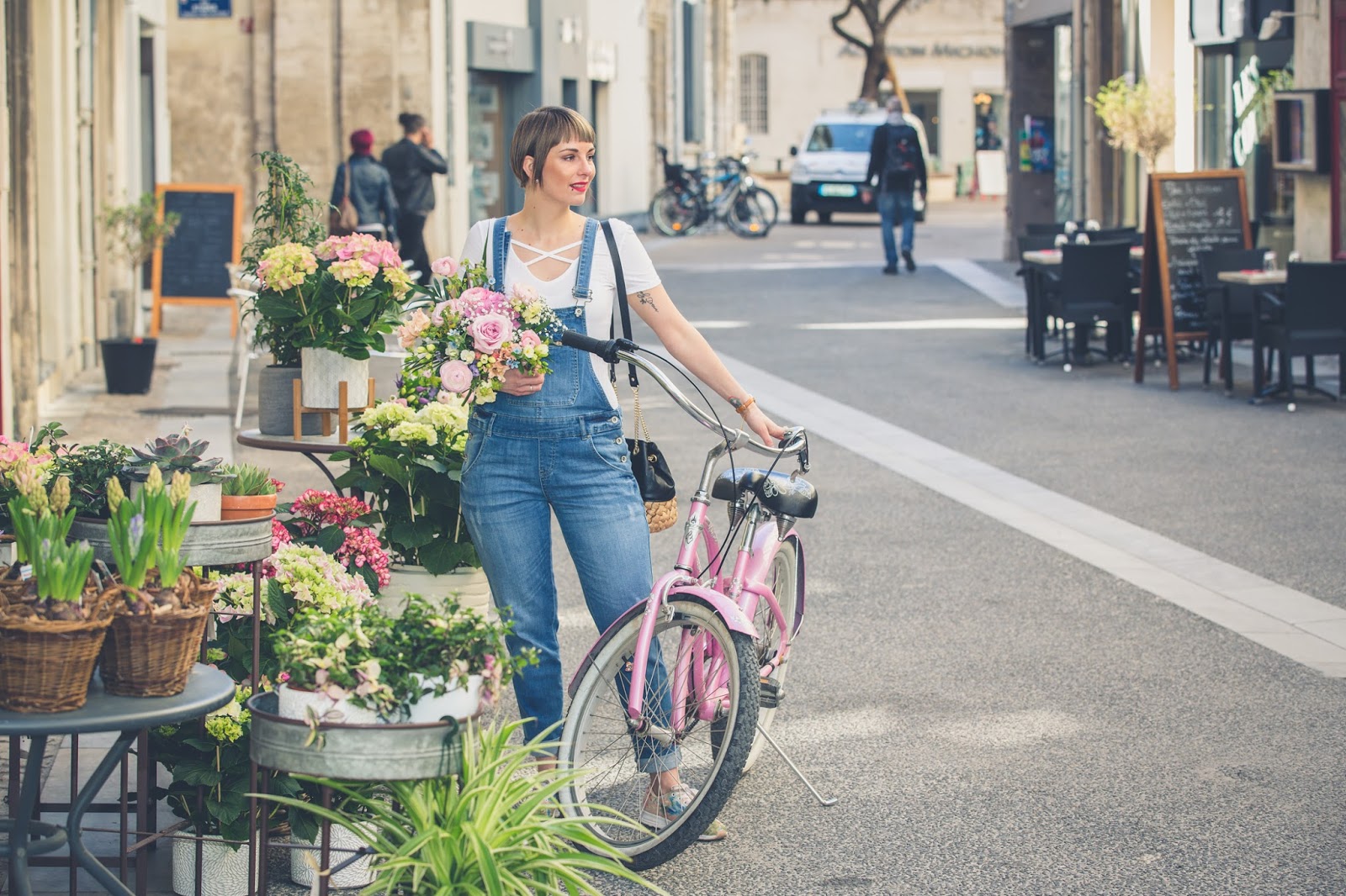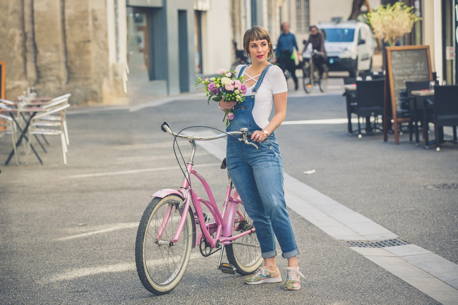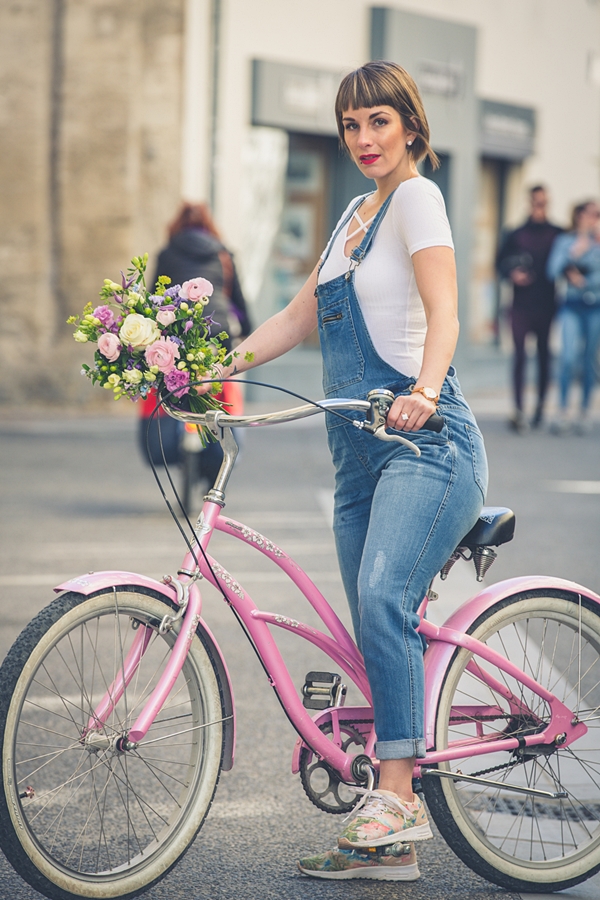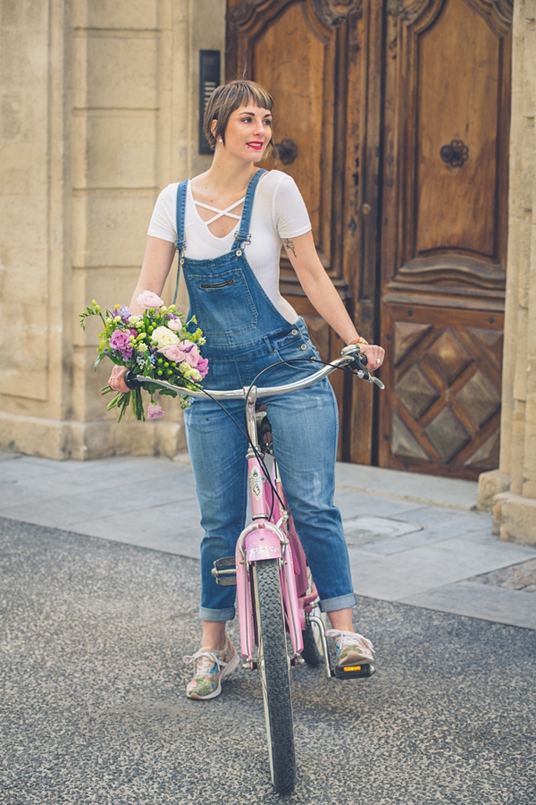 # Good mooorning les chéries! J’espère que vous allez bien ? Ce matin je vous retrouve avec un nouveau look et de superbes photos prisent la semaine dernière avec mon ami Jeremy Sinka. Ce jour là, nous étions de passage chez mon ami fleuriste A nos amours sur Avignon, dont je vous avais déjà parlé ICI , pour ce superbe shooting printanier en salopette svp ! Une chance pour nous d’avoir eu droit à une éclaircie le temps des photos, une heure après il pleuvait, et ça a duré plus d’une semaine ! J’ai pourtant invoqué, imploré le dieu du printemps mais rien à faire, il se laisse encore désirer ! Enfin bref, pour en venir à ce LOOK, j’ai totalement craqué sur cette salopette en jeans chez Camaieu ! Je n’en avais plus portée depuis toute gamine et je dois dire que c’est une pièce plutôt cool que j’adore porter ! Associé à une paire de sneakers fleuris (déjà vu ici) , je trouve le rendu carrément canon ! Biensûr, avec un vélo comme celui çi et de si jolies fleurs, le résultat , ne pouvait être que sympa , non ? Haha , trêve de plaisanterie, vous aimez ? La salopette, on valide ou on la laisse au placard ? J’attends vos avis et commentaires et vous dis à très vite les filles !! Ps: un grand merci à mon ami Jeremy pour ces sublimes clichés dont je ne me lasse pas et à Thierry pour son accueil et pour sa sympathie !!! Un fleuriste hors-norme, un artiste !