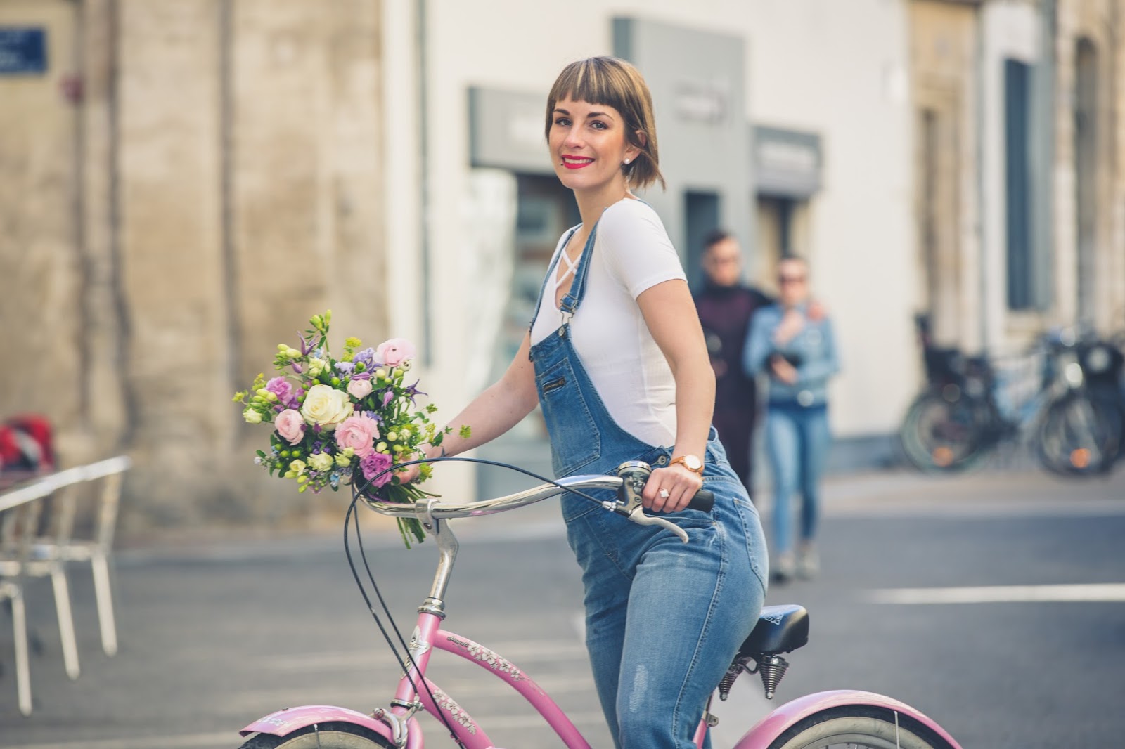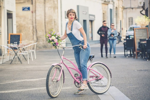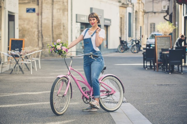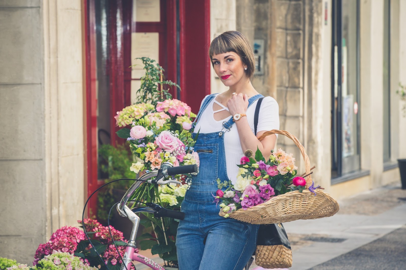 # Good mooorning les chéries! J’espère que vous allez bien ? Ce matin je vous retrouve avec un nouveau look et de superbes photos prisent la semaine dernière avec mon ami Jeremy Sinka. Ce jour là, nous étions de passage chez mon ami fleuriste A nos amours sur Avignon, dont je vous avais déjà parlé ICI , pour ce superbe shooting printanier en salopette svp ! Une chance pour nous d’avoir eu droit à une éclaircie le temps des photos, une heure après il pleuvait, et ça a duré plus d’une semaine ! J’ai pourtant invoqué, imploré le dieu du printemps mais rien à faire, il se laisse encore désirer ! Enfin bref, pour en venir à ce LOOK, j’ai totalement craqué sur cette salopette en jeans chez Camaieu ! Je n’en avais plus portée depuis toute gamine et je dois dire que c’est une pièce plutôt cool que j’adore porter ! Associé à une paire de sneakers fleuris (déjà vu ici) , je trouve le rendu carrément canon ! Biensûr, avec un vélo comme celui çi et de si jolies fleurs, le résultat , ne pouvait être que sympa , non ? Haha , trêve de plaisanterie, vous aimez ? La salopette, on valide ou on la laisse au placard ? J’attends vos avis et commentaires et vous dis à très vite les filles !! Ps: un grand merci à mon ami Jeremy pour ces sublimes clichés dont je ne me lasse pas et à Thierry pour son accueil et pour sa sympathie !!! Un fleuriste hors-norme, un artiste !