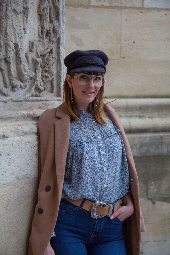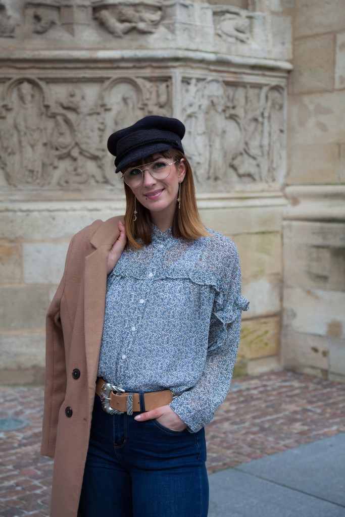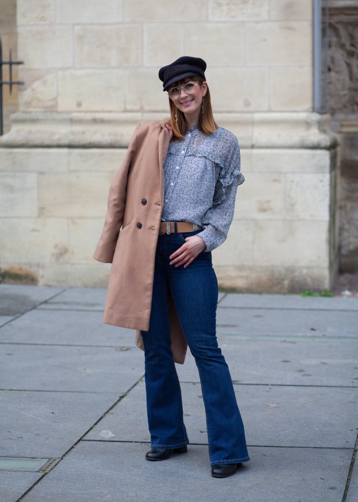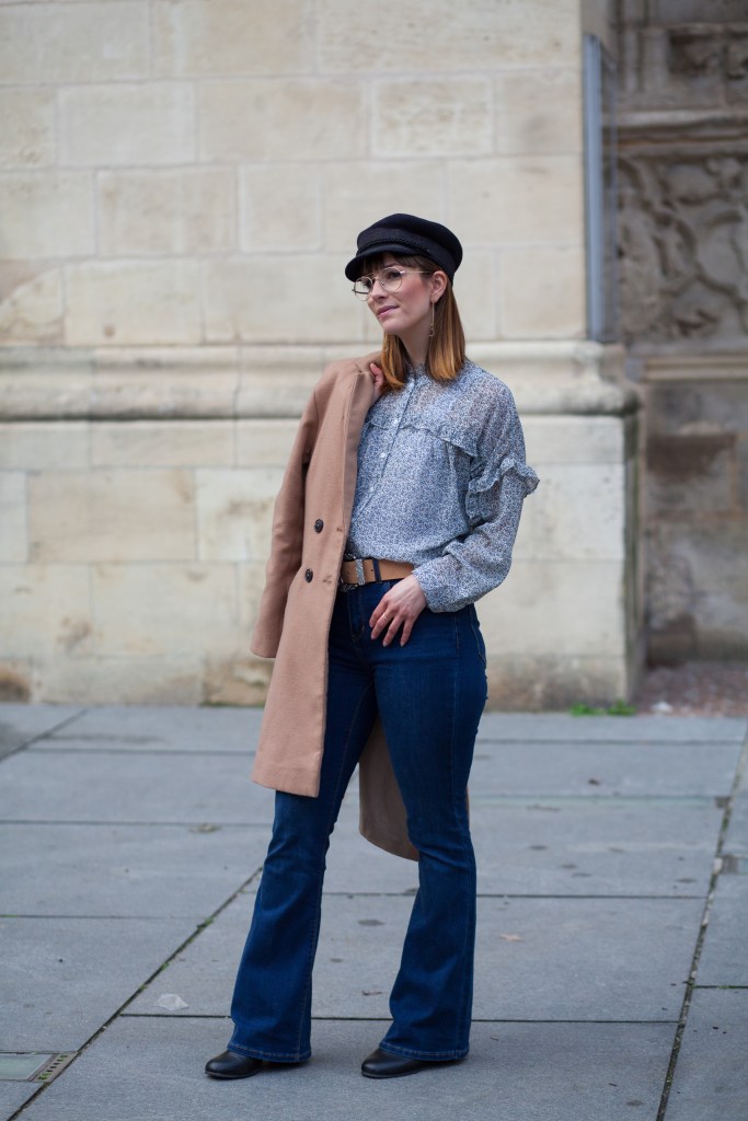 Pour cette tenue, j’ai craqué sur un chemisier en voile fluide imprimé fleuri, dans un style très romantique. Une jolie pièce que j’ai décidé d’associer à un jeans bootcut pour un look moderne, spécial ST VALENTIN. Côté accessoires, une grosse ceinture à boucle (déjà vue ici là ou là ) ma casquette que vous commencez à bien connaitre et pour finaliser ce look, mon manteau beige en laine (devenu un incontournable de mon dressing) et une paire de boots à talons.