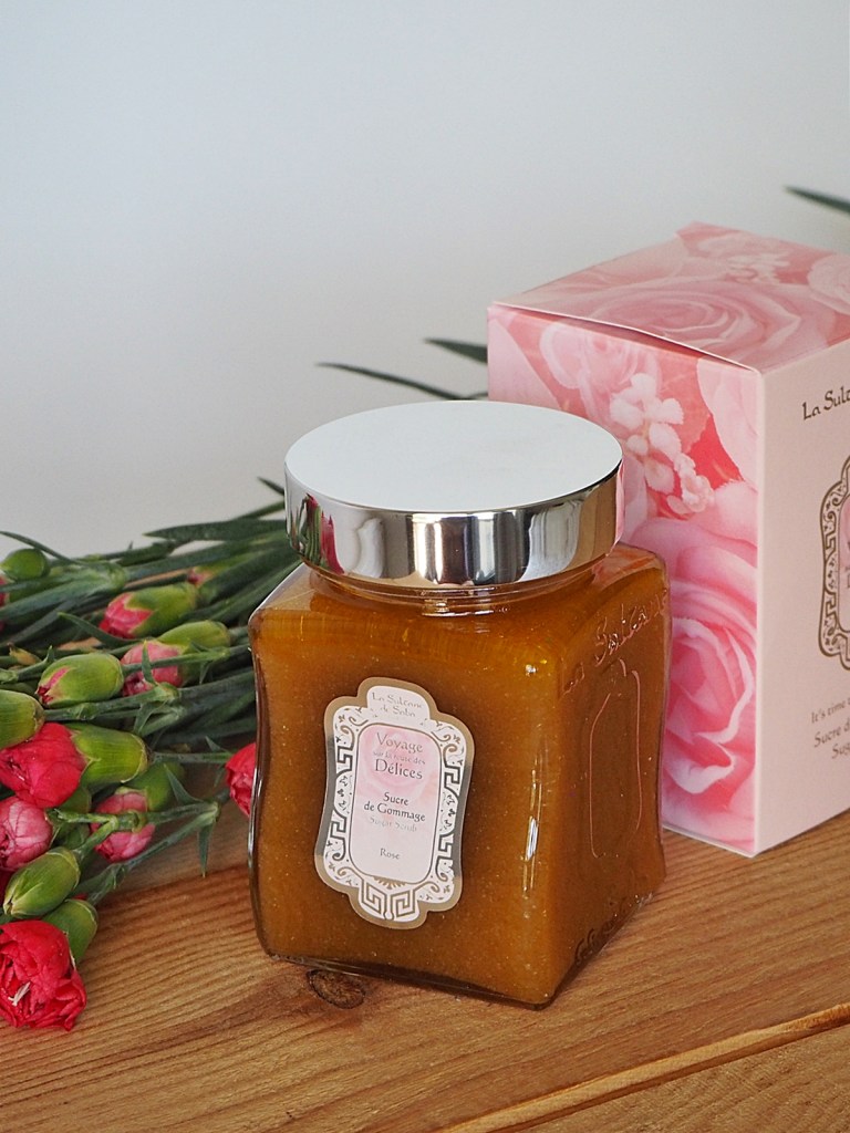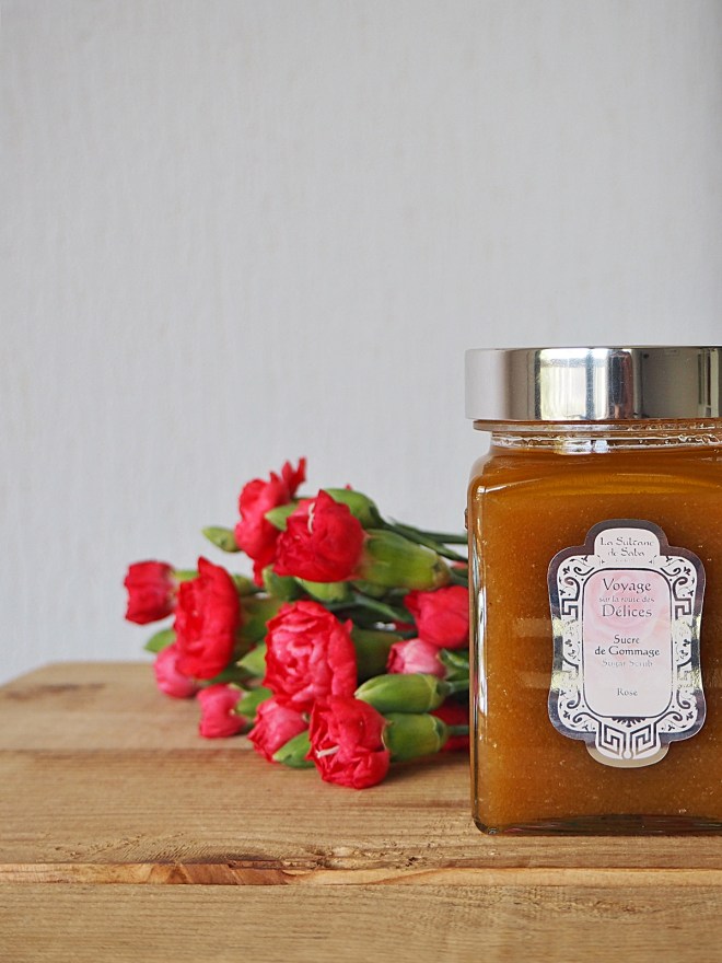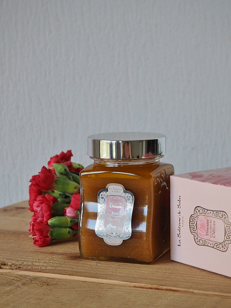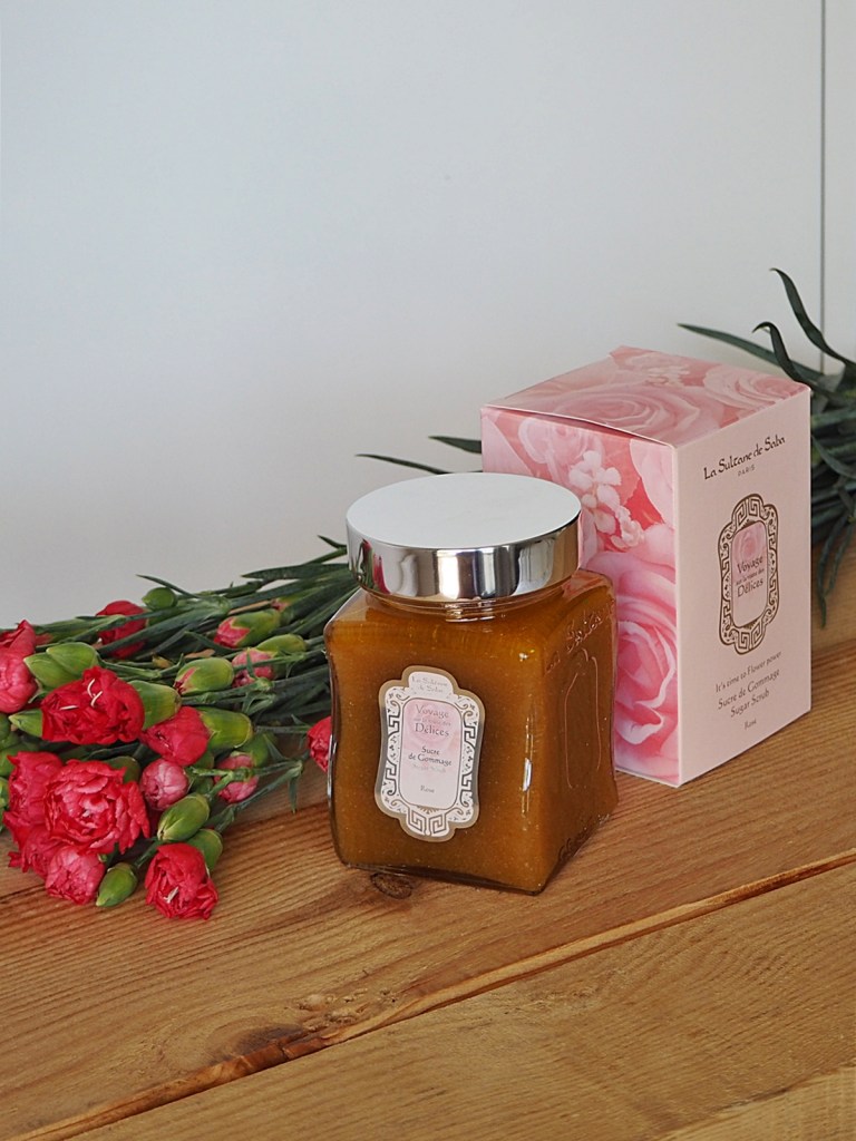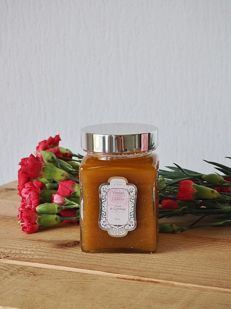 Pour ma part, j’ai opté pour le sucre de gommage. Il est composé de sucre de canne et d’huile de beauté délicatement parfumée à la Rose. Sa texture est un enchantement et je pèse mes mots ! Un mélange de sucre et d’huiles végétales naturelles. Il en résulte un gommage biphasé à la texture granitée et fondante qui invite à la dégustation. Je pensais que ce ne serait pas hyper pratique à l’utilisation, l’huile restant en surface, pourtant, il suffit de plonger ses doigts dans la partie solide pour obtenir le mélange adéquat. Les grains de sucre, ni trop épais, ni trop abrasifs gomment parfaitement les peaux mortes et désincrustent les impuretés sans pour autant agresser ma peau. L’huile végétale, quant à elle, nourrit la peau intensément.