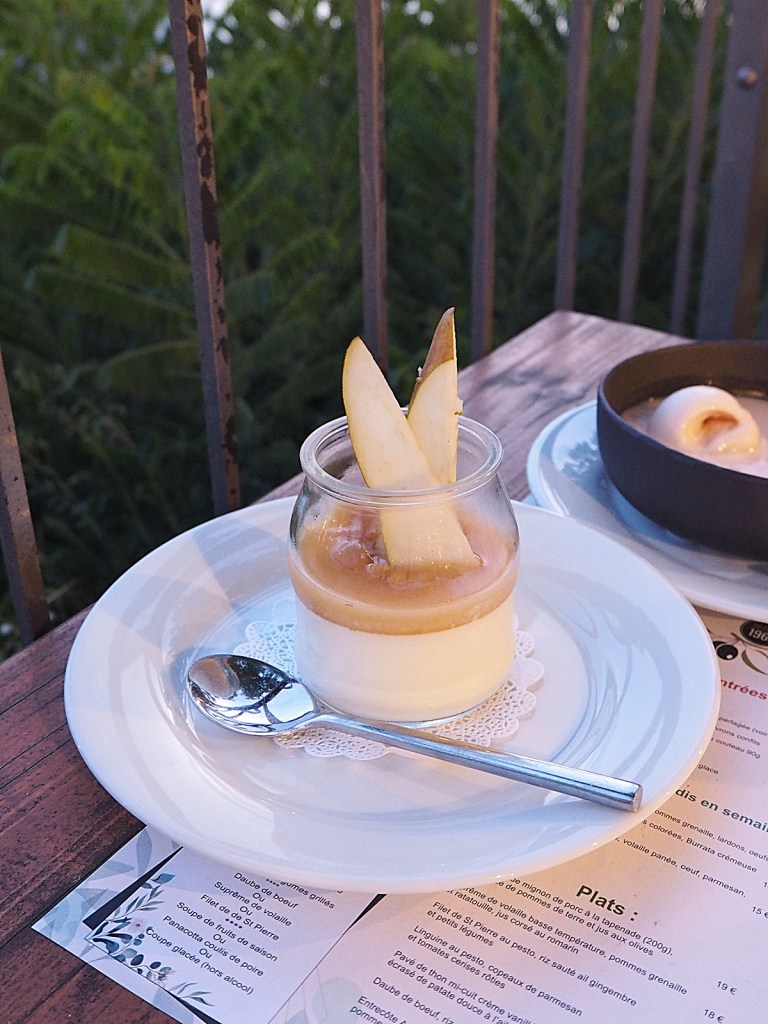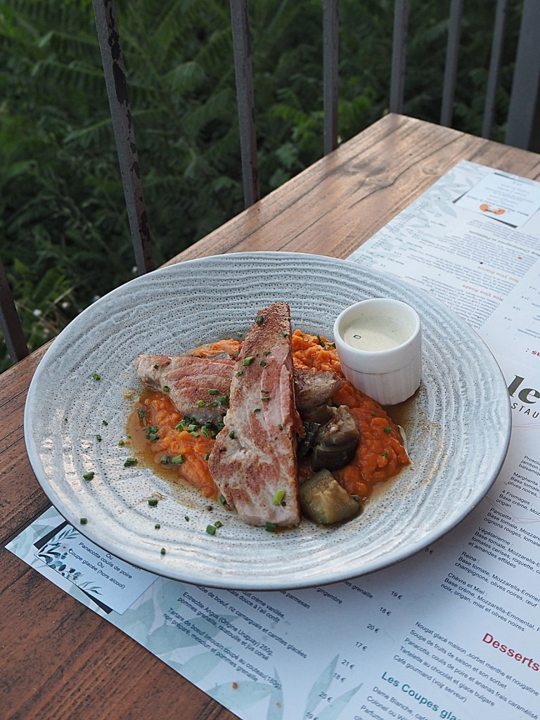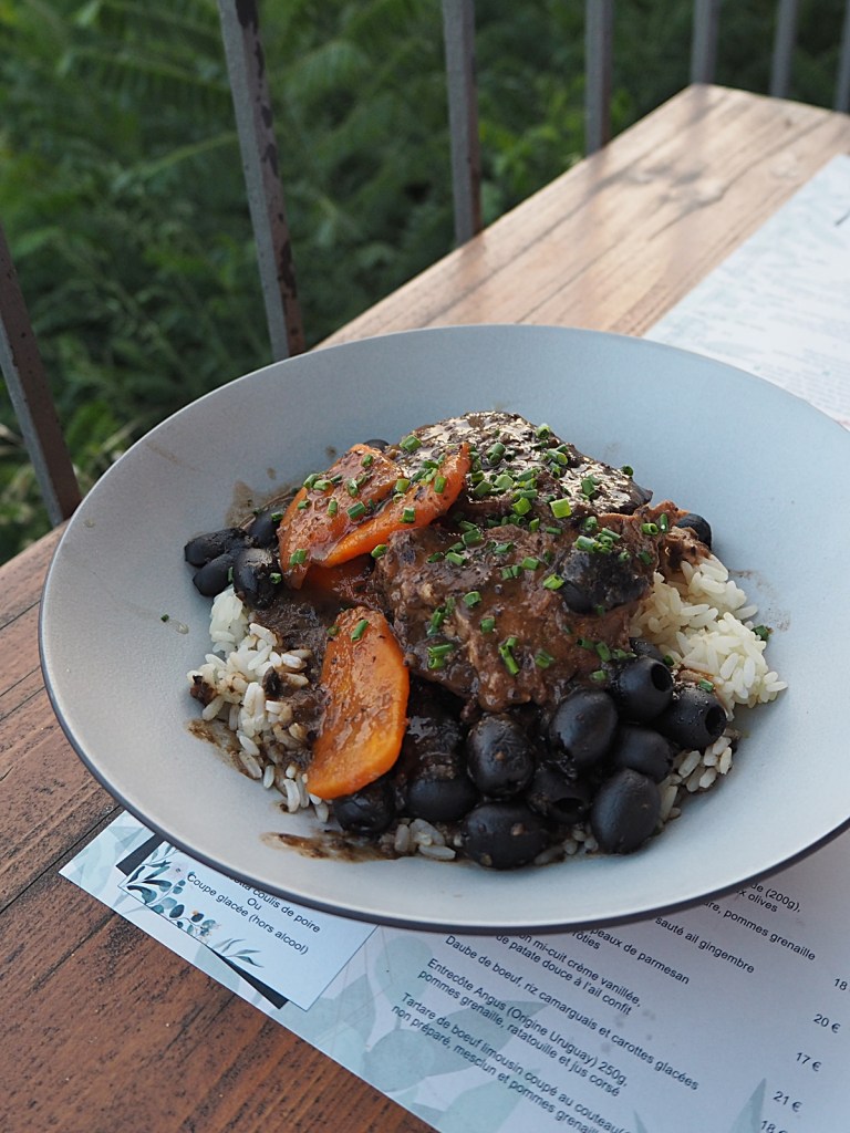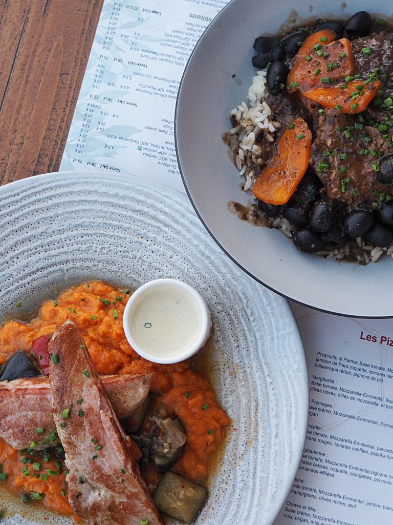 À la carte, de vieilles recettes provençales (grillades de viandes et de poissons) et pizzas au feu de bois. La cuisine est faite-maison, à partir d’ingrédients régionaux soigneusement sélectionnés, frais et de saisons, de la tapenade, en passant par les sauces et accompagnements, les légumes et les desserts…tout est cuisiné avec patience et passion. Le service est pro, convivial et plutôt rapide, au vue du monde qu’il y avait ce jour là. J’ai opté pour la petite friture du cabanon en entrée, j’adore ça et je n’en avais pas manger depuis des lustres! Le choix de Renaud s’est orienté vers une tarte biscuitée à la brousse et poivrons confits. Puis, en plat, une daube de bœuf accompagné de riz de Camargue et carottes glacées pour ma part, et un pavé de thon accompagné d’une crème vanillée (original) et d’un écrasé de patate douce à l’ail confit pour monsieur. Tout était délicieux, un sans faute! La viande est ultra fondante, la pavé de thon également ! En dessert, nous nous sommes partagé une soupe de pêches fraîches accompagnée d’un sorbet au porto, et une panacotta au coulis de poire et ananas frais. Là aussi, un délice, cela change clairement des desserts industriels que l’on retrouve souvent un peu partout. La prochaine fois, j’opterai à coup sûr pour une pizza (il parait qu’elles sont excellentes) et pour le nougat glacé maison en dessert, qui lui aussi me faisait envie.