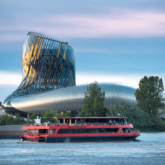 Le départ de cette croisière sur la Garonne se fait au niveau du quai des Chartrons. Nous parcourons le port de la Lune de Bordeaux et ses façades classées au patrimoine mondial de l’UNESCO jusqu’au Pont de pierre. De là, demi-tour en direction du Pont Chaban-Delmas, de la Cité du Vin, puis nous passons sous le Pont d’Aquitaine, jusqu’à l’estuaire de la Garonne.