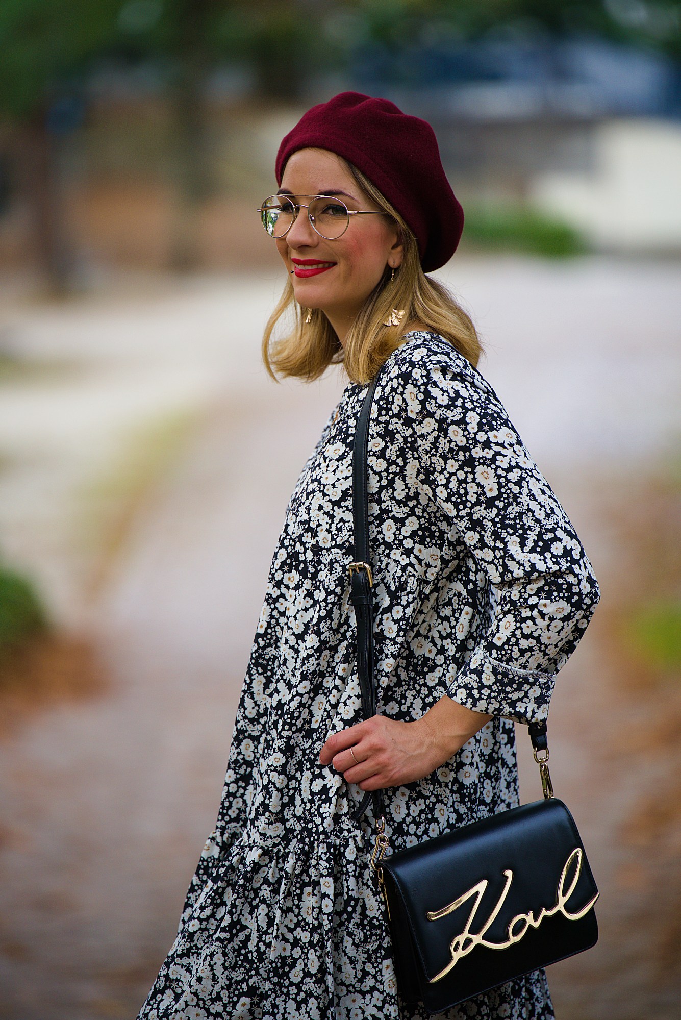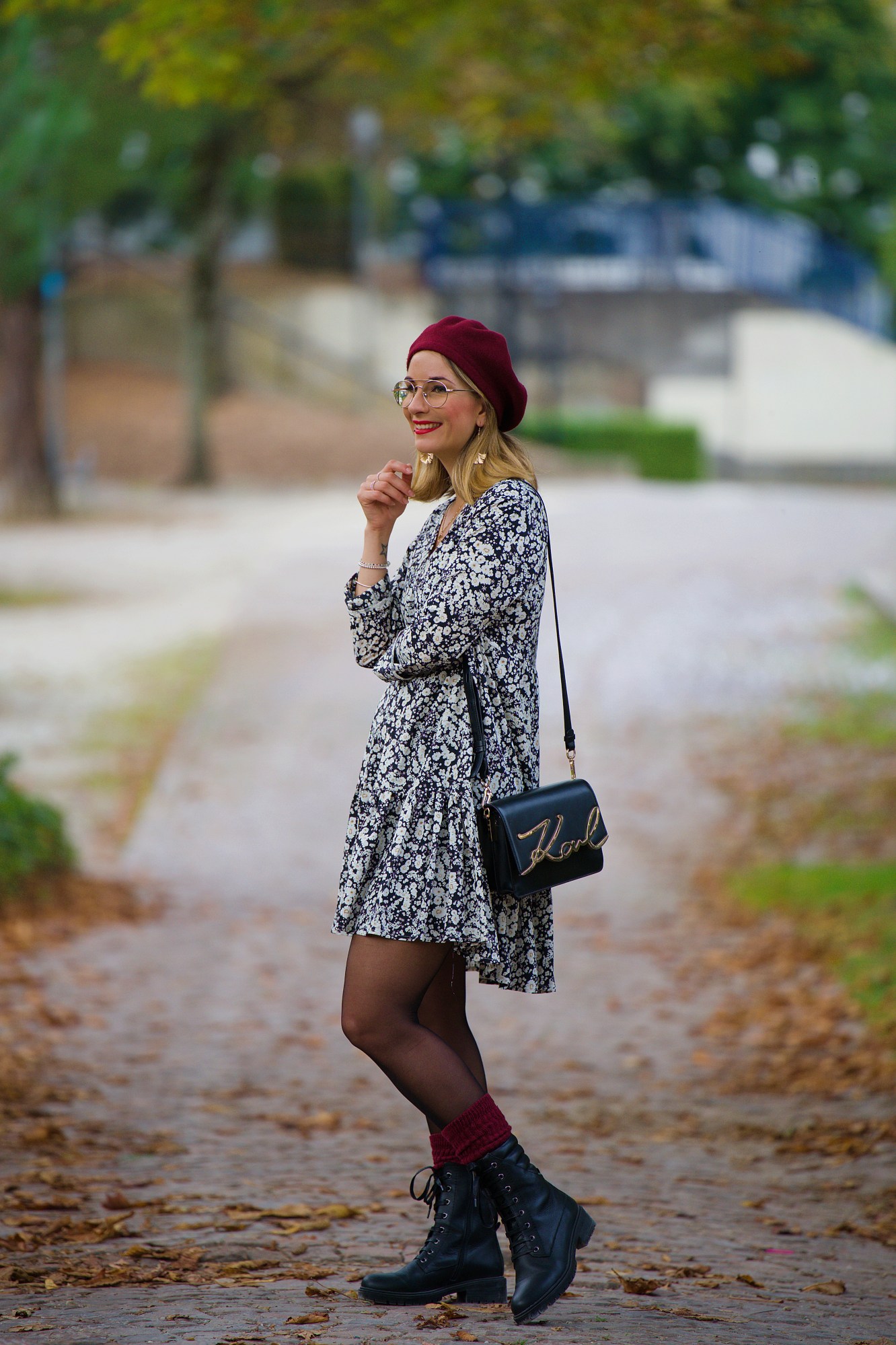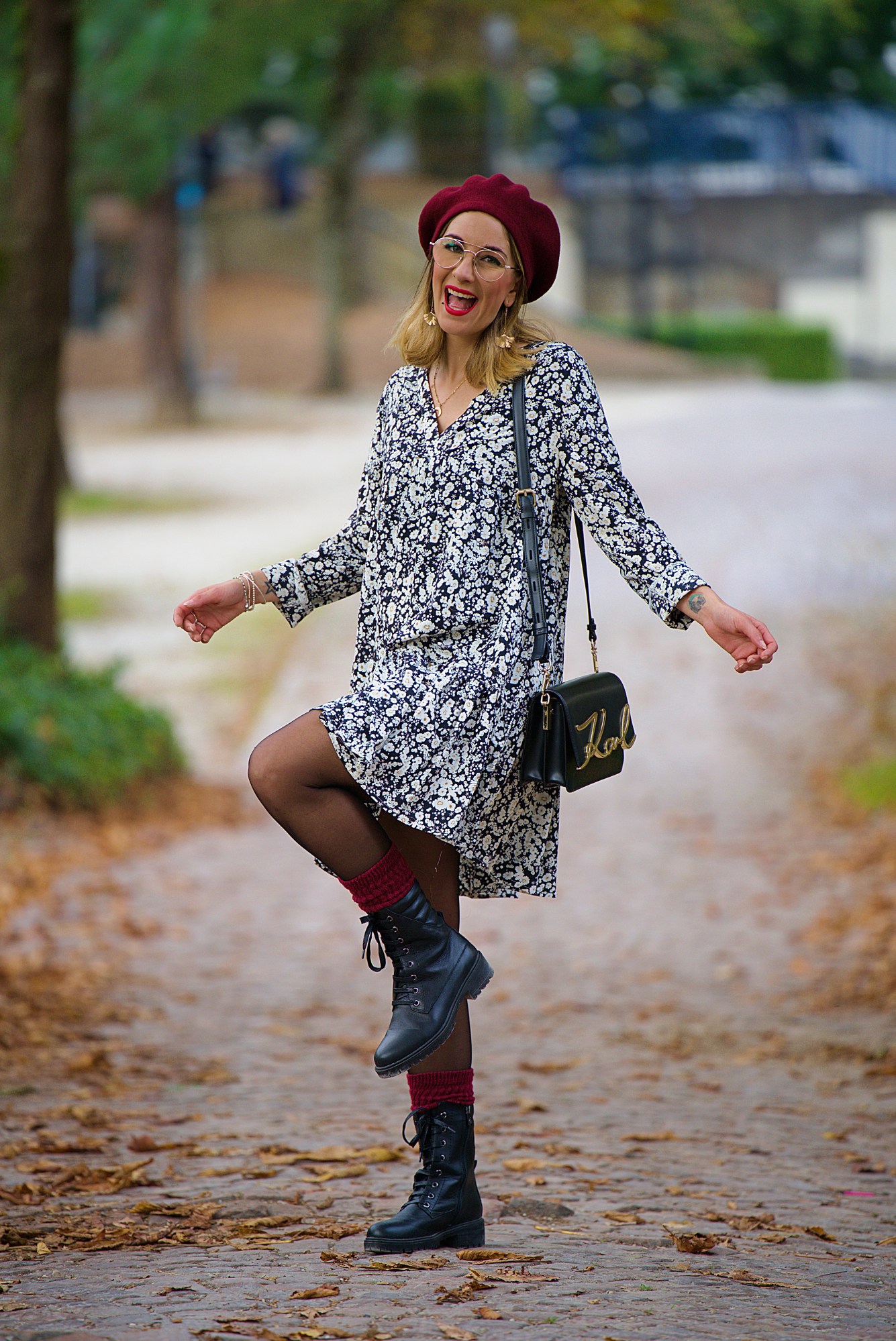 Pour notre tenue du jour par exemple, j’ai opté pour une robe à fleurs sur l’Eshop Sorelle, c’est totalement le genre de robe de mi-saison que j’adore porter avec une paire de collant et des boots, pour un look légèrement rock ! Côté accessoires, mes boots esprit motarde premièrement, parlons-en ! C’est le modèle AMUKO de chez Emilie Karston, elles me rappellent un peu celles que je portais plus jeune, je les adore! Elles sont hyper confortable et de très bonnes qualité (cuir de veau). Je les ai pimpé avec des chaussettes hautes rouges, assorties à mon béret du jour ! C’est le petit + de ce look, vous ne trouvez pas ? Pour terminer, mon sac KARL, que j’ai enfin ressortie des cartons (plus d’un an après mon déménagement il était temps non??) et qui finalise parfaitement cette tenue, avec classe!