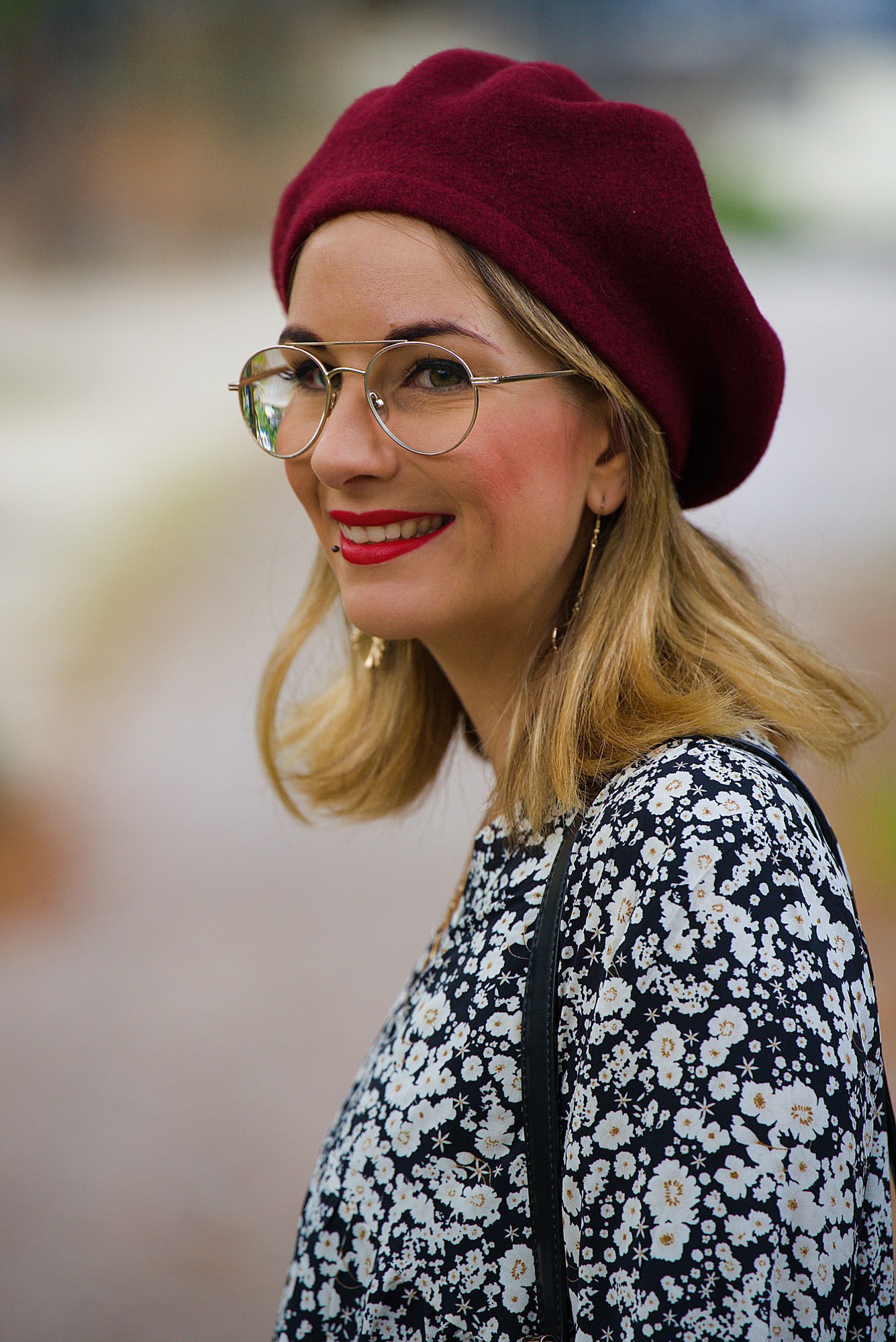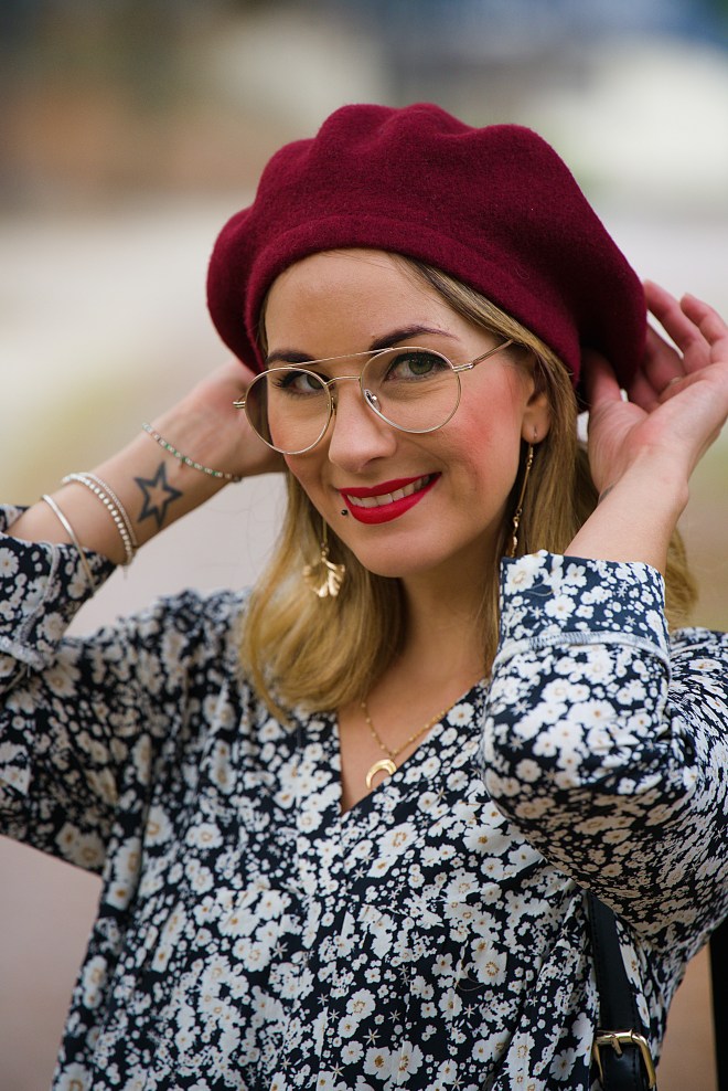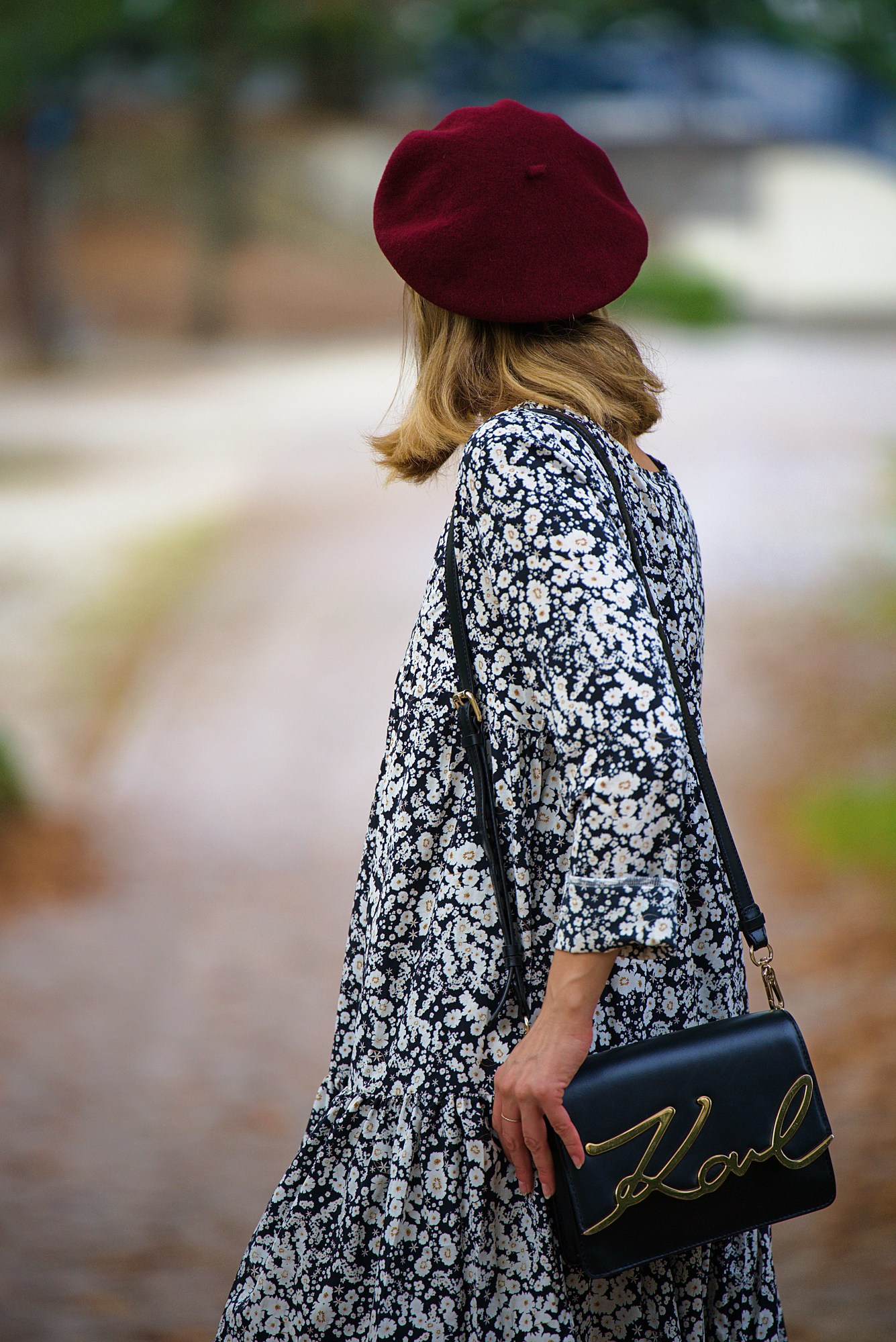 Pour notre tenue du jour par exemple, j’ai opté pour une robe à fleurs sur l’Eshop Sorelle, c’est totalement le genre de robe de mi-saison que j’adore porter avec une paire de collant et des boots, pour un look légèrement rock ! Côté accessoires, mes boots esprit motarde premièrement, parlons-en ! C’est le modèle AMUKO de chez Emilie Karston, elles me rappellent un peu celles que je portais plus jeune, je les adore! Elles sont hyper confortable et de très bonnes qualité (cuir de veau). Je les ai pimpé avec des chaussettes hautes rouges, assorties à mon béret du jour ! C’est le petit + de ce look, vous ne trouvez pas ? Pour terminer, mon sac KARL, que j’ai enfin ressortie des cartons (plus d’un an après mon déménagement il était temps non??) et qui finalise parfaitement cette tenue, avec classe!