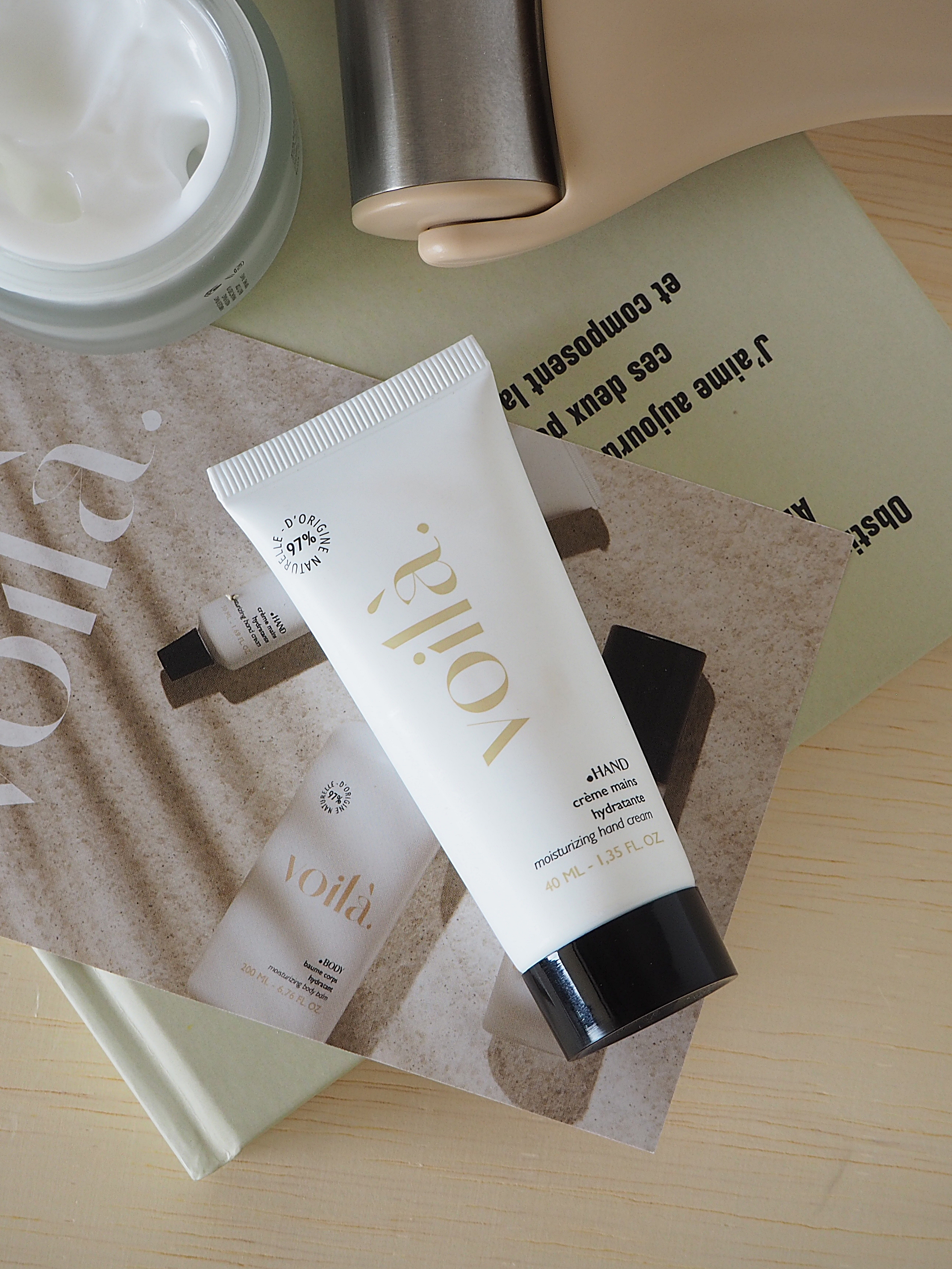 La marque se compose de soins pour la peau aux notes gourmandes de fleur d’oranger : Crème hydratante pour le jour et la nuit, baume corps, gommage corps, crème et patch pour le contour des yeux, crème pour les mains et dernièrement, une huile sèche qui sera parfaite pour les beaux jours à venir. Les premiers produits Voilà ont été pensés comme une ode à la simplicité, et élaborés avec des laboratoires français experts en la matière. Les mots d’ordre de la marque sont donc : Retour aux basiques, hydratation et des produits formulés avec 95% d’ingrédients d’origine naturelle au minimum. Des basiques beauté, simples et efficaces, végan, fabriqués en France, le tout pour une peau réparée, nourrie et sublimée et une expérience olfactive sensorielle très agréable.