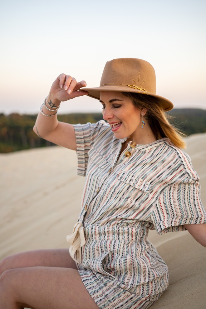 Pour en revenir à mon chapeau, et plus particulierement à la marque Monstro Diva, c’est Alice qui se cache derrière les superbes bijoux et chapeaux que l’on retrouve sur le site! Diplômée de gemmologie, elle aime les belles pierres et les choisi donc avec grand soin pour en faire de superbes bijoux et les utilise même jusque sur ses chapeaux ! Le chapeau que je vous présente aujourd’hui est en feutre 100% laine, agrémenté d’un ornement doré et brodé à la main de fil d’or. C’est une nouvelle version du modèle Gatsby, une série limitée! C’est une pièce absolument magnifique est intemporelle, qui encore une fois m’accompagnera tout l’été!