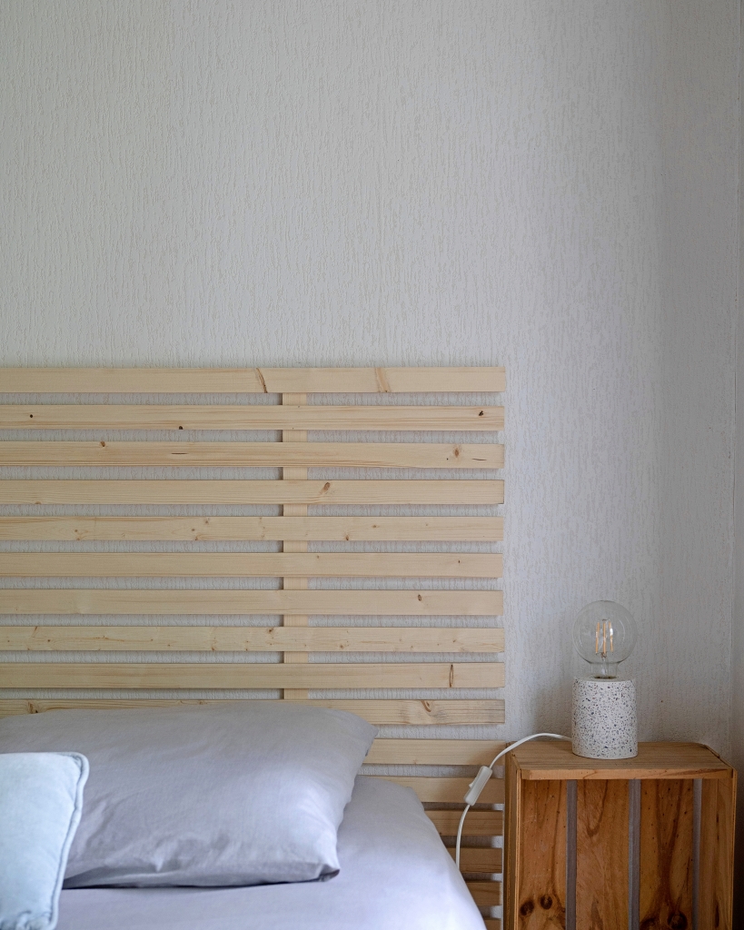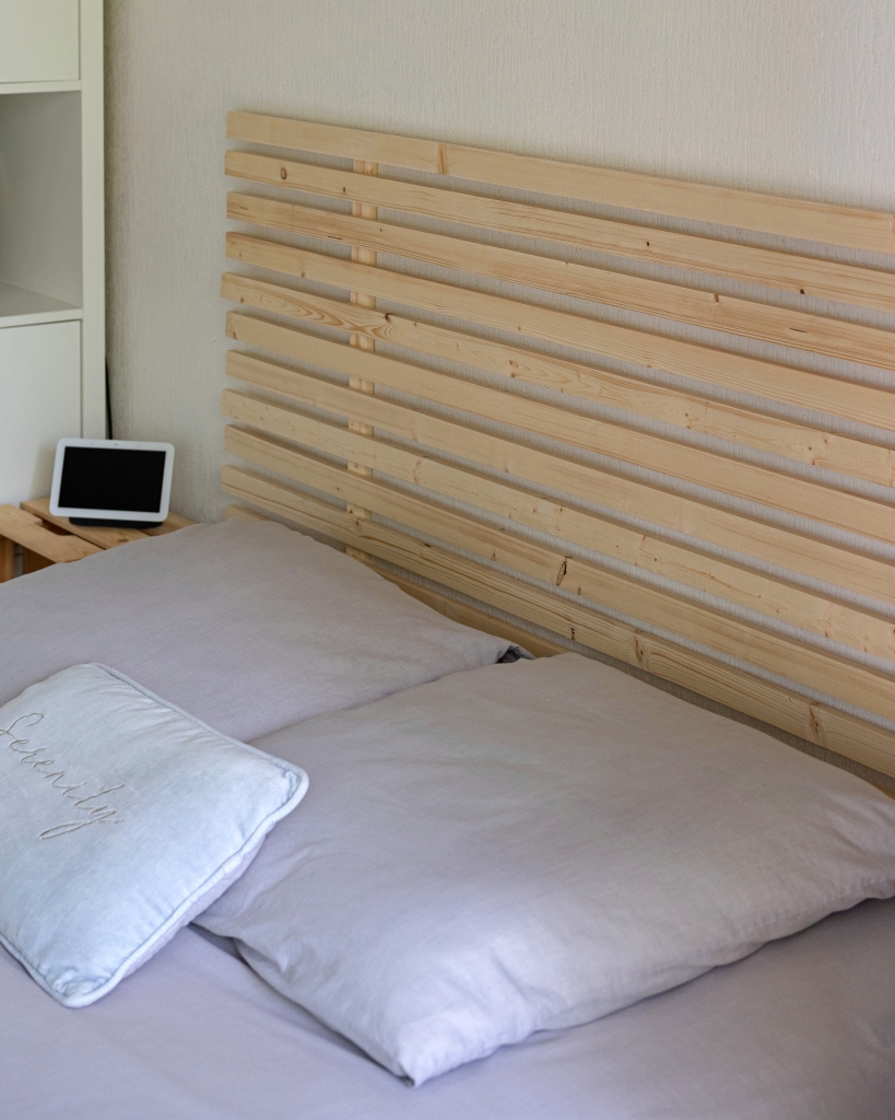 5 : Tadaaam une tête de lit maison, faite avec amour !! Dans notre cas, nous l’avons simplement calé derrière le lit qui suffit à lui seul à maintenir la tête de lit, mais vous pouvez choisi de fixer la tête de lit au mur avec des chevilles : 1 par tasseau vertical.