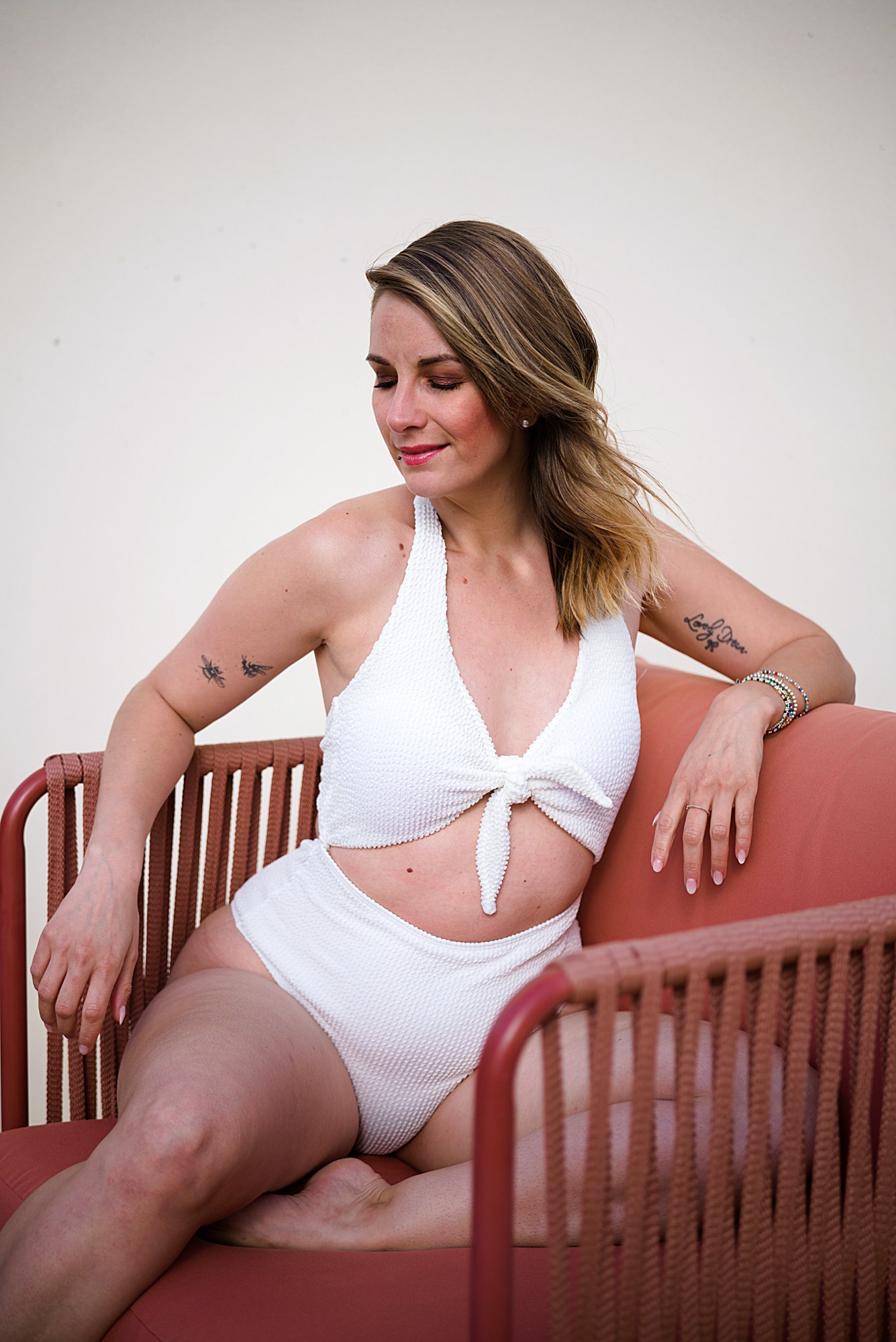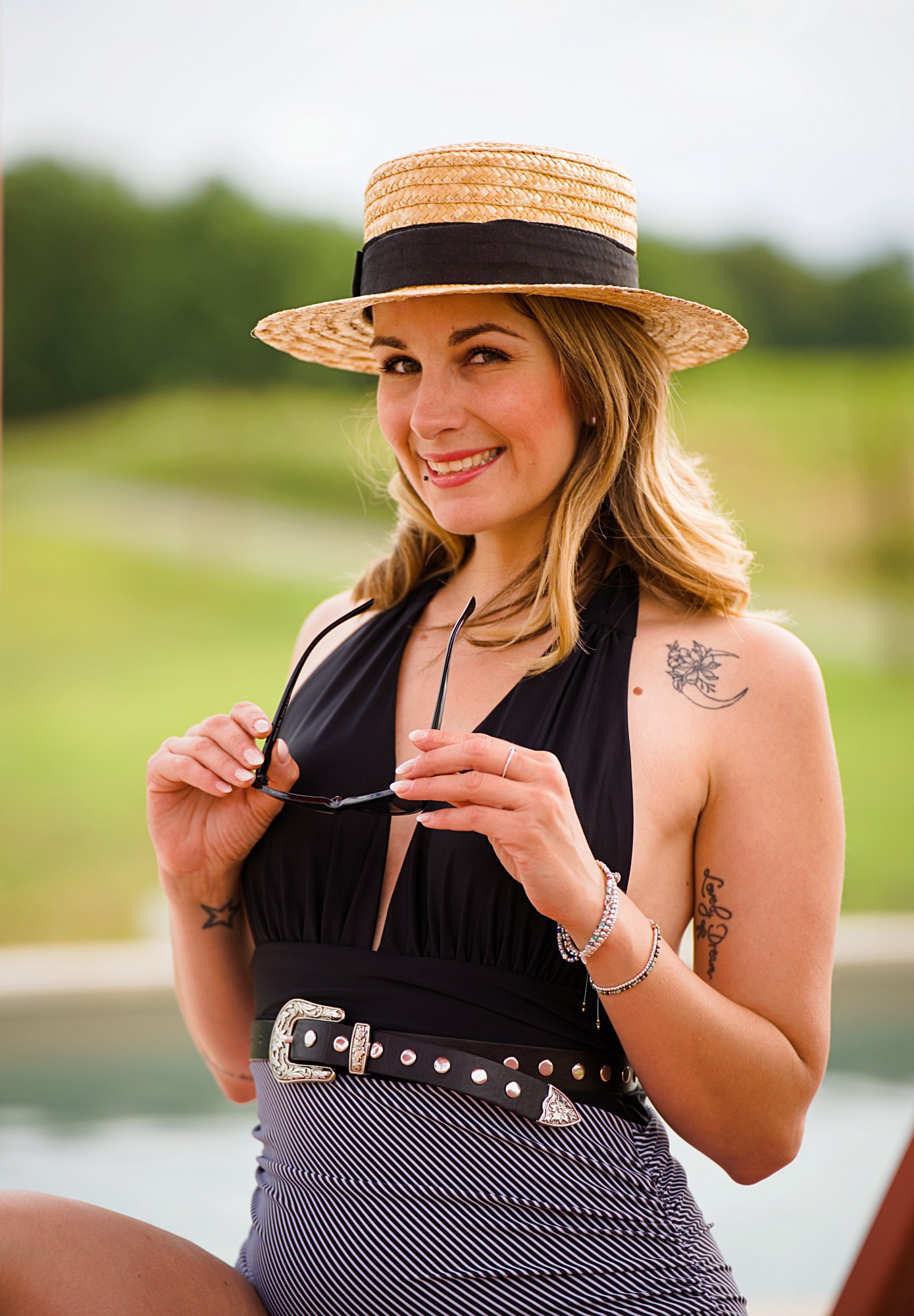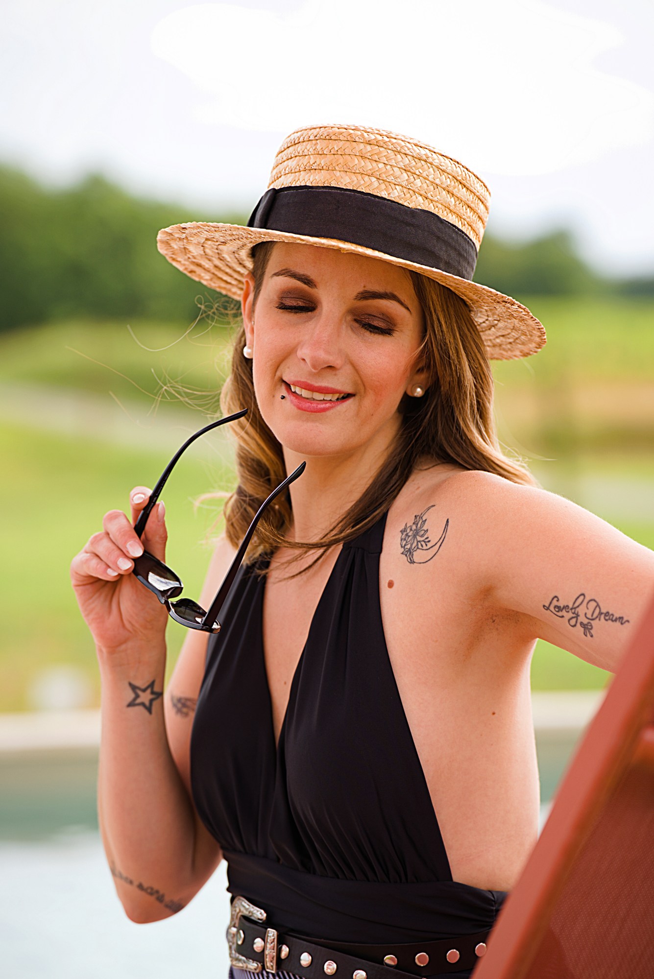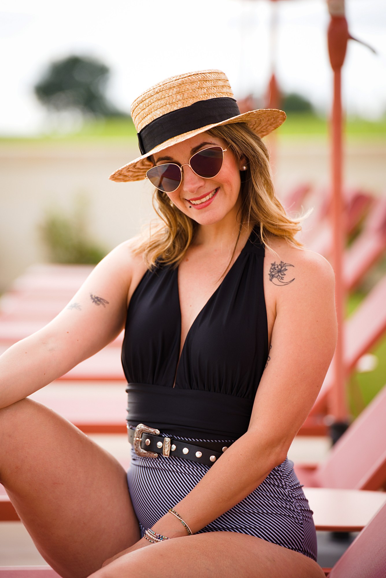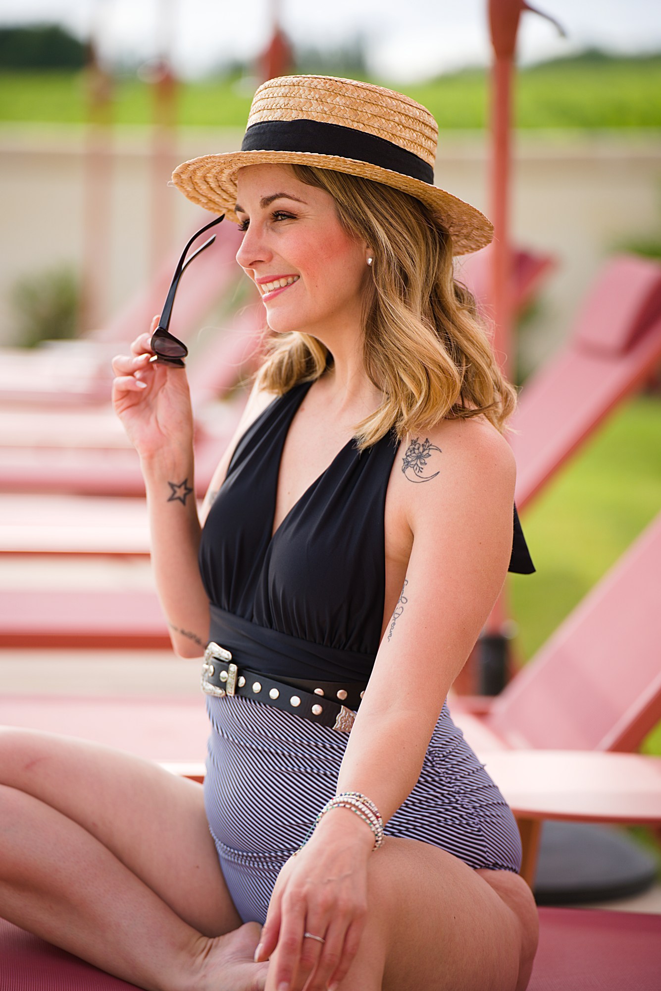 A cette occasion, j’ai eu l’honneur d’être reçue au sein du Château Fage, près de Bordeaux et de vous shooter ces deux pièces au bord de la piscine des lieux. Une sublime piscine de 25 mètres de long, avec vue sur les vignes! On est bien d’accord, l’endroit est magnifique ! – je vous en reparle dans un prochain article. Mon choix cette année s’est porté sur ces deux maillots : Un monokini blanc qui est l’alternative idéale entre le bikini et le une-pièce et qui affine la silhouette à la perfection. Vous connaissez mes complexes et mon problèmes de ventre gonflé, je choisi toujours mes maillots en fonction de cela et bien entendu, toujours des culottes tailles hautes! J’adore également sa matière texturée! Mon second choix, un maillot de bain une-pièce esprit foulard, avec culotte gainante et agrémenté d’une ceinture élastique large qui sublime la silhouette. Celui-ci a un petit côté « vintage » que j’adore, vous ne trouvez pas ? Il me fait penser aux maillots que portaient les pin-ups dans les années 50/70 !!
