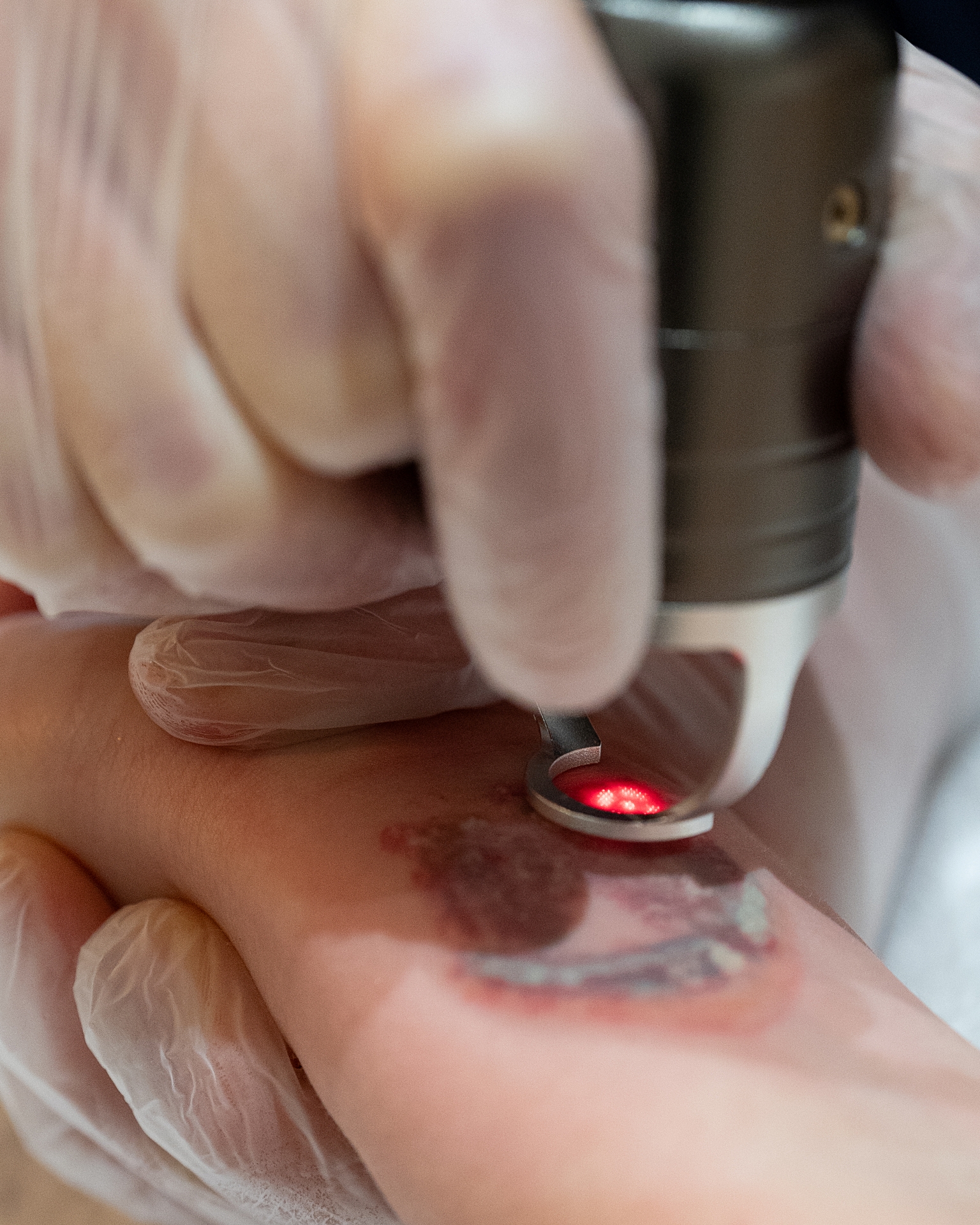 – Et ensuite ? Le laser coagule les protéines de surface, donc c’est rouge et boursouflé, et ça peut saigner par endroit. On tartine la zone traitée avec une crème cicatrisante pendant une semaine environ. La zone peut rester sensible quelques jours, et de petites croûtes vont tomber dans les jours qui suivent. On peut aussi avoir des cloques, qu’il ne faut surtout pas percer. Une crème cicatrisante voir antibiotique vous sera prescrite par le médecin en fin de séance.