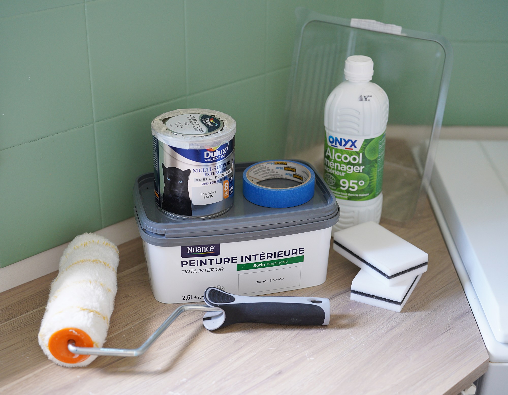 Du rebouche trou + spatule + papier ponce, du scotch de marquage , 1 perche + 1 rouleau + 1 bac pour la peinture blanche, 1 petit rouleau + bac pour la crédence, 2,5L de peinture blanche/satiné, un cutter enlève Joint , 1L d’alcool ménager pour lessiver la crédence, 0,5L de peinture verte (faite sur mesure) , 1 tube de silicone prêt à l’emploi pour refaire le joint de la crédence , des tasseaux en bois pour le support mural , un pistolet + bâton de colle. J’ai trouvé les lettres en bois chez Action, sinon sur Amazon.
