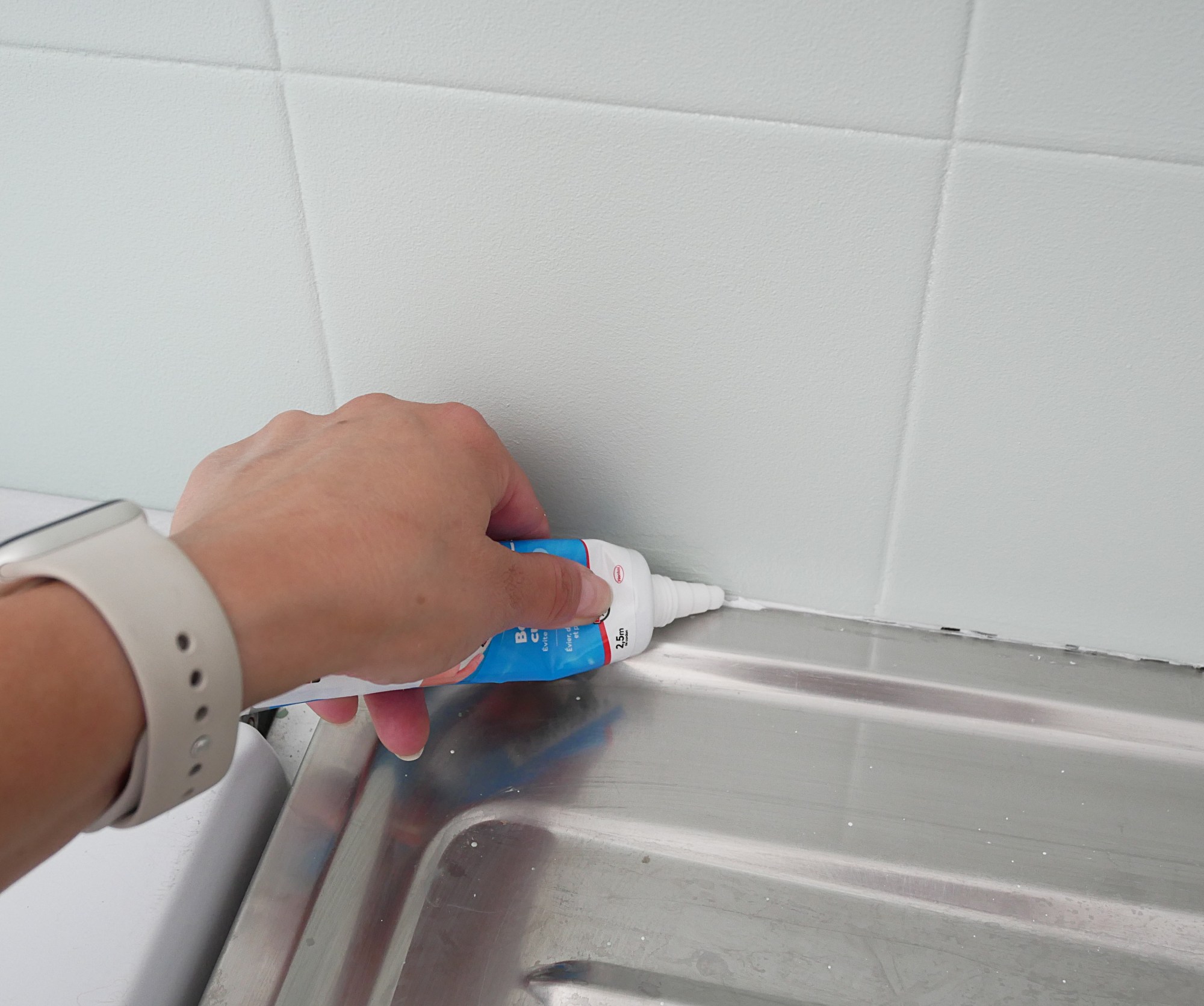 La première étape était de vider complètement la cuisine. Ça peut sembler anodin, mais enlever chaque petit ustensile et vider les placards a déjà donné un petit coup de frais à la pièce. C’était aussi l’occasion de faire un peu de tri. Adieu les vieilleries inutiles ! Ensuite, il a fallu reboucher les trous aux murs. Ce n’est pas la partie la plus fun, mais tellement nécessaire. Les murs étaient vraiment sales avec plusieurs trous, c’était donc indispensable pour obtenir une belle surface lisse. Avant d’attaquer la peinture, j’ai scotché tous les bords des murs. C’est l’étape cruciale pour éviter les bavures et obtenir des lignes bien nettes. Et puis, viens le moment tant attendu : la peinture blanche ! J’ai choisi un blanc satiné qui a instantanément illuminé la pièce. C’était magique de voir comment cette simple touche de blanc pouvait transformer l’espace. Ensuite, j’ai enlevé le vieux joint de l’évier. Une étape un peu fastidieuse mais nécessaire pour repeindre la crédence afin d’obtenir un rendu propre et net.