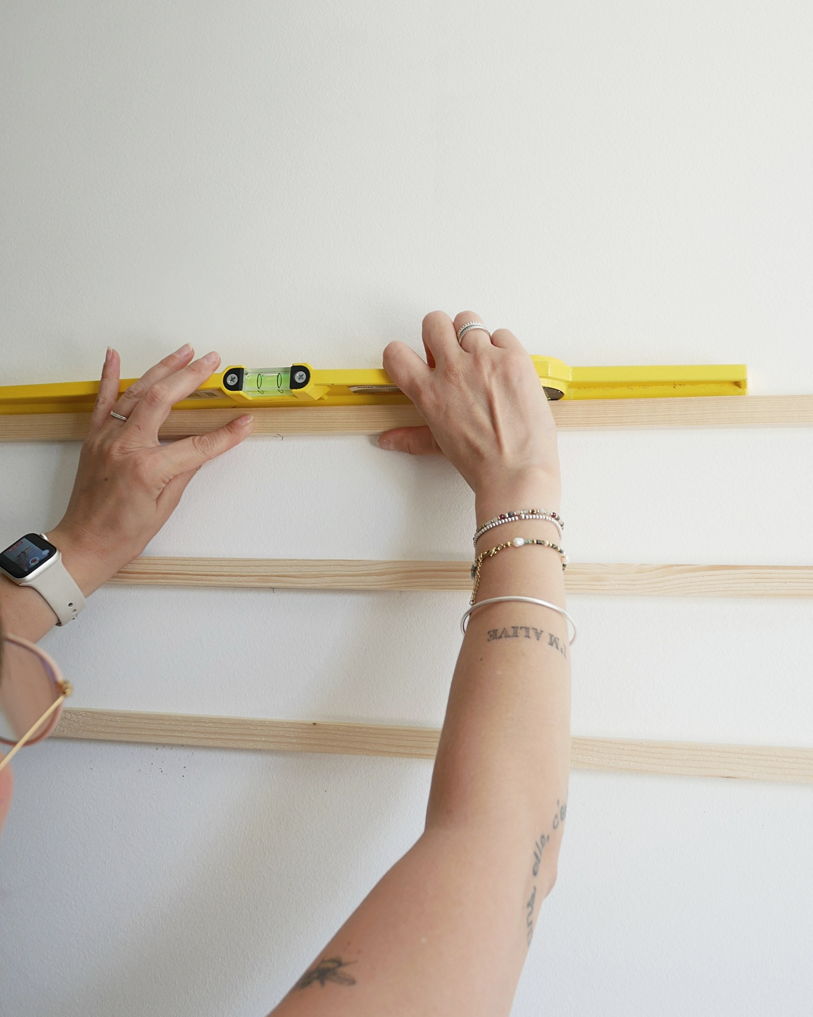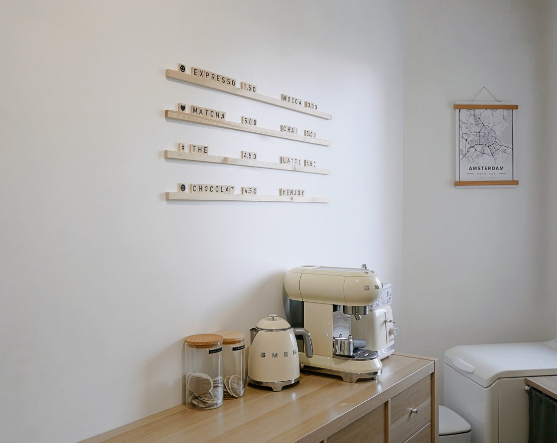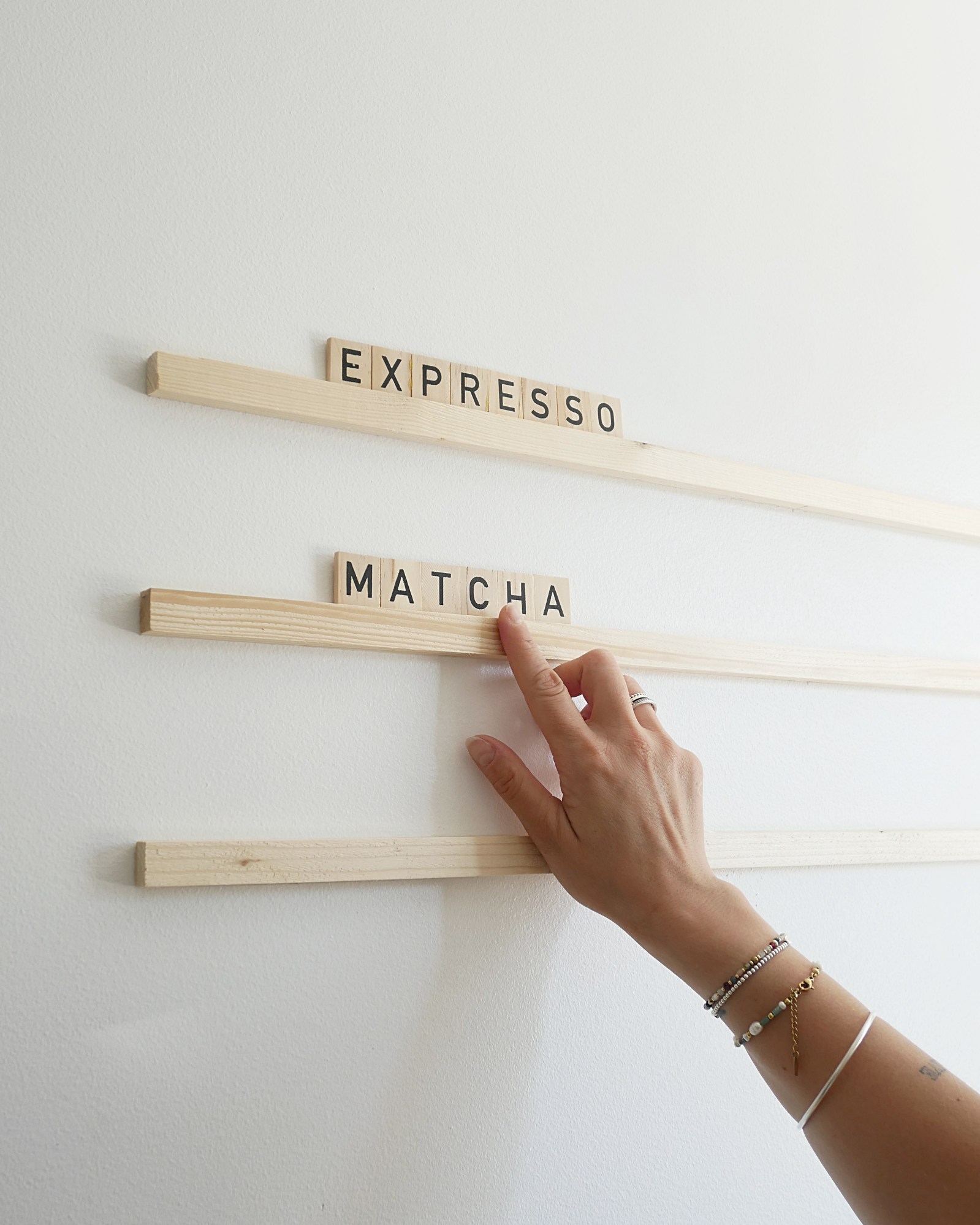Et maintenant, passons à l’étape que j’attendais avec le plus d’impatience : la création de mon coin café ! J’ai installé des tasseaux de bois au mur, pour créer un support où j’ai fixé une carte de prix avec des lettres en bois, à l’aide d’un pistolet à colle. On dirait un vrai coffee-shop, non ? C’est devenu mon endroit préféré pour commencer la journée avec un bon café.