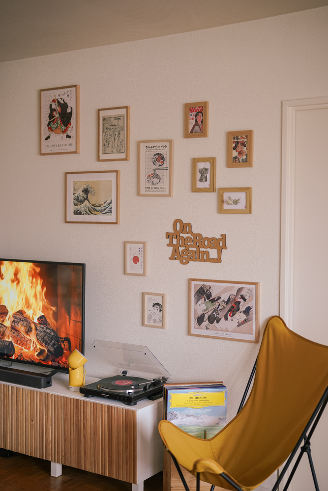 L’une des forces de cet appartement, est sa luminosité. Nous avons voulu jouer avec cet atout en apportant des touches de couleur à travers des éléments de décoration soigneusement choisis. Contrairement à notre ancien appartement où la palette était plus neutre, nous avons cette fois-ci misé sur des cadres muraux inspirés de l’art japonais, dénichés sur Gallerix.