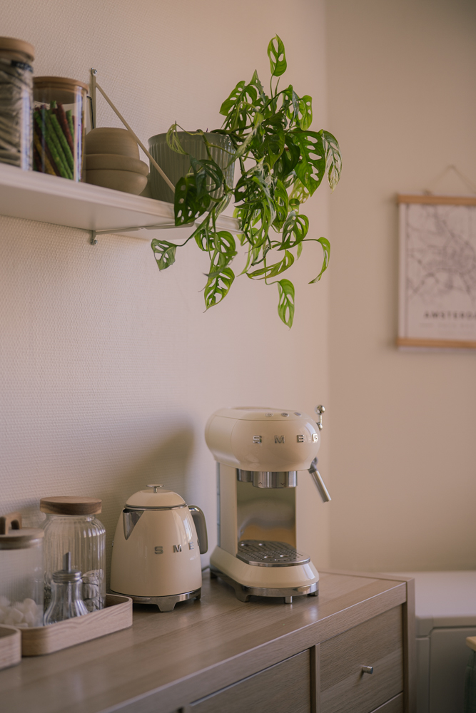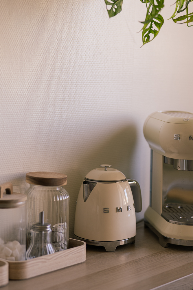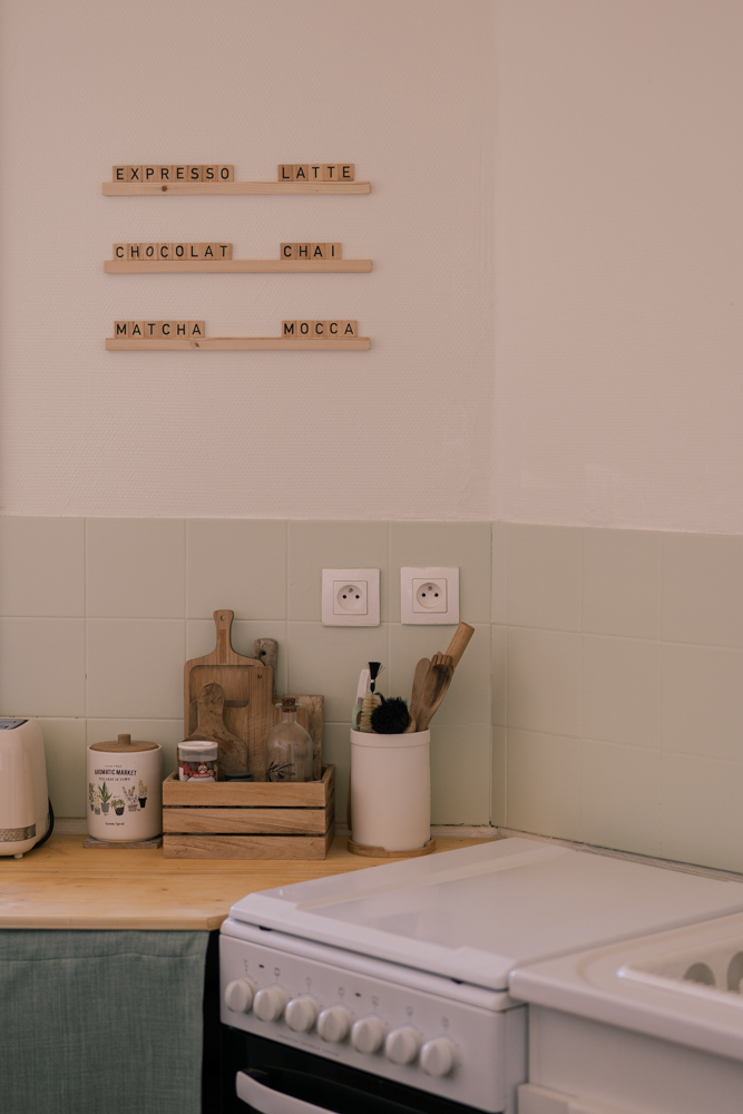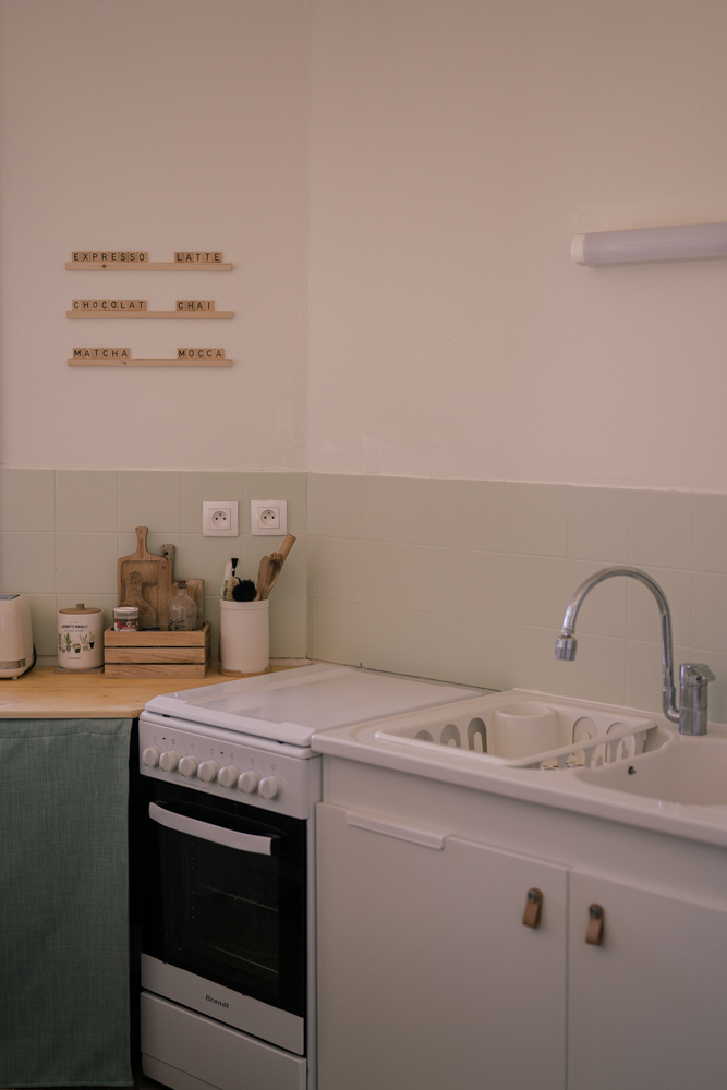 Dans la cuisine, nous avons repris les codes couleurs de notre ancien appartement en repeignant la crédence en verre sauge, une teinte douce qui apporte une touche moderne et intemporelle.