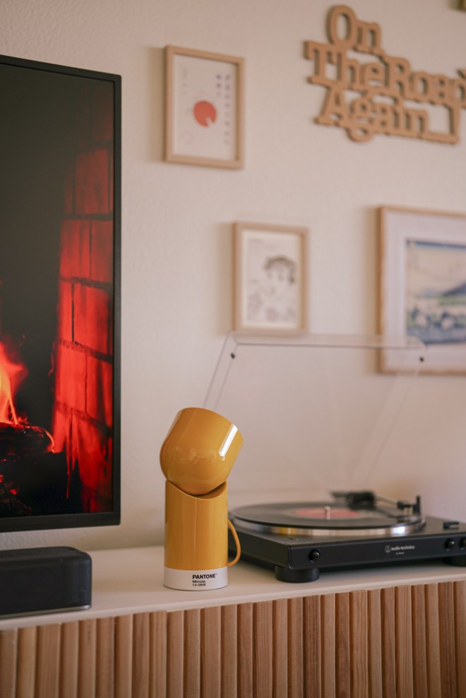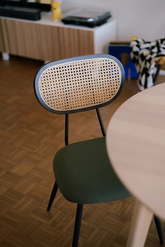 Parmi les éléments qui apportent du caractère à notre intérieur, il y a cette petite lampe jaune Lexon Design, qui est rapidement devenue l’une de mes pièces préférées. Son design minimaliste et sa couleur vive contrastent joliment avec les tons plus doux de l’appartement. Autre coup de cœur : nos chaises en rotin kaki, trouvées sur Amazon, qui ajoutent une touche chaleureuse et naturelle au salon. Enfin, on a aussi aménagé un petit coin détente avec notre fauteuil papillon jaune de chez Lafuma Mobilier. Son design intemporel et sa couleur solaire apportent une touche de peps à la pièce tout en restant hyper confortable.