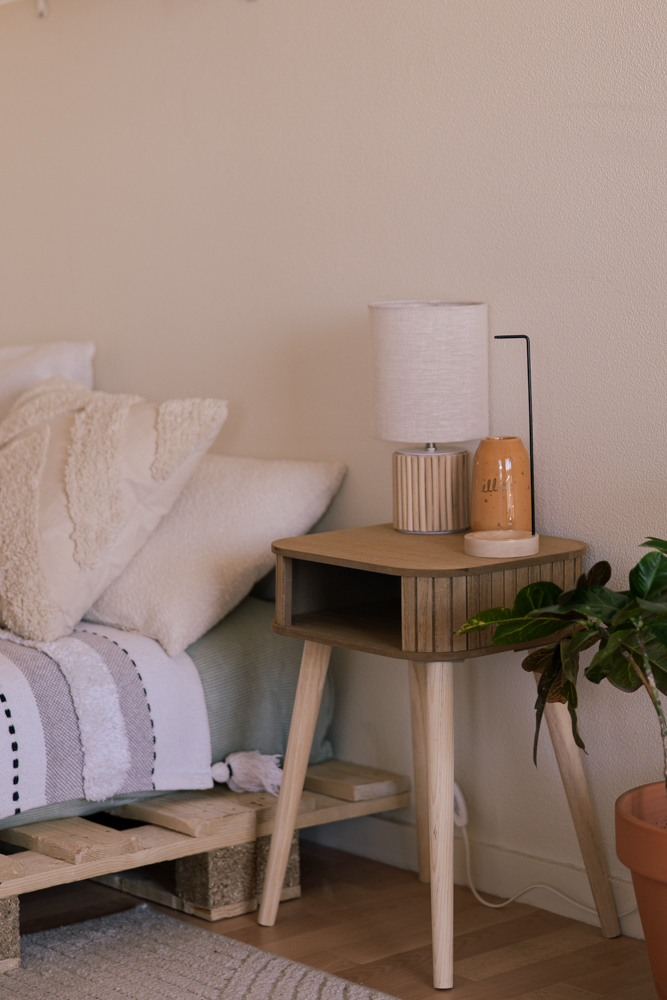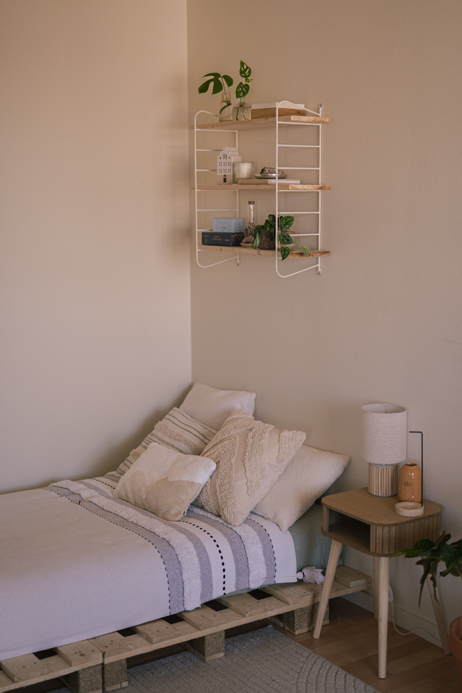 Pour mon bureau / chambre d’amis, j’ai voulu une décoration féminine et bohème, un univers qui me correspond totalement. C’est la pièce où je passe le plus de temps au quotidien, et il était essentiel qu’elle reflète mon univers. L’élément central de cette pièce, est notre lit en palette, que nous avons fabriqué nous-mêmes avec l’aide précieuse de Bricorama. L’enseigne nous a accompagnés à chaque étape de la rénovation et de la décoration de l’appartement : peinture, prêt de matériel, fabrication du lit en palette, mais aussi le choix du linge de lit et des rideaux. Grâce à eux, nous avons pu transformer cet espace en un vrai cocon, et on voulait vraiment les remercier pour ça !