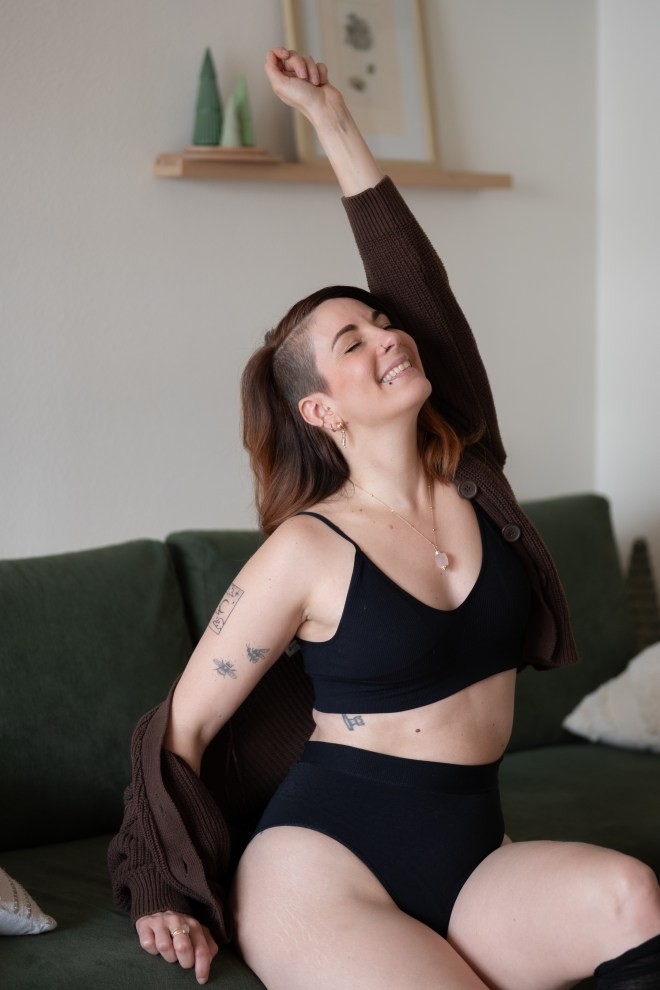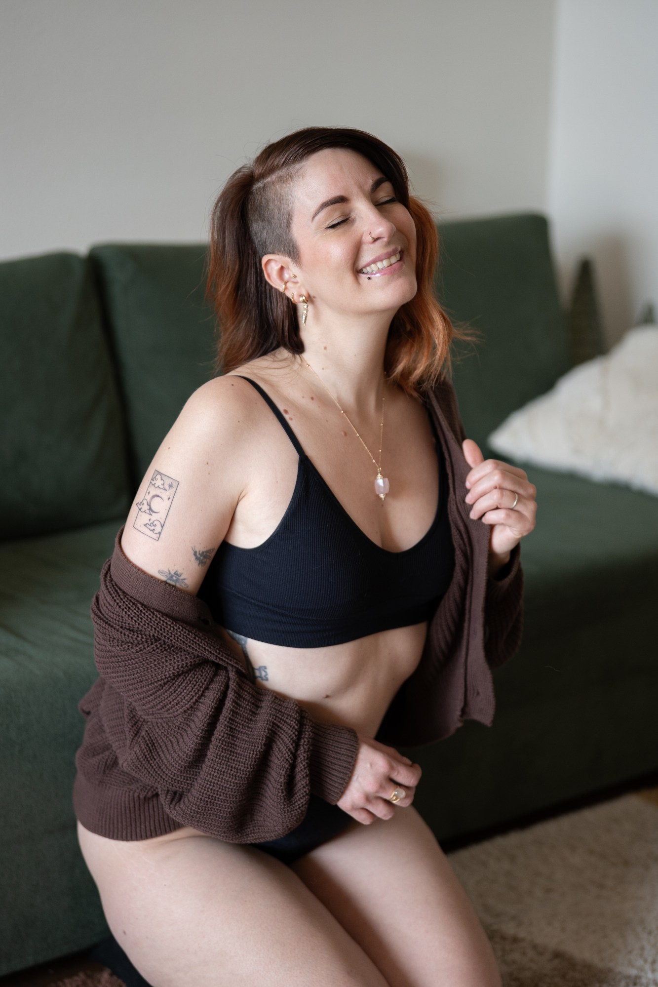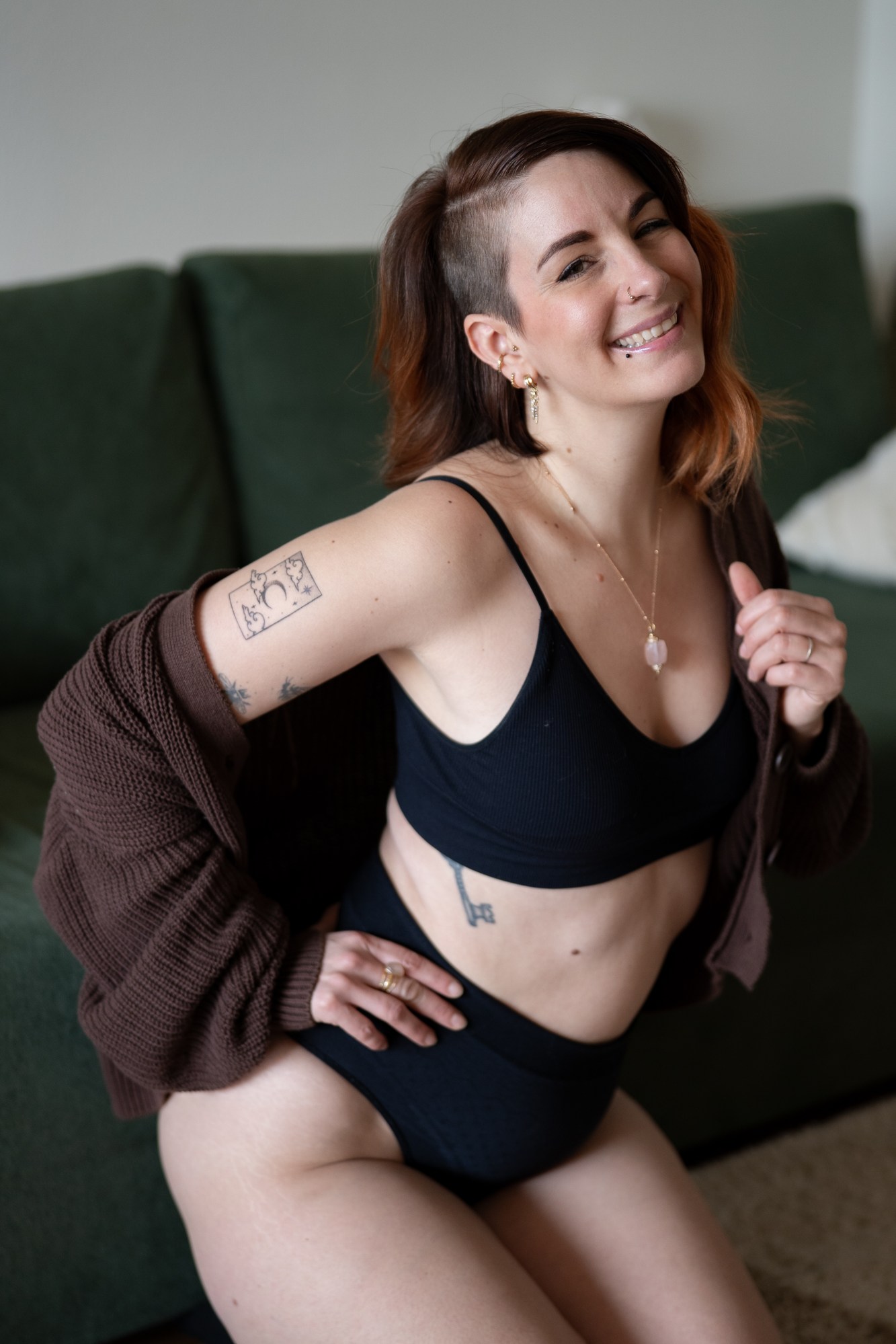 Pendant longtemps, je n’ai plus reconnu mon corps. Plus jeune, je faisais un 36. Je posais en tant que modèle photo, j’avais un corps que j’aimais, un corps dont j’étais fière. Et puis, avec les années, les problèmes de santé, les changements hormonaux et notamment la pose d’un stérilet, ma morphologie s’est complètement transformée. En seulement 3 ans, je suis passée d’un 36 à un 42.